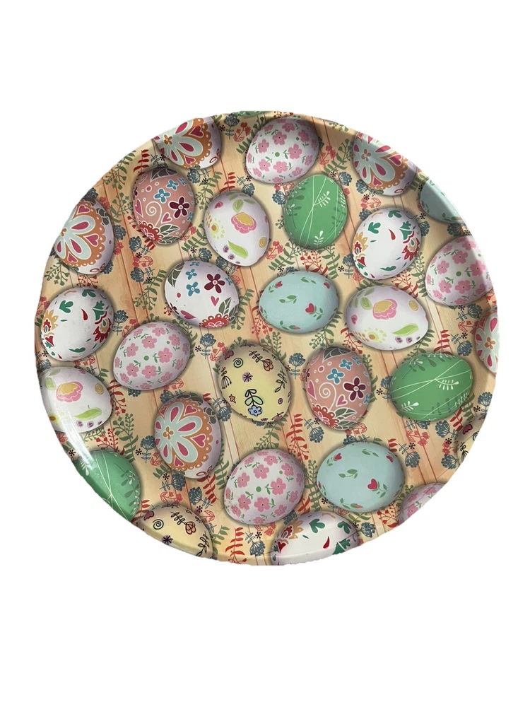 Add some festive touch to your Easter celebrations with this 13” Easter Egg Platter. Made of high-quality plastic, this round serving tray features an all-over multicolor pattern of decorative eggs, making it perfect for serving up some Easter snacks. The tray is dishwasher safe and has a high gloss finish for added elegance. Measuring 1/2 inch in height and 13 inches in length and width, this large platter is perfect for hosting an Easter brunch or dinner. This tray is a great addition to your holiday decor!