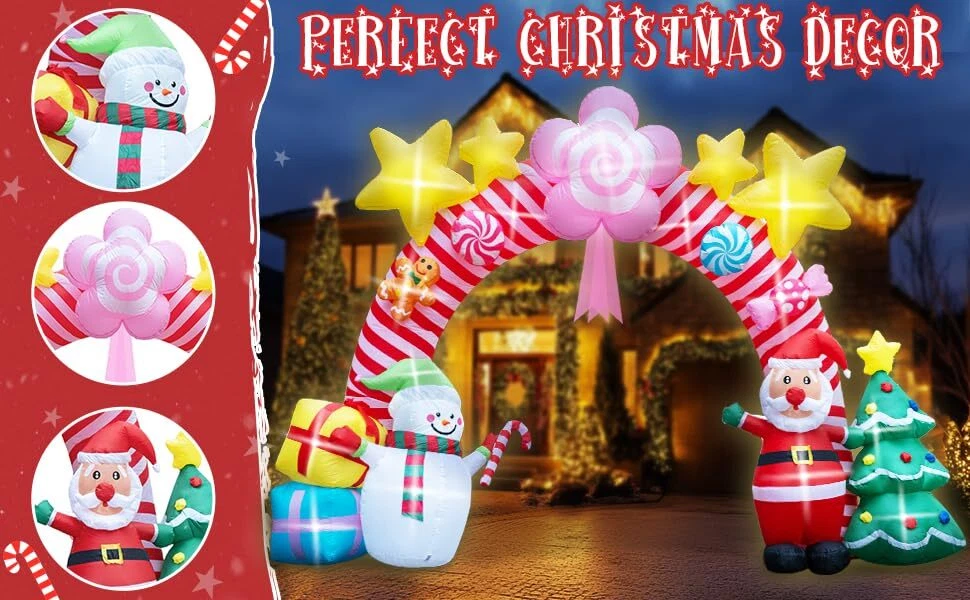 🎄 Large Christmas Inflatable Arch: Standing at an impressive 9.5 feet tall and 13 feet wide, this unique Christmas candy inflatable archway brings a festive spirit to your home and yard. It’s the perfect addition to your outdoor Christmas décor, creating a stunning focal point that will delight guests and passersby alike. ☃️ Creative Design with Multiple Christmas Elements: Exclusively designed for Christmas, this inflatable features a delightful archway adorned with pink candy shapes, elegant ribbons, playful gingerbread people and glittering yellow stars at the top. Underneath the arch, charming holiday characters like Santa Claus, snowmen stand alongside gift boxes and a decorated Christmas tree, capturing the joyful essence of the season. Perfect for adding a touch of fun and whimsy to any setting! ✨ Joyful LED Lighting: Add a magical glow to your holiday nights with built-in LED lights that bring the candy archway to life. The soft lighting creates a warm, inviting atmosphere, making it perfect for evening gatherings, family Christmas parties, or simply enhancing your yard’s holiday charm. It’s especially appealing to children, turning your yard into a festive wonderland they’ll love! 💖 Easy Setup with Powerful Air Blower: Setting up your holiday decorations is hassle-free with the included high-power built-in 2A air blower and 1.5A power adapter. Simply plug it in, zip it up, and watch it inflate in minutes. The package also includes ground stakes, ropes, and water bags for secure setup, ensuring stability in any outdoor space. 🎅 Sturdy and Wind-Resistant for Outdoor Use: This Xmas candy arch inflatable is designed to withstand outdoor elements, with strong ground stakes, durable ropes, and water bags to keep it securely anchored. Whether it’s windy or calm, your inflatable Christmas tree carousel will stay upright and ready to spread holiday joy all season long.