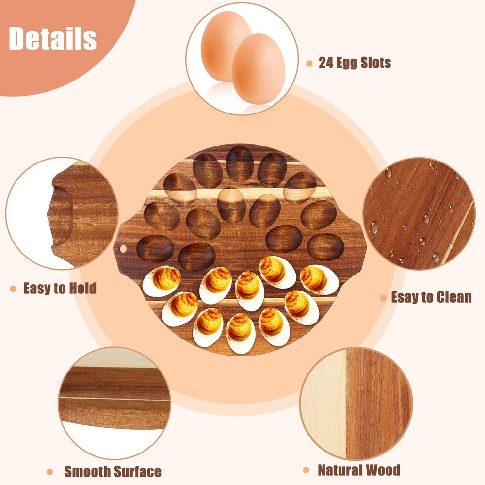 Acacia Wood Deviled Egg Platter with Handles, 13 Inch 24 Holes Deviled Egg Serving Tray, Round Egg Container Holder Reversible Charcuterie Board for Countertop Easter Chrismas Thanksgiving Acacia Wood Deviled Egg Platter with Handles, 13 Inch 24 Holes Deviled Egg Serving Tray, Round Egg Container Holder Reversible Charcuterie Board for Countertop Easter Chrismas Thanksgiving Product Overview Acacia Wood Deviled Egg Platter with Handles, 13 Inch 24 Holes Deviled Egg Serving Tray, Round Egg Container Holder Reversible Charcuterie Board for Countertop Easter Chrismas Thanksgiving Key Features Large Capacity: Our deviled egg platter, crafted from thick, premium Acacia wood, is a masterpiece of design and functionality. Measuring 13 inches in diameter with a substantial thickness of 0.8 inches, it boasts 24 precisely carved slots for your deviled eggs. The addition of handles on either side ensures easy handling, making it a convenient and stylish addition to your serving ware collection Premium Wood: Our deviled egg tray is made with premium Acacia wood, this platter stands out for its long-lasting and ease of maintenance. The solid construction not only promises long-lasting use but also makes cleaning a breeze. Its natural wood finish enhances its beauty, making it a practical yet elegant choice for any occasion Versatility Design: Versatility is at the heart of this deviled egg platter's design. With the ability to be used on both sides, it doubles as a ideal charcuterie board on the flip side, ideal for slicing vegetables or displaying bread and other food items. This feature of egg trays for deviled eggs adds incredible value, offering multiple uses in one sophisticated piece Aesthetic Centerpiece: Embrace the art of presentation with our dual-purpose deviled egg container. Its elegant design is matched by its practicality, serving not just as a platter but also as an aesthetic centerpiece for your table. Whether it's a casual family meal or a special celebration, this deviled egg holder allows you to serve your culinary creations in Practical Gift:: Looking for a thoughtful and practical gift? Our deviled egg platter is a fantastic choice for holidays Easter, Thanksgiving, and Christmas. Its unique blend of beauty, functionality, and long-lasting makes it an ideal gift for the foodies in your life, adding sophistication to their kitchen. Suitable for special occasions, this deviled egg carrier promises to be a cherished addition to any celebration Return Policy ⦿ Items can be returned within 30 days. Contact us through eBay messaging for return instructions. ⦿ We guarantee 100% satisfaction. Any issues will be resolved promptly. ⦿ Free shipping and returns with a 30-day money-back guarantee. ⦿ Please contact us for the return shipping address. Shipping Information ⦿ We ship to the address provided on eBay. Please ensure it is accurate. ⦿ Standard delivery time is 3-5 business days. ⦿ We use reputable shipping services such as UPS, FedEx, and USPS. ⦿ Currently, we ship only within the 48 contiguous states of the USA. ⦿ For any shipping concerns, feel free to contact us. Customer Support ⦿ For any inquiries, please contact us via eBay messaging. We typically respond within 24 hours. ⦿ Customer satisfaction is our top priority. ⦿ If you encounter any issues, please contact us before leaving feedback, and we will do our best to resolve them. About Us We are dedicated to providing high-quality products at competitive prices, ensuring that our customers receive the best value. Our team is committed to delivering exceptional customer service and a seamless shopping experience. With years of experience in the industry, we have established strong relationships with suppliers, enabling us to offer a diverse range of products. We continuously strive to expand our product selection and improve our services to exceed customer expectations. Our mission is to achieve 100% customer satisfaction by addressing any concerns promptly and effectively. Thank you for choosing our store. We look forward to serving you again and making your shopping experience delightful.
