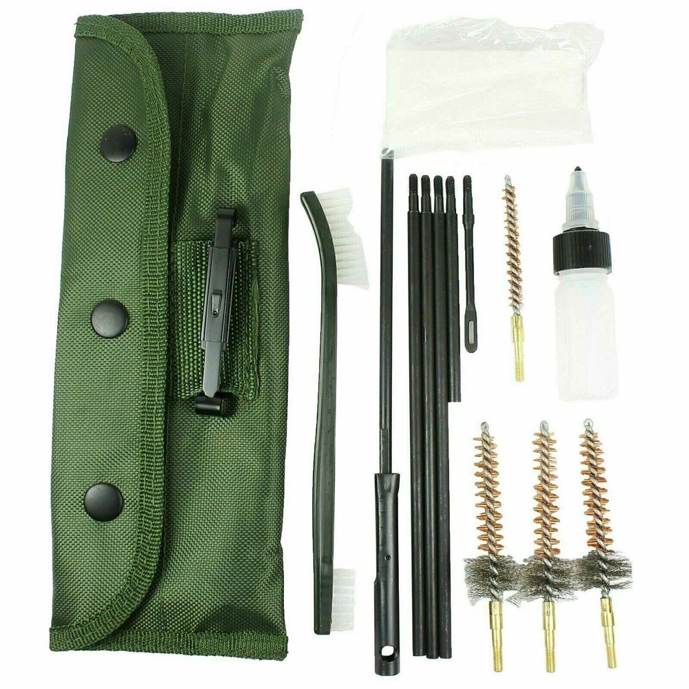 13 PCS .223 5.56 Rifle CLEANING KIT with 3 Bronze CHAMBER BRUSHES w/ Case Ideal for firearm cleaning 13 pieces of cleaning tools with carry pouch perfect for all .223 / 5.56 rifles Durable and non-scratching picks, ideal for reaching smaller openings Non-scratching Nylon brushes Suitable for other uses: automobile, hobby, and crafts Any rifles that is .20 - .25 caliber can be cleaned Can also clean the metric equivalents such as 5.56mm, etc Two extra brass and stainless steel chamber brushes are included in this kit Specifications Dimension: Pouch: 10 inch x 3.75 inch | Rod: 18.7mm (L), 9mm (S) Weight: 10 oz Items Included Three (3) .22 cal Brass Chamber Brushes One (1) .22 cal Brass Bore Brush Three (3) Long Rifle Rods One (1) Short Rifle Rod Two (2) Patch Holder One (1) Plastic Twist Top Bottle for Oil / Solvent (Oil not included) One (1) Double End Nylon Brush One (1) Bag of Cleaning Tissue One (1) Green Storage Pouch