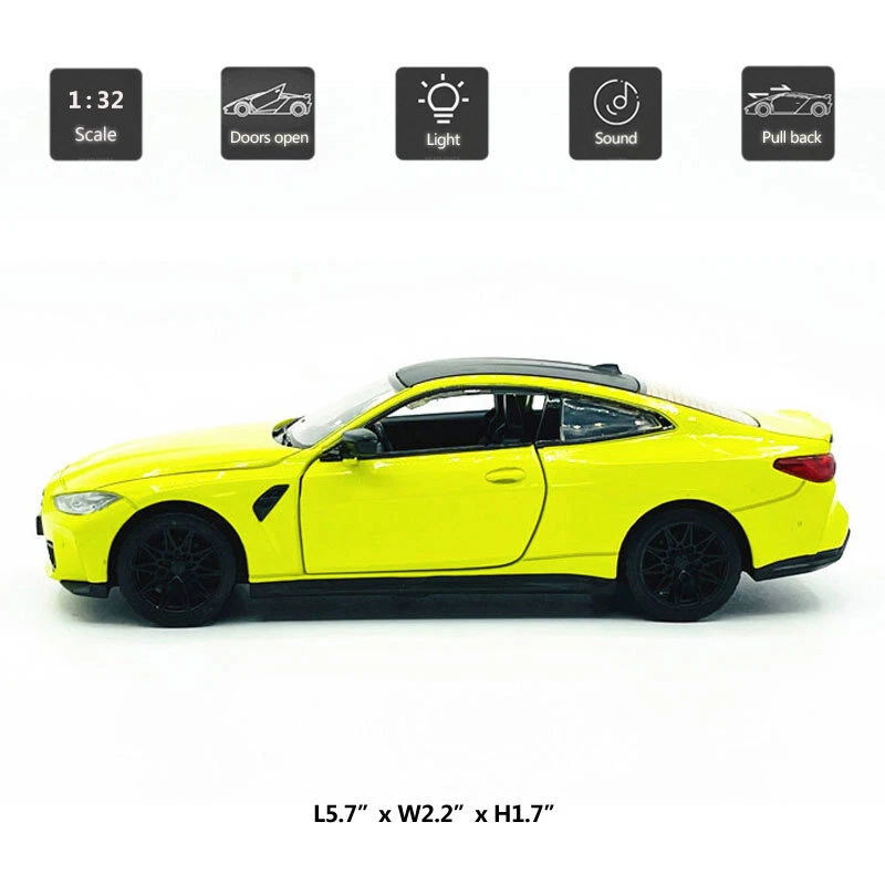1/32 Scale BMW M4 (G82) Model Car Diecast Vehicle Toys for Kids Gift Collection Item Type Diecast & Toy Vehicles Scale 1:32 Material Diecast and ABS Color Yellow and green, as picture shows Dimension About L5.7" x W2.2" x H1.7" (L14.6 x W5.5 x H4.3 cm) Vehicle Type Coupe Function *Pull back *Two doors can be open *Press the car or open the door, it will make sound and light Package Packed in original color box, in excellent condition Power 3 x AG13/LR44 button cell, power is just for light and sound Tips *Great choice of gift for kids, especially for Birthday, Christmas and New Year Gift *Great item for collector, business gift, home decoration, office decoration Warning Don't put in mouth/Keep Away from Fire/Not for Children under 3 Years Notice Due to manual measurement, please allow a little error Package include 1 x 1:32 Scale BMW M4 (G82) Model Car (Batteries Not Included) Payment Delivery details Terms of sales Payment We accept paypal only. Delivery details We ship orders within 24 hours upon receipt of payment. Terms of sales We provide great products and service. If you have any problems with the order,please do contact us before leaving negative feedback and opening case on eBay.