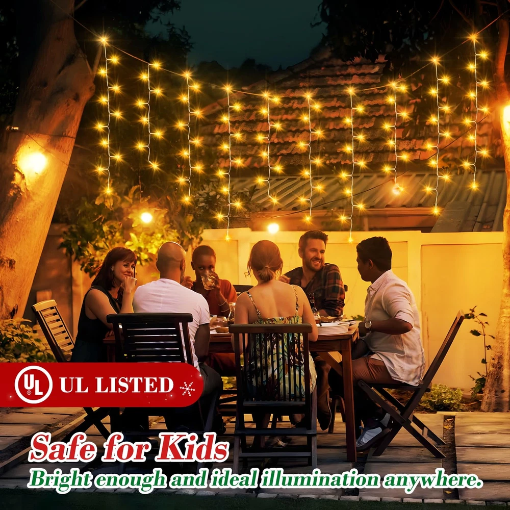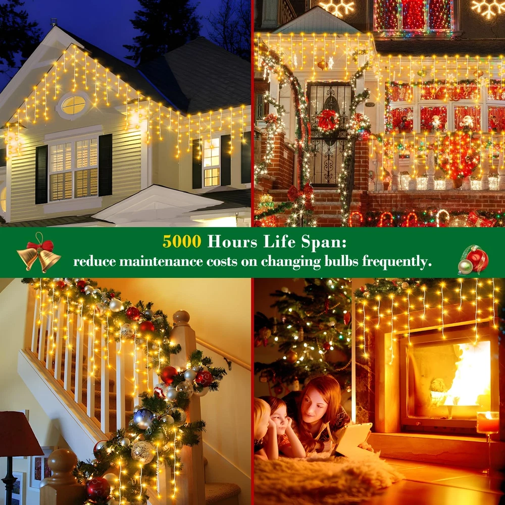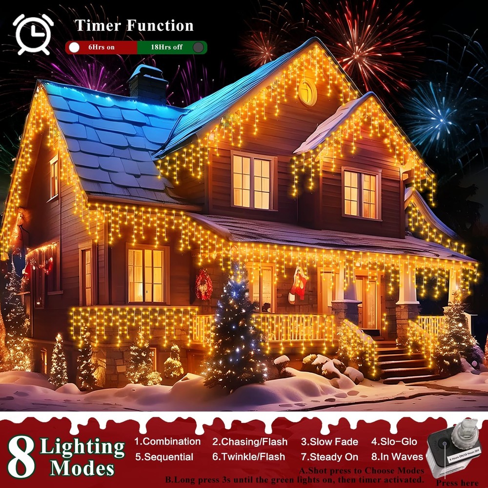 Christmas Decoration Ice Lights: These Ice String Lights are 132ft long with 240 drops, and they feature 1280 quality crystal clear led lights.HANGING FROM ROOF LINES, PORCHES FENCES AND RAILINGS,IT WILL INSTANTLY TRANSFORM YOUR DECORATED SPACE INTO FUN, RELAXING, COZY AND FESTIVE. 8 Lighting Modes: You can choose from 8 different lighting modes (Combination, In Waves, Sequential, Slo-glo, Chasing/Flash, Slow Fade, Twinkle/Flash, and Steady On.) for an extra festive display.CUSTOMIZE YOUR OWN MOOD LIGHTING,MAKING THE HOLIDAYS SPECIAL THIS YEAR WITH SOME BRIGHT LIGHTS AND COLORFUL CHEER. Timer and Memory Function: The outdoor Christmas lights built in timer function:6 hours on 18 hours off.Memory function can recover from the previous setting mode when you restart. Plug the led outdoor christmas lights into an outdoor timer, preferably one that automatically turns on when it gets dark out. UL Listed For Outdoor: brand Christmas fairy string lights are IP44 waterproof and built to stand up against harsh environmental elements while maintaining safe connections.NOVEL AND CLASSIC DESIGN,IT’S PERFECT FOR DECORATING CHRISTMAS,NEW YEAR,ANNIVERSARY, BIRTHDAY ,VALENTINE'S DAY, WEDDING,ETC. High-End Christmas lights: The 8 modes are carefully designed to provide a variety of choices while greatly reducing energy consumption. The timer function precisely controls the time of use, realising the efficient use of energy and contributing to sustainable development.