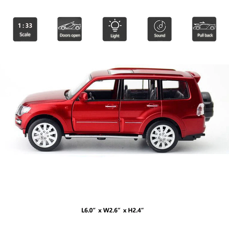 1/33 Scale Mitsubishi Pajero SUV Model Car Diecast Vehicle Toys for Kids Gift Item Type Diecast & Toy Vehicles Scale 1:33 Material Diecast and ABS Color Red, black and silver, as picture shows Dimension About L6.0" x W2.6" x H2.4" (L15.0 x W6.5 x H6.0 cm) Vehicle Type SUV Function *Pull back *Press the car or open the door, it will make sound and light *Two doors, engine cover and back door can be open Packing Packed in original color box, in excellent condition Power 3 x AG13/LR44 button cell, power is just for light and sound Tips *Great choice of gift for kids, especially for Birthday, Christmas and New Year Gift *Great item for collector, business gift, home decoration, office decoration, display Warning Don't put in mouth/Keep Away from Fire/Not for Children under 3 Years Notice Due to manual measurement, please allow a little error Package include 1 x 1:33 Scale Mitsubishi Pajero Model Car (Batteries Not Included) Payment Delivery details Terms of sales Payment We accept paypal only. Delivery details We ship orders within 24 hours upon receipt of payment. Terms of sales We provide great products and service. If you have any problems with the order,please do contact us before leaving negative feedback and opening case on eBay.