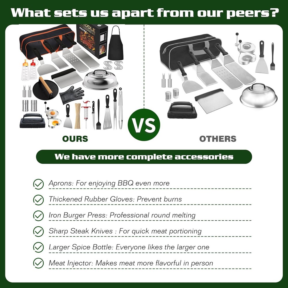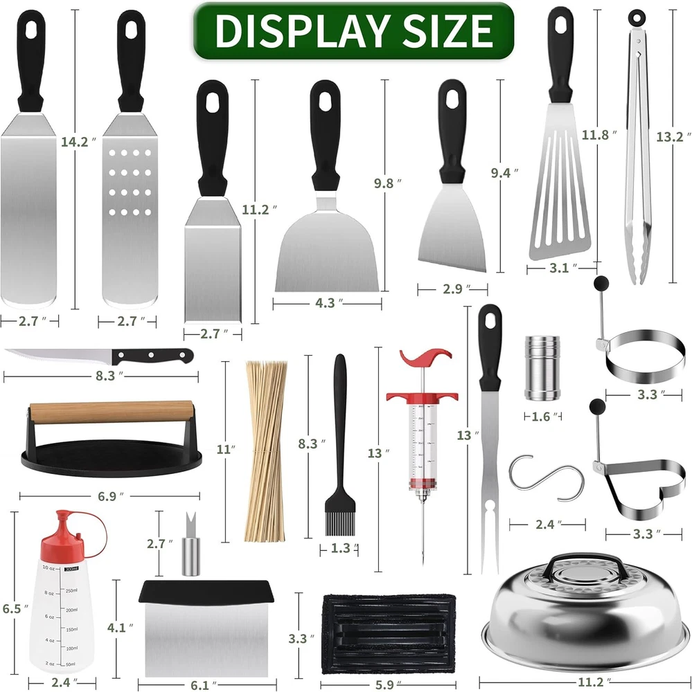 134 pcs practical griddle accessories kit includes Long griddle spatula, Short griddle spatula, Slotted spatula, Slant Edge Scraper,basting cover,Grill Turner,Burger Press, exclusive apron,silicone glove,meat injector,fish turner, meat knife,Griddle Chopper,Grill Tongs,Grill Fork,Basting Brush, 2 Squeeze Bottle, 2 Egg Rings, 2 Spice Shakers,2 corn fork,8 Hanging Hooks,100pcs bamboo skewers,Cleaning Brush,high-quality storage bag and a beautiful package box. Premium Quality: Our 134pcs Griddle Accessories Kit is crafted with heavy gauge stainless steel, ensuring durability and long-lasting performance. You can trust that our BPA-free, rust-resistant, and durable tools won't crack or melt with long-term use. Say goodbye to flimsy tools that bend or break easily during outdoor grilling sessions. Hassle-Free Cleaning& Storage & Carry: With its easy-to-clean feature and dishwasher-safe materials, this kit takes the hassle out of post-grilling cleanup. Each tool can be placed in an orderly manner and better protected in the compact storage bag. PROFESSIONAL GRIDDLE TOOLS:We have a very complete line of BBQ tools, not only the essential grill tools for chefs, but also heat-resistant gloves, aprons, meat injector, a hundred bamboo skewers, etc. It will make everyone happy at your BBQ, weeknight party or everyday meal! Perfect Choice: This practical barbecue tools set with beautifully designed package box is ideal accord choice for Fathers Day, Thanksgiving or Christmas。Whether for a passionate grilling enthusiast or a camping aficionado, this comprehensive accessories kit makes for an ideal accord. All your patio, outdoor and camping BBQ's, weekend parties or everyday dining needs can be met.Please clean the tool promptly after use, and do not leave any water stains on the tool to avoid damage.