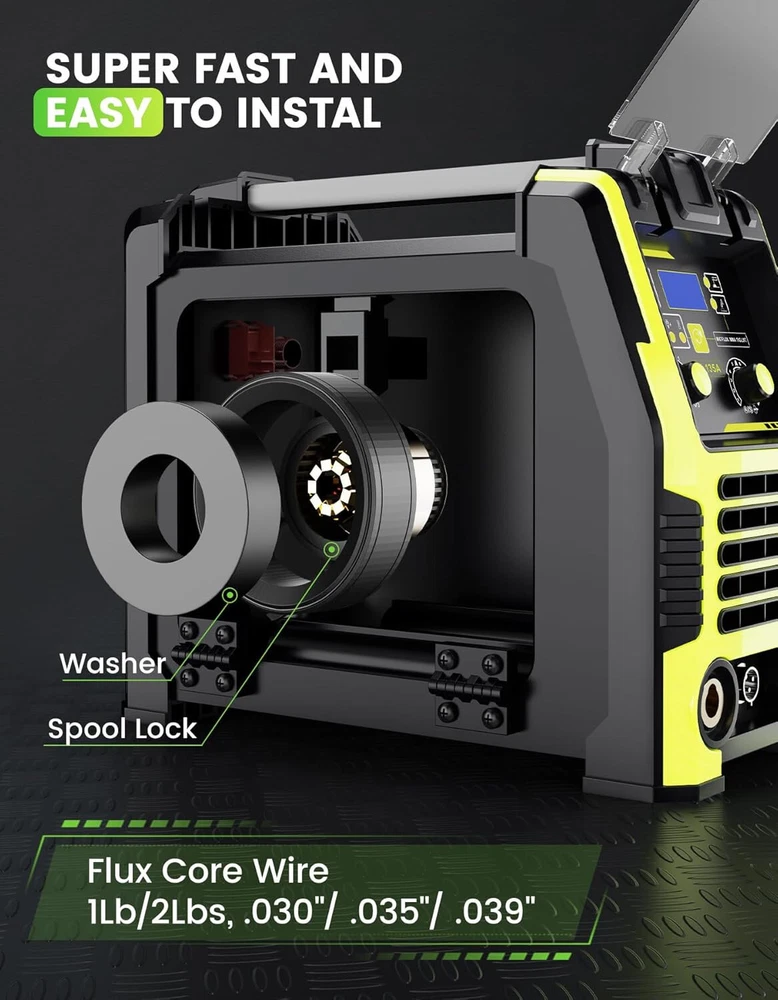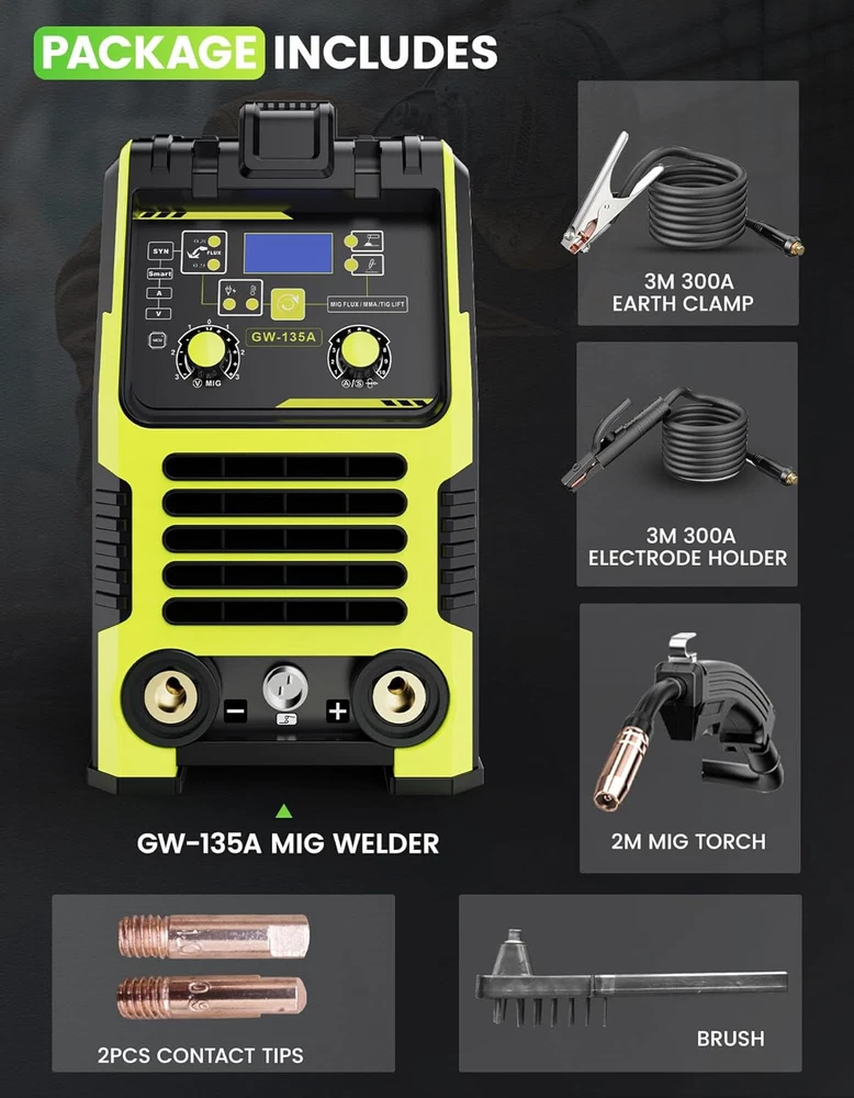 Powerful MIG Welding Machine: The versatile welder offers Three Modes, Flux Core Gasless MIG, Lift TIG, and MMA, suitable for various welding tasks. It provides a maximum output of 135 amps, supports gas-less flux-cored MIG wire, and handles wire sizes of 0.030", 0.035", and 0.040". With adjustable current and a 10-speed variable feed control, it ensures precise welding on carbon steel, stainless steel, and thicker materials. Synergic Control: The 3-in-1 MIG Welder employs advanced IGBT technology to automatically calibrate the recommended current and wire feed speed based on the selected welding wire diameter. This automatic adjustment simplifies the welding process, ideal for beginners and performing small repairs at home. Additionally, it can be fine-tune the voltage within a ±3 V range using the adjustment knob, ensuring that the MIG welder is versatile for both novices and experienced welders. Safe&Intelligent Design: Featuring overheat and overload protection, the 110V MIG welder automatically shuts down when it becomes too hot. A built-in fan continues to cool the unit for 1-2 minutes after shutdown, minimizes energy loss, ensuring efficient operation. Digital Screen Display: This 135A MIG Welding machine integrates advanced technology with an LED digital screen that displays voltage, current, and other parameters. This allows you to monitor and adjust settings in real-time without removing your helmet, enhancing efficiency and precision. Portable and Compact: The flux core welder combines high performance with a multi-application design in a compact 14 x 11 x 6 inch frame, weighing only 12 lbs, is highly portable, featuring a handle or shoulder strap for easy transportation. Wide Application: The Greenmagic wire welder is versatile, suitable for machinery manufacturing, sheet metal processing, automotive maintenance, iron processing, hardware work, and home DIY projects. It effectively welds mild steel, iron, stainless steel, and other metal materials.
