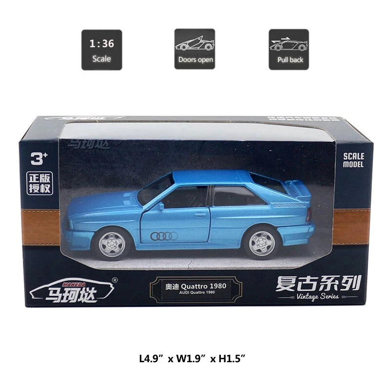 1:36 Audi Quattro 1980 Model Car Diecast Toy Cars Toys for Kids Boys Gifts Item Type Diecast & Toy Vehicles Scale 1:36 Material Diecast and ABS Color Red and blue, as picture shows Dimension About L4.9" x W1.9" x H1.5" (L12.5 x W4.8 x H3.8 cm) Vehicle Type Vintage Car Vehicle Year 1980 Function *Pull back *Two doors can be open Package Packed in original color box, in excellent condition Tips *Great choice of gift for kids, especially for Birthday, Christmas and New Year Gift *Great item for collector, business gift, home decoration, office decoration Warning Don't put in mouth/Keep Away from Fire/Not for Children under 3 Years Notice Due to manual measurement, please allow a little error Package include 1 x 1:36 Scale Audi Quattro Model Car Payment Delivery details Terms of sales Payment We accept paypal only. Delivery details We ship orders within 24 hours upon receipt of payment. Terms of sales We provide great products and service. If you have any problems with the order,please do contact us before leaving negative feedback and opening case on eBay.