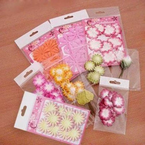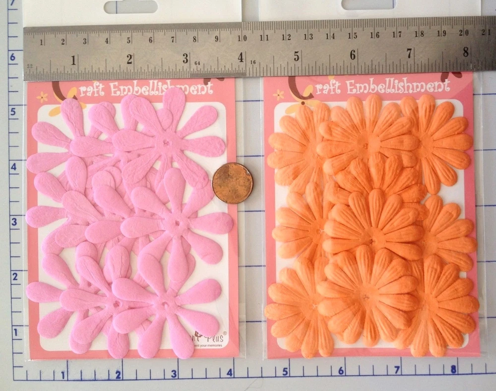 138-140 handmade mulberry paper colored flower petals and leaves. There are 10-20 flowers individually packaged by style. (**The packs may have a few over or under the numbers listed below.) The flowers range in size from approximately 3/4"-2" in size. Color may vary slightly on computer monitor and handheld devices to actual product. Mulberry paper is acid and lignin free and suitable for long lasting projects. Photo 2- Left quantity 10, diameter 1 1/2". Right quantity both 20 each, diameter 1 1/8". Photo 3- Left quantity 10, 2" wide. Right quantity 10, 1 7/8" wide. Photo 4- Left quantity 20, diameter about 1". Center quantity 10, 1 1/8" wide. Right quantity 20, 1" wide. Photo 5- Left quantity 10, 1 1/8" long leaf. Right quantity 10, about 1 1/4" long leaf.