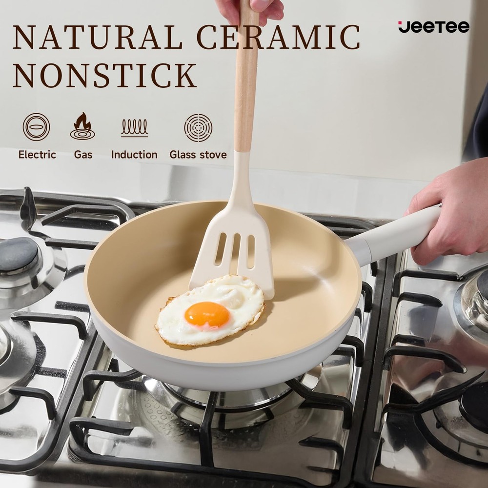Ceramic Cookware Set, 13 Pcs Pots and Pans Set Nonstick with Rotation Removable Handles, Healthy Non-Toxic Cooking Set for All Stoves, Stackable Pots Pans, Oven Safe, PFOA/PFOS Free, Cream What's Included: 3-quart saucepan with lid, 9.5-inch frying pan, 4.7-quart sauté pan with lid, 4.7-quart casserole with lid, 2 silicone utensils, 4 pot protector. Perfect Size for a 2-5 people family, meeting your cooking needs for breakfast, lunch, and dinner throughout the day. Healthy & Safe Ceramic Cookware: Our 13pcs ceramic cookware sets use natural ceramic material, which is 100% cadmium-free, PFOA-free, PFOS-free, and Lead-Free. Our ceramic pots and pans set ensures your daily cooking is always safer and healthier. Saving Space Design: Saving 70% of space with an easy-swivel removable handle compared to regular pans. You can easily remove the handles, neatly stack all the pots and pans, and place the pot protector between each pot to prevent scratches, then they can be easily placed in the cabinet. Support Oven Use: This ceramic pot and pan set can be used in the oven up to 450°F, you can use them to bake, roast, and grill delicious food. Before placing them in the oven, please remove the handles and the lids first. Oil Polymerization Design: unique oil gathering pattern design at the bottom of the pot makes the food heat more evenly, uses less oil, reduces kitchen fumes, and improves cooking efficiency and food taste.