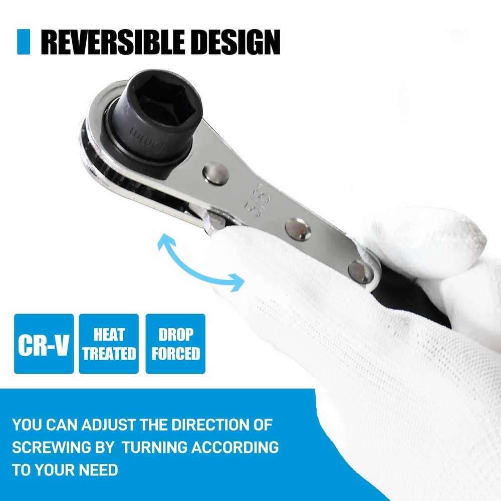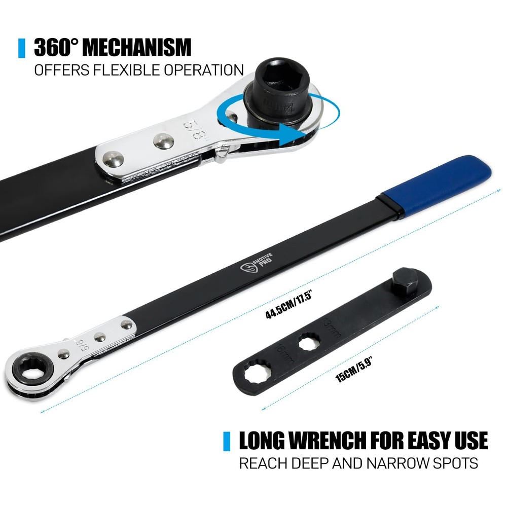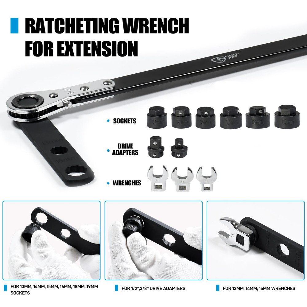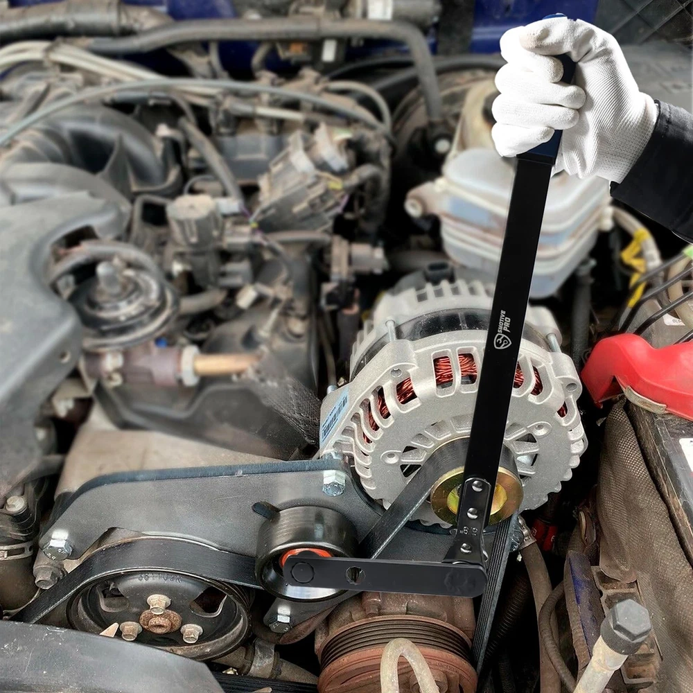 The Extended-Reach Ratcheting Serpentine Belt Tool Kit is a complete set made for removing and installing serpentine belts on vehicles with spring-loaded belt tensioner pulleys. The serpentine belt kit precisely positions idler pulleys and sets belts to the correct tension. The slim profile provides greater access in tight spaces, fitting where conventional ratchets and breaker bars won't. Professional Serpentine Belt Tool: This extended-reach ratcheting serpentine belt tool kit is designed for easy removal and installation of serpentine belts on vehicles with spring-loaded tensioners. It precisely adjusts idler pulleys and sets belt tension correctly Powerful Operation Force: With a 17.5-inch length and a 21-tooth reversible ratchet, this tool provides maximum leverage for tight spaces. The quick-lock button allows for swift socket and adapter changes, keeping them securely in place Multi-functional Extension Design: The 5.9-inch extension bar connects to the reversible ratchet wrench, offering flexibility in confined spaces. Its slim profile makes it easy to operate in areas where traditional ratchets and wire cutters cannot reach Increased Hardness: The ratcheting serpentine belt tool is made from Cr-V and carbon steel, while the 6-point sockets are crafted from Cr-mo and undergo full heat treatment to increase overall hardness, enhancing wear resistance for long-lasting durability Broadly Compatible Accessories: The set includes 6-point sockets (13mm to 19mm), crowfoot wrenches (13mm to 15mm), 3/8-inch and 1/2-inch drive adapters, a ratcheting handle, and extension bars, covering various vehicle configurations for comprehensive use