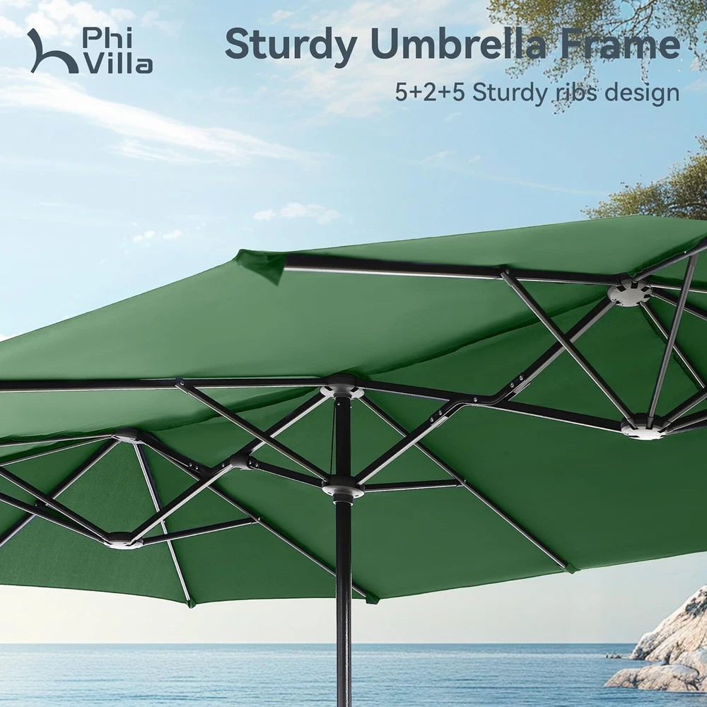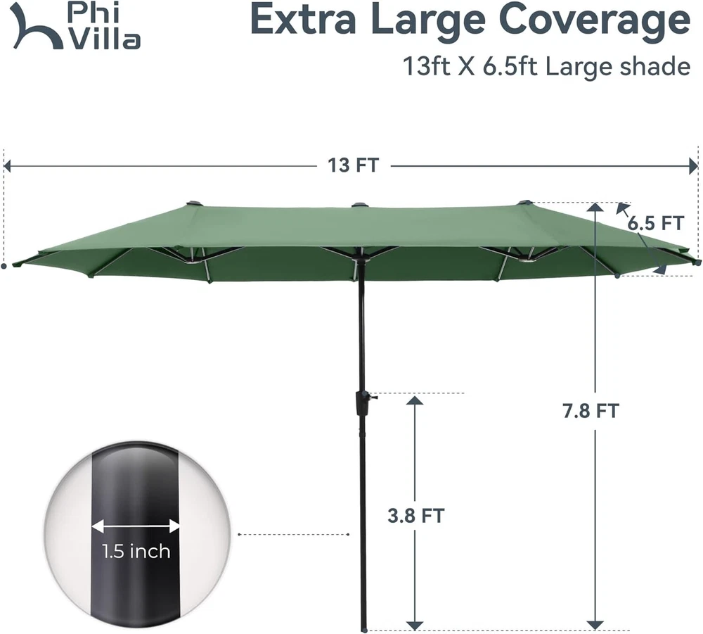 Patio Chair Patio Table Set of 2 Set of 3 Set of 5 Set of 6 Set of 7 Set of 8 Set of 9 Auction Other MENU Store Support Set of 2 Set of 3 Set of 5 Set of 6 Set of 7 Set of 8 Set of 9 Auction Other ▌ PRODUCT DETAILS: Double Canopy Umbrella: PHI VILLA 13ft double-sided patio umbrella provide wide coverage from the sun which is ideal for your family and friends at the courtyard, beach or swimming pool Easy to Use: With solid crank handle lift system for smooth and easy opening and closing. No base are included, lightweight and excellent for long table and chairs or side patio furniture set Durable Design: Superior strength and durability large umbrella with the rust-resistant steel pole and 12 steel ribs. Pole diameter: 1.5" 100% Polyester Fabric: Fade-resistant canopy, easy to clean and make your umbrella in classic and elegant apperance Dimensions: 13(L) x6.5(W) x 7.8(H) Feet; With high quality package in transit and 1 year warranty against manufacture defects; Note: Please close and tie up the umbrella when you don't want to use it, especially in windy and rainy days, so that its life is prolonged More Items About Us Welcome to our eBay store. We sale products about Home Garden,Home Organization,and Office Products. We are committed to your good buying experience from us. If you meet some problems or further questions,even some dissatisfaction with us,please give us a chance to solve the problem and offer you the best service,before leaving us a negative feedback. Meanwhile if you are satisfied with our products and service,please leave positive feedback with Four 5-Stars. Payment 1. We accept payment methods : PayPal, Payoneer, Visa, Master Card, American Express , Discover and Credit Card, etc. 2. We appreciate prompt payment and look forward to your business in the future. 3. Unpaid item will be filed without receiving payment in 7 days from listing ended. 4. If for some reason there is any issue with the purchase,please contact us prior to leaving feedback,and we will be glad to work with you to have it resolved. Shipping 1. We take great care packaging every item to ensure safe quality shipping. 2. We ship UPS/USPS/FedEx depending on your location and the shipping method you have chosen. 3. Most shipments are sent out within 1-3 business day after payment is confirmed or cleared,unless stated on otherwise in the listing. 4. Packages are not shipped on Saturday and Sunday. Transit time varies and depends on the carrier,we cannot be held responsible for delays caused by carriers. 5. Please make sure to provide the correct shipping address when placing your order,orders will be shipped out to the shipping address provided by eBay. 6. Shipping time by eBay is estimated and not guaranteed and is subject to change especially during peak periods. 7. Orders shipping to Hawaii,Puerto Rico,Guam or Alaska may not select the Free shipping option for this item,if free shipping is selected for one of these destinations we reserve the right to cancel your order. Returns 1. We offer a 30 day return policy on all items.(Unless stated otherwise in the listing). 2. All returns must be in original condition and must include the original packaging and content intact. 3. Returns should be packed in proper packaging to avoid damage to the item or it original packaging. 4. For any return request please contact our Customer Support by eBay Messages and you will be assigned an RMA number and instructions on how to proceed with your return. 5. Please allow 3-5 business days after we receive your package to process your return. 6. Any returns that violate this return policy will not be accepted and will be sent back at customers’ expense. Contact Us 1. If you have any questions or concerns about the product or the auction,please contact our customer service department via email or send us message on eBay my messages. We will give you a response in 24 hours. 2. All emails will be responded to within 12-24hours.