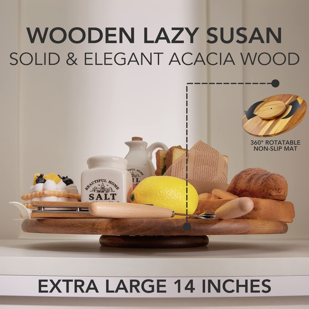 Acacia Wood Lazy Susan, Wood Turntable Tray Cabinet Organizer,14" Organized and Tidy Kitchen: This acacia wood lazy susan organizer measures 12/14" diameter x 1.18" height. Featuring a smooth 360 degree rotating design, this spice organizer can and organize baking supplies, condiments, sauce and spice jars on the kitchen countertop, to keep kitchen gadgets accessible and orderly, so you can quickly find what you need when cooking. This turntable organizer also can display decorations on your dining table for gatherings with family and friends. Smooth & Silent Rotation: This elegant lazy susan organizer rotates 360 degree and slides very smoothly without any noise. No worry about inclining or wobbling when putting something heavy on just one side. No assembly required. It can be served as a snack organizer for outdoor activities such as picnic, camping, RV, travel, etc. Wide Application: Besides being used as a kitchen spice organizer, our lazy susan turntable also can and organize flowers, essential oils, perfumes, cosmetics, skin care products, snacks, food jars, medicine bottles, etc., to make your bathroom, bedroom, dresser, living room, home office, craft or hobby room neat and clean. Natural and elegant acacia wood lazy susan turntable organizer can blend in with most cabinet interior and room decor. Durable & Safe: Crafted with premium 100% acacia wood, our lazy susan turntable is super sturdy with good moisture & water resistant performance, not easily to warp or crack due to acacia wood's high density and non-porous structure. Natural acacia wood, a kind of earth friendly and highly renewable resource, makes our lazy susan spice rack organizer healthy and safe for kitchen and home use. Easy Clean & Low Maintenance: Please wash our lazy susan cabinet organizer with mild soapy water, wipe down with a damp cloth, air dry. Oil the surface of lazy susan turntable organizer with food grade mineral oil about once a month, to keep acacia wood's natural moisture and grain. Your satisfaction is our #1 priority - 24/7 stands by.