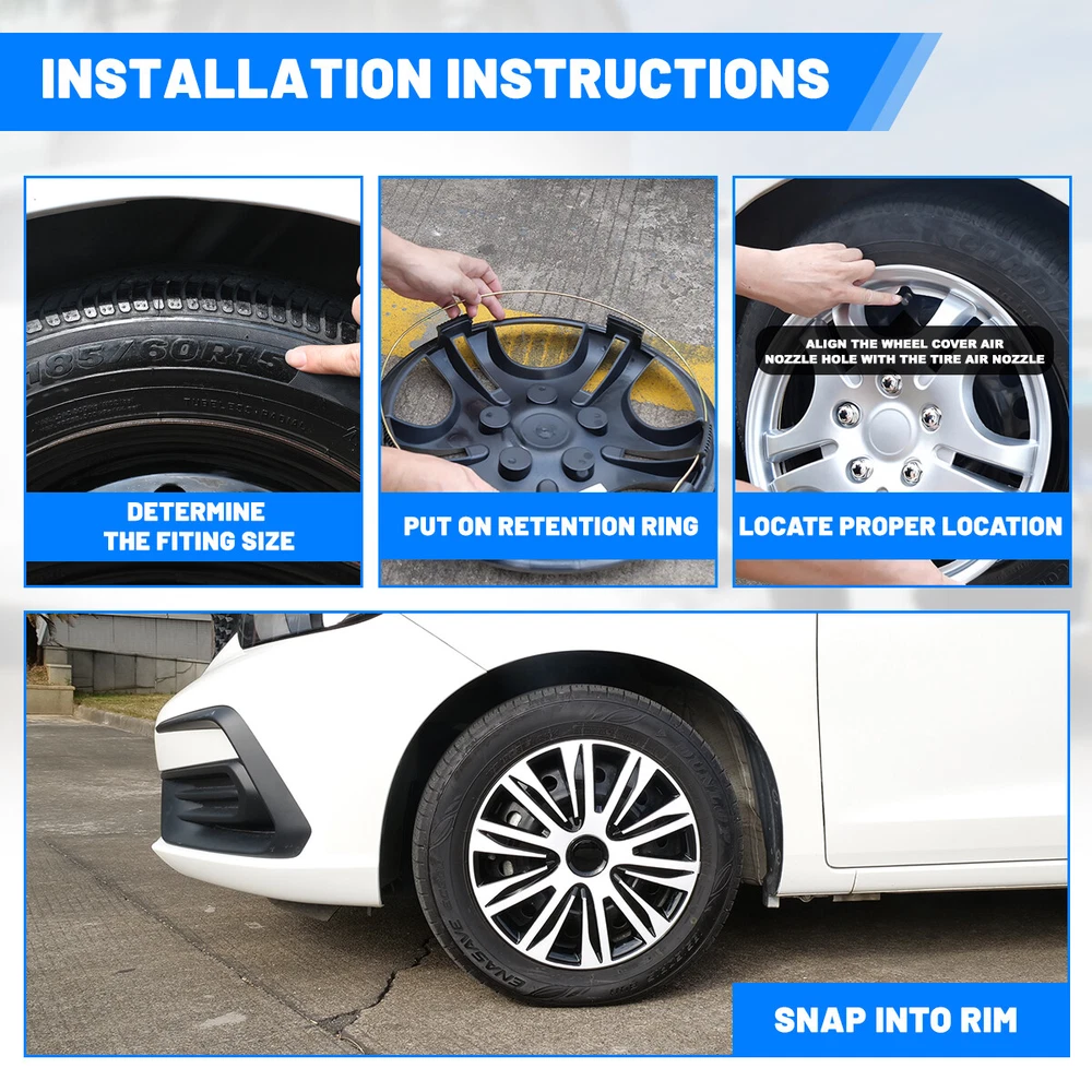 14" Black White Wheel Covers Snap On Full Hub Caps fit R14 Tire & Steel Rim 4PCS Feature: π Please ensure to check your tire/wheel size before purchase! designed for (p14) 14β stock steel wheels and will not fit over aluminum alloy wheels. π Designed from oem replica style wheelsβ for replacement with fast & easy snap-on installation - made from premium abs material β lab & road tested for performance and ultimate durability. π Adjustable retention rings assures firm grip gives support to the hubcaps making sure they stay in place. locate the curve on the retention ring and match to the tire air valve to install. π Installation instructions available - please refer to the images available as well as detailed instructions below for assistance. π Wolfx wheel covers fit most models of vehicle brands including acura, chevrolet, dodge, ford, honda, hyundai, kia, mazda, mitsubishi, nissan, subaru, toyota, volkswagen and more. Specification: Quantity: 4 PCS Material: ABS Color: White & Black Lacquer Wheel Size: 14 inch Finish: Glossy Placement on VehicleοΌFront/Left/Rear/Right Not fit for: 1991-2002 SATURN S SERIES COUPE 14 Inch Steel Wheel 1991-2002 SATURN S SERIES SEDAN/WAGON 14 Inch Steel Wheel 2000-2007 FORD FOCUS 14 Inch Steel Wheel 2000-2007 FORD FOCUS 14 Inch Spare Steel Wheel Package Includes: 4* Wheel Cover Hubcaps Payment Delivery details Terms of sales About us Contact us Payment π We accept PayPal (Recommended), credit card, VISA, Google Pay & Discover etc. π Please submit your payment within 7 days after your purchase. π If not, eBay will automatically open an Unpaid Item Dispute on our behalf if the item(s) are not paid within 7 days. Delivery details π Please double check your delivery address and contact information. π All items will be shipped within 1 business days after payment received. π Tracking numbers will be easily accessible ASAP they are created and processed. Terms of sales π Free 30 days Return, we will cover the return post fee. π If a defective product was received, please do not hesitate to message us via eBay message. π We will response in 24 hours in business to resolve the problem π We stand behind our products. Items can be returned for exchange or full refund within 30 days from the date you receive. About us π Wolfstorm has a huge warehouse and office located in the United States. π All US domestic 48 states customers are able to benefit from the FREE SHIPPING services. π Our experienced, professional customer service representatives offers prompt and courteous service. π Best quality products, outstanding services and professional experience keep our customers. Contact us π Please feel free to contact us if you have any problems. π Emails will be replied within 24 hours in working days. π After hours emails will be replied on the next business day. On Apr 16, 2025 at 22:39:33 PDT, seller added the following information: