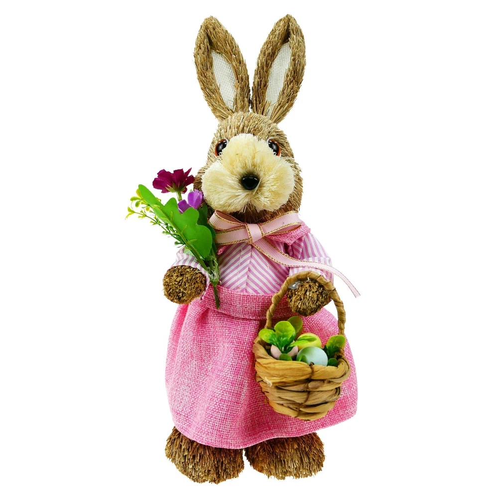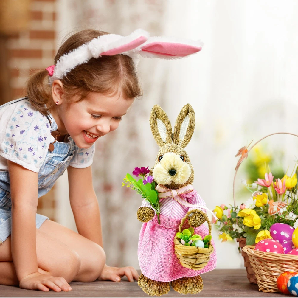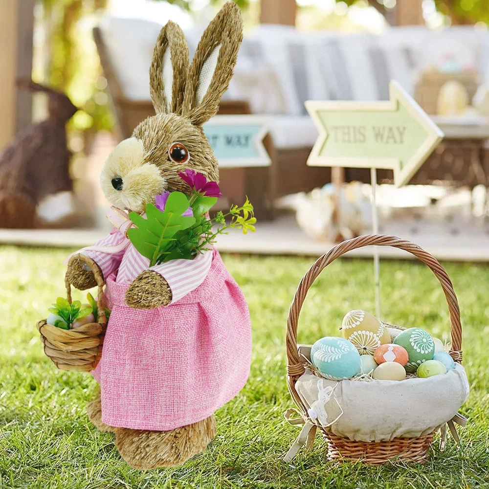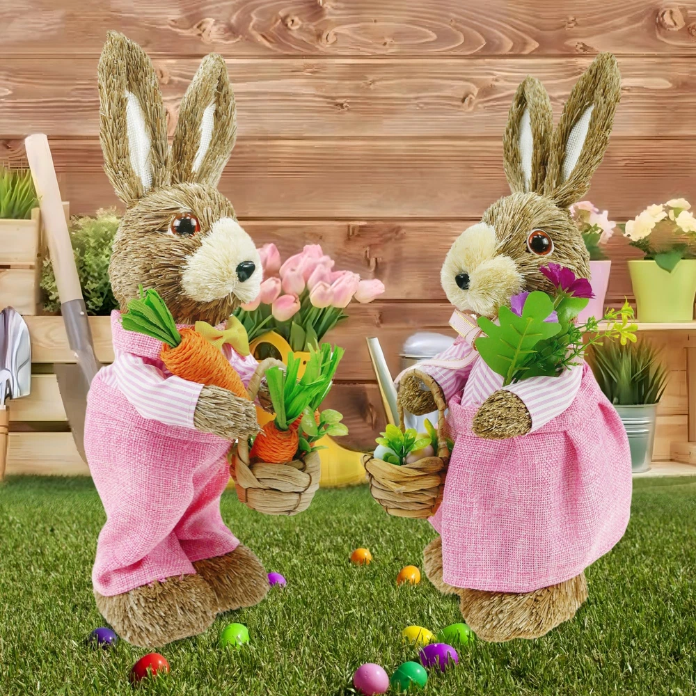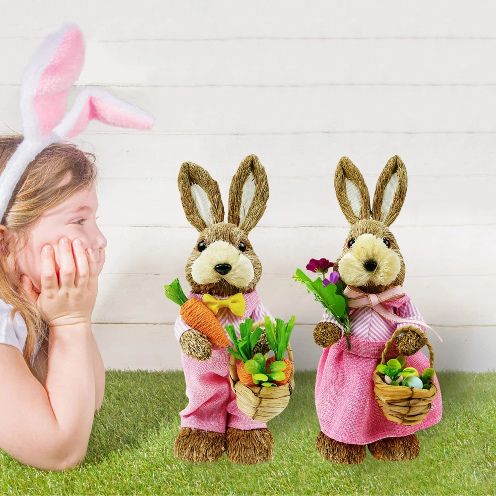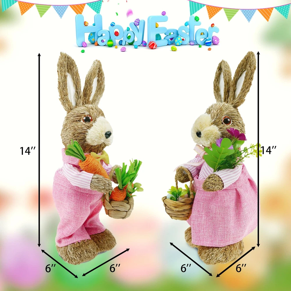Environmental Protection Materials: The surface material is straw, and inside material is foam. Safety and environmental protection, durable. Perfect Size: Elevate your Easter decor with this straw bunny figurines. Standing at a maximum height of 14 inches which is suitable for the perfect size of the table, windowsill, and shelves.It's a charming addition to any tabletop or tray, bringing warmth and joy to your home. Exquisite Modeling: This female bunny is wearing a skirt, holding an Easter bouquet in hand and a basket containing Easter bouquets and Easter eggs in the other. Each bunny figurine is designed to exude liveliness, bringing joy and vibrancy to your home. Environmental Protection Materials: These bunny figures surface material is straw and boast a high-quality foam interior for added durability. Environmentally friendly and safe for your home, these charming decorations are built to last and sure to bring joy to your springtime celebrations for years to come. Easter and Spring Decorations: It brings you the breath of spring and nature. Setting up in patios, gardens, homes, front yard, and back yard. Use them for Spring decor, Easter, Easter egg hunts, and table decorations. Whether as an Easter gift or for any other occasion, this bunny figurines set is a unique and heartwarming choice. Give your friends and family a distinctive gift that will add a touch of charm to their homes and celebrate special moments together. If you have any dissatisfaction with the product, you can the seller team, and we to provide you with satisfactory solutions