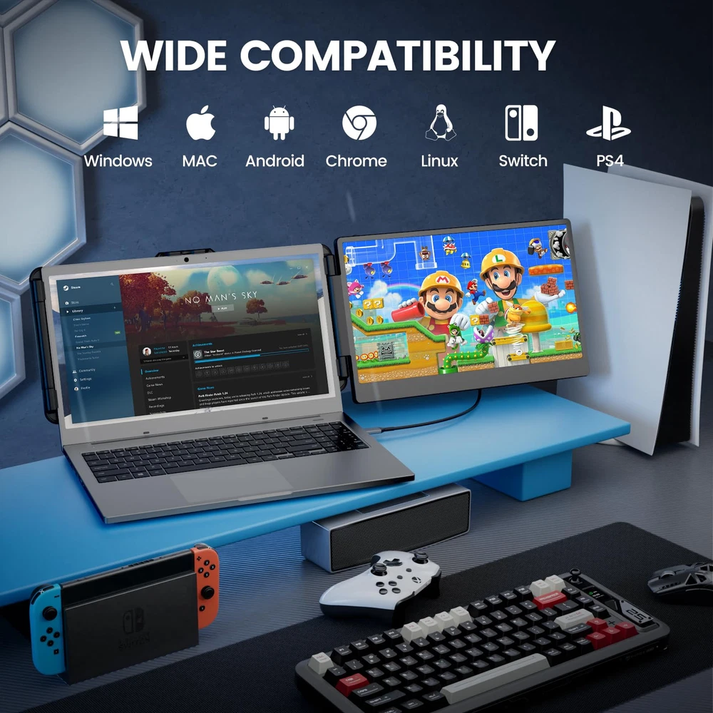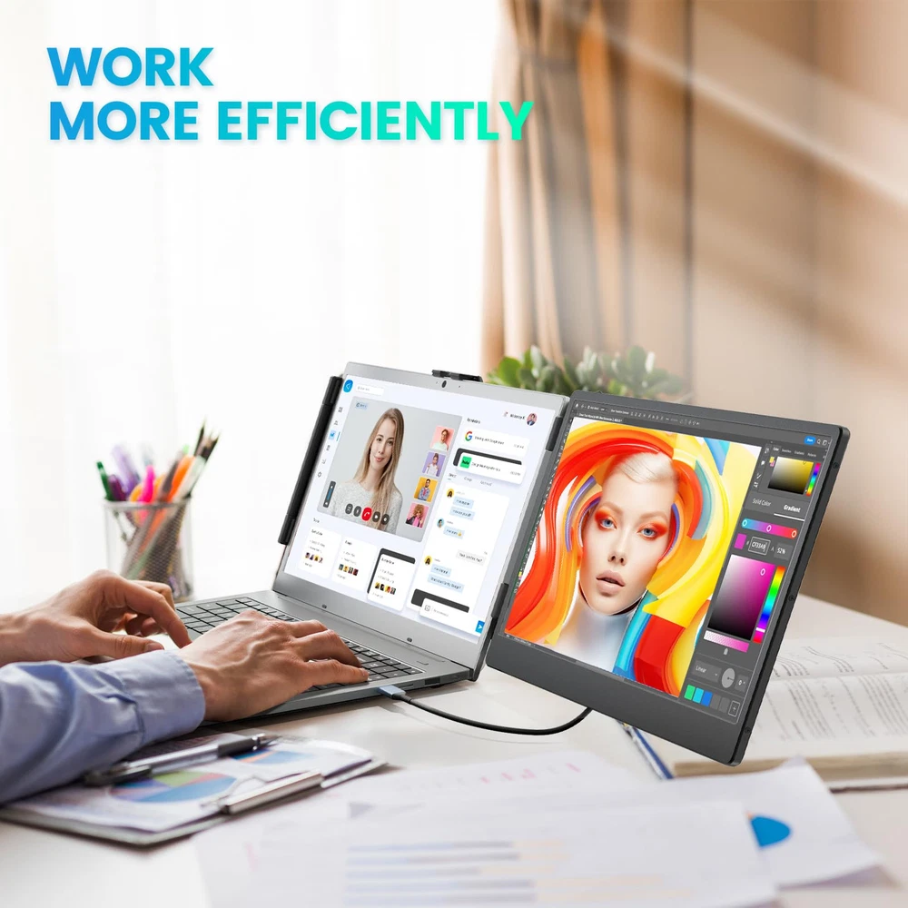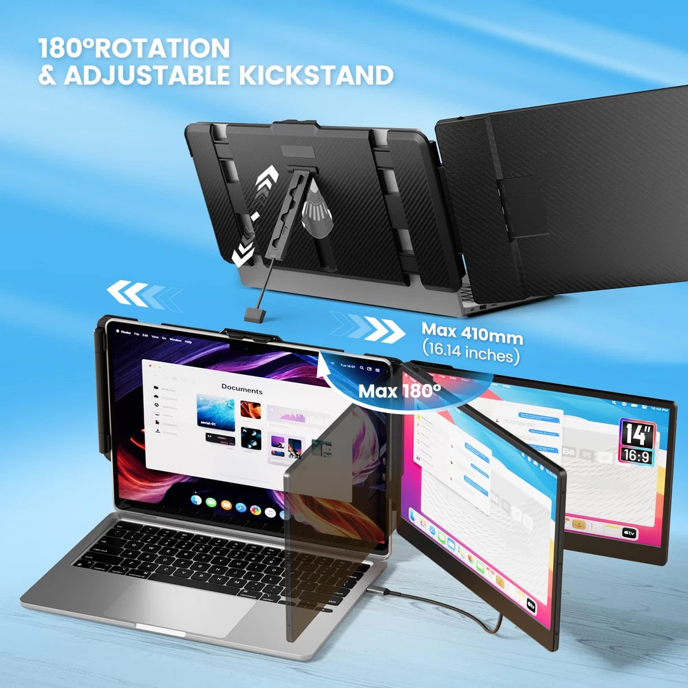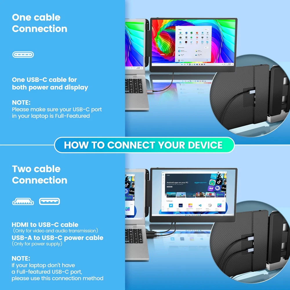 【FULL HD 1080P SCREEN EXTENDER】The portable monitor features 14" Full HD IPS display, with 300 nits of brightness, 1000:1 contrast ratio, 1920x1080 resolution. The laptop screen extender can independently adjust the brightness, stereo speaker, contrast and other parameters, ensuring every detail comes to life, providing you a more authentic visual experience. 【PLUG AND PLAY】If the laptop has a full-featured USB-C port, only one USB-C cable is needed for plug and play function, otherwise, connect with the HDMI cable and USB-A to USB-C cable. To match different devices and facilitate user connectivity, one USB-A cable(only for power supply), one HDMI cable(only for video and audio transmission), and one USB-C(full-featured) are included in the package. 【IMPROVE WORK EFFICIENCY】The laptop monitor extender supports extended mode, duplicate mode and vertical screen mode, convenient for multitasking, minimize label switching and optimize your workflow for increased productivity. Also designed with adjustable kickstand and 180° rotation, you can easily adjust for optimal comfort without additional accessories. 【WIDE COMPATIBILITY】The monitor for laptop is compatible with 13 -17 inch laptops and multiple operating systems, including Windows, MAC(M1, M2, M1 Pro/Max, M2 Pro/Max), Android, Chrome, Linux, PS4, Switch, PS4. It can be flexibly utilized in many scenarios to enjoy the visual and audio dual experience, bringing you great convenience. 【PORTABILITY AND CONVENIENCE】The travel monitor for laptop weights only 2.33lb, the monitor extender can be easily folded and placed in the provided storage bag, easy to carry, and easy to set up your workstation stably wherever you go. And if you have any question about this portable monitor, pls feel free to contact us, our after-sales team will reply you ASAP.