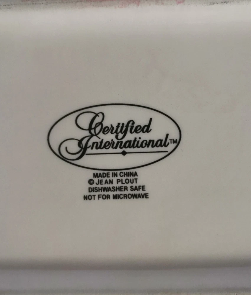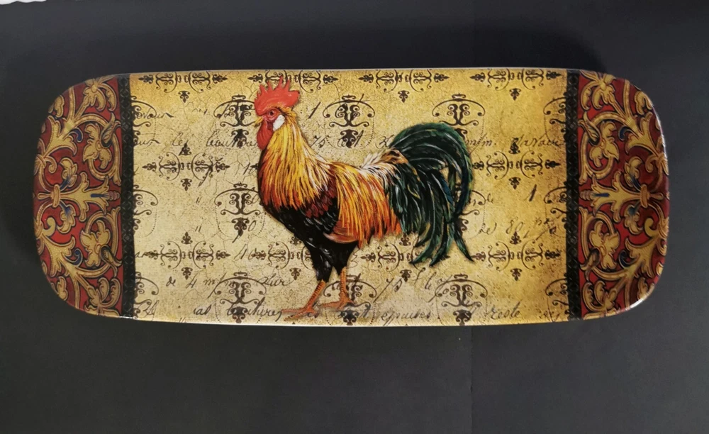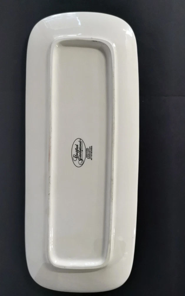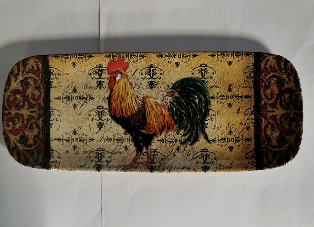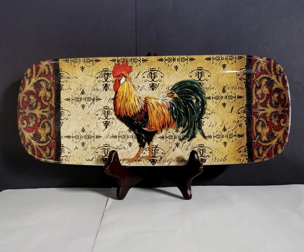 Certified International, Jean Plout, Ceramic Oblong Shaped Serving Tray. With a rooster displayed in the center, this long, slender tray would make a perfect addition to a farmhouse or rustic home decor. It's in great condition with no chips, damages or signs of anything other than occasional light use. Please see the photos for details of condition and measurements. Thank you!