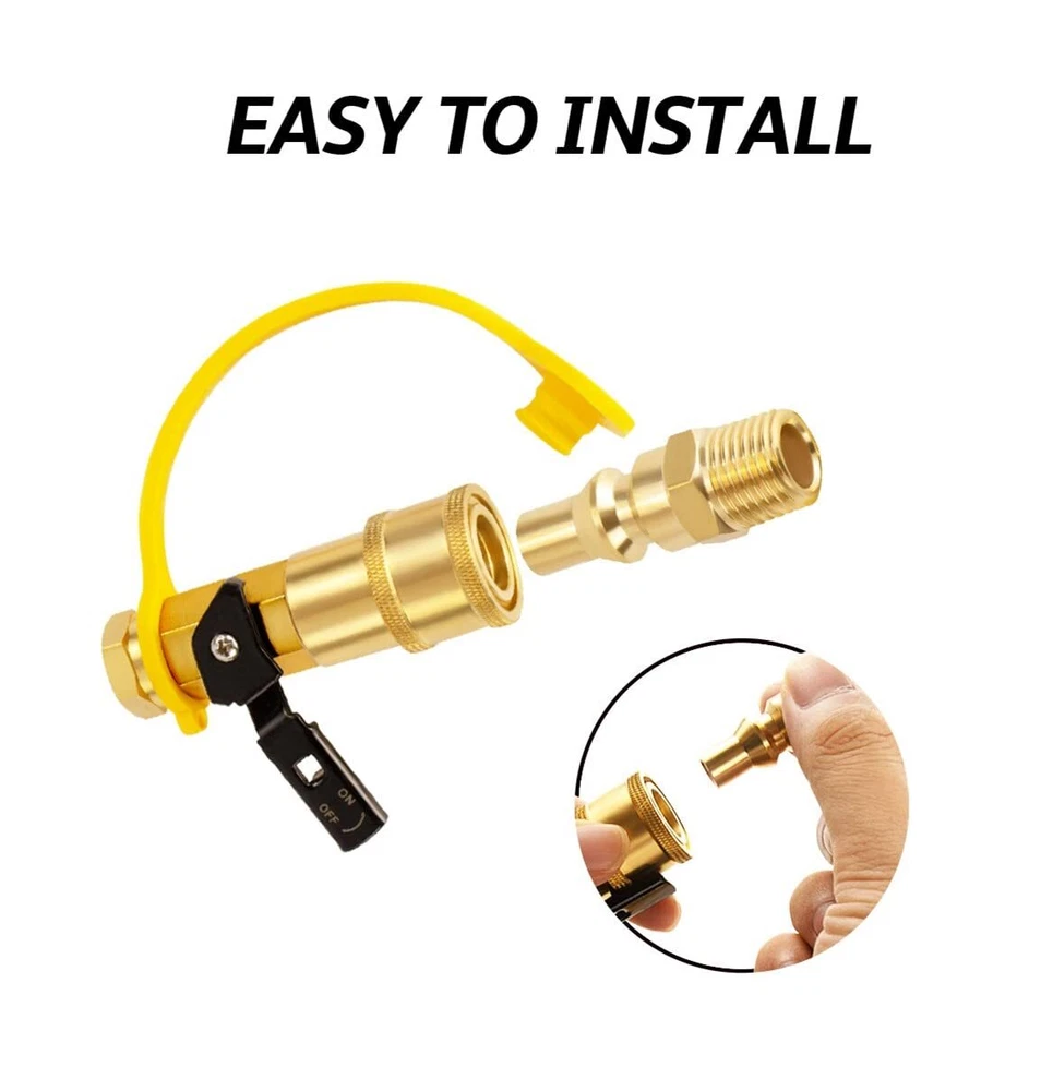 Easy to install, solid brass construction with handle Shutoff Valve: 1/4" Female NPT x Female Quick Connect Full Flow Plug: 1/4" Male NPT x Male Quick Connect Durable and lasting, Used for low-pressure propane systems Add a convenient connect / disconnect method, Comes with dust cap