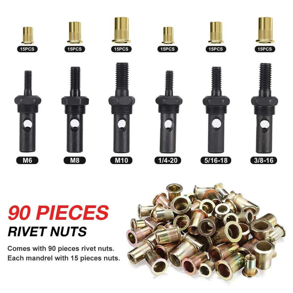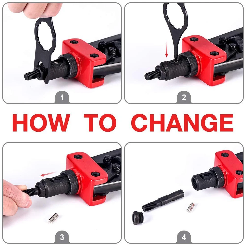 Professional Hand Rivet Nut Tool features steel arm maximizing leverage for saving effort. USER GUIDE: 1.Choose the right mandrel sets for rivet size, install it onto the tool head. 2.Open the handle fully. Put the rivet nut on the rivet head and then insert it to the hole. 3.Press the handle, rivet the nut to the right position. 4.Remove the rivet tool out from the hole. Finish! PRODUCT INCLUDES: 1 x 14” Hand Rivet Nut Tool 3 x Metric Mandrels 3 x SAE Mandrels 90 x Rivet Nuts 2 x Mandrel Lock Pins 1 x Rugged Tool box After-sales Service: If our product appears any quality problem,please feel free to contact us. We will follow up this problem until it is solved properly. 2 Year Free Replacement Warranty We offer a 2-year free replacement service due to malfunctions caused by quality problems. All pieces are packed in a rugged, compact carrying case for storage and portability. Each tool fits snugly into its respective place to prevent moving around and scraping. 【Quick -Changge Head】New Quick-change head design allows for easy changing of mandrels and nose pieces. Unique spring loaded mandrel automatically locks the mandrel lock pin for the fastest mandrel changes on the market. 【Ergonomiv and Save Effort】14 inch longer steel arms and ergonomic handles with double compound hinges maximizing leverage, it can save more effort than those normal 13 inches rivet nut tool do, while being compact in design and easy to use compared with 16 inches. 【Extra Mandrel Lock Pins】Parts included 2 mandrel lock pins, 6-piece mandrel & 90-piece rivet nuts ( Metric M6 M8 M10; SAE 1/4-20, 5/16-18, 3/8-16, 15 rivet nuts for each mandrel ). Please note that the M6 mandrel was installed in the gun. 【Hard-Wearing Quality】rivet nut tool is made from thick steel and surface is heat-treated to prevent corrosion and increase the durability and strength of the tool. All pieces are packed in a rugged and compact carrying case. Each tool fits snugly into its respective place to prevent moving around and scraping. 【Perfect After-Sales】We provide complete after-sales service. If you have any questions about using the product, you can contact us at any time.
