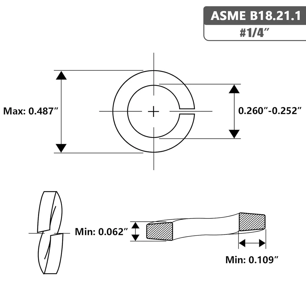 【Dimension】1/4" 【High Quality Stainless】This split lock washer provides a circular bearing surface with offset split ends which help bite into the mating material to provide a locking feature when tightened beneath a nut. 【What You Get】100pcs x Split Lock Washer 【Rest Assured】24h private customer service to respond to after-sales problems.If you don't know what size is right for you, feel free to contact us. Product Description