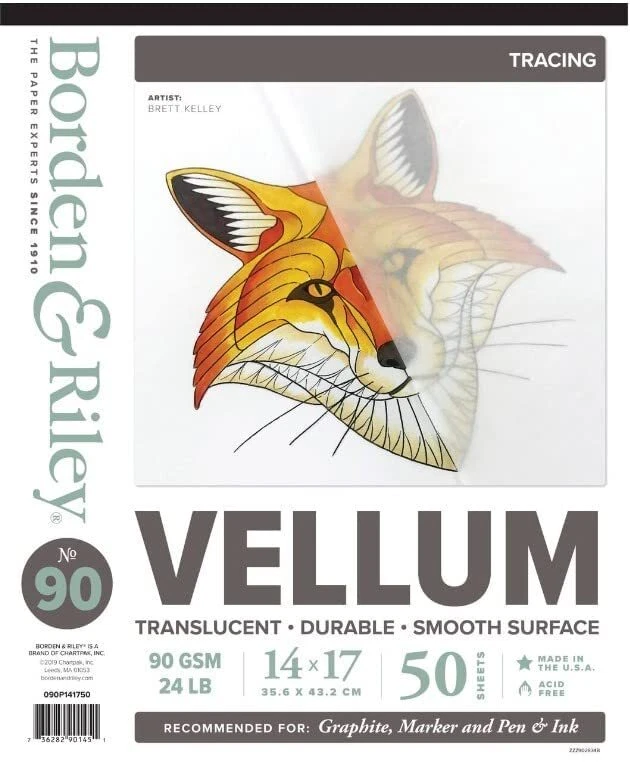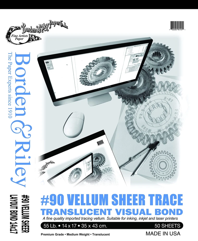 Borden And Riley #90 Sheer Trace/Medium Weight Vellum Pad, 14" x 17", 24 lb. , 50 Sheets, is a 24 lb. vellum of medium weight. It is a highly transparent tracing vellum that is receptive to most media. Made in USA. 24 lb. vellum Medium weight Highly transparent tracing vellum Receptive to most media Made in USA