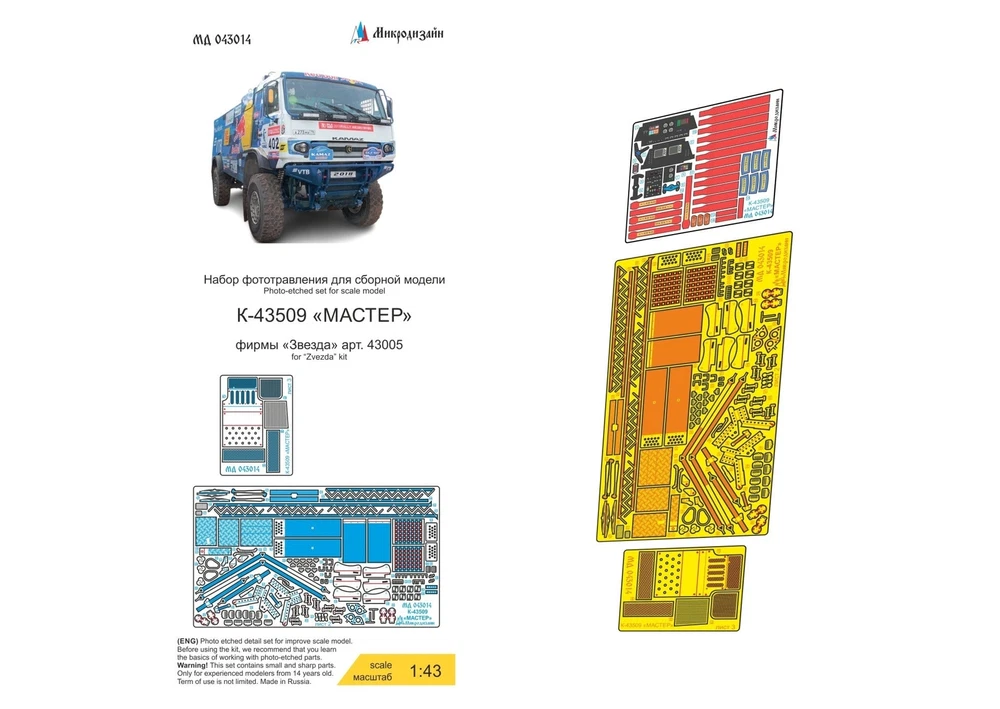 1/43 K-43509 "Master" (Zvezda) Photo-Etched Detailing Kit (Microdesign MD043014) What Is It? Enhance the precision and realism of your K-43509 "Master" model with this photo-etched detailing kit . Specifically crafted for the Zvezda kit, this set includes 70 unique pieces that replicate intricate design elements of the original vehicle . Each component is finely etched and vividly detailed , offering unmatched authenticity for your scale model. Crafted from high-quality brass , this kit ensures durability and precision. Whether you're building a realistic diorama or upgrading your model collection, this set delivers professional-grade results . The color instruction manual simplifies assembly and ensures accuracy, making it suitable for medium-level hobbyists and advanced modelers alike. Who Is It Intended For? This detail set is perfect for: Modeling Enthusiasts striving for highly detailed vehicle models Collectors of modern military or utility vehicles Medium and advanced hobbyists looking to enhance their models Those aiming to create authentic vehicle dioramas Benefits Enhanced Realism: Provides intricate details for a realistic representation of the K-43509 "Master" Durable Material: Made from 0.15mm brass for long-lasting quality Comprehensive Kit: Includes 3 photo-etching boards with 70 unique components Professional Finish: Delivers museum-quality results for display models Product Details Manufacturer Microdesign Product Code MD043014 Compatibility K-43509 "Master" by Zvezda Scale 1/43 Material Brass 0.15mm Technology Produced using high-precision photo-etching Difficulty Level Medium Contents 3 Photo-etching boards with intricate details for the K-43509 "Master" Full-color instruction manual for step-by-step guidance Number of Unique Parts 70 Kit Composition High-quality photo-etched brass components for precision detailing Specifically designed for the K-43509 "Master" Zvezda kit Includes all necessary parts to replicate structural and functional features accurately Applications Perfect for enhancing: K-43509 "Master" scale models Modern military or utility vehicle dioramas Collector's displays with authentic detailing Historical Background The K-43509 "Master" is a modern multipurpose utility vehicle known for its robustness and reliability. Designed for various logistical and tactical roles, the K-43509 is widely used in modern military operations and civil applications . This detailing kit captures the technological sophistication and functional design of the vehicle, allowing modelers to replicate its distinctive features with precision , adding depth and realism to their models. How to Use Follow these steps to enhance your model: Carefully remove the photo-etched parts using precision tools. Clean attachment points with fine sandpaper for a smooth fit. Bend and shape components using tweezers or photo-etch bending tools. Secure parts with cyanoacrylate glue for a durable hold. Follow the instruction manual for accurate placement. Why Choose Imodeller's MD043014? Authentic Detailing: Accurately replicates the K-43509 "Master" with precise detailing. Durable Construction: Made from high-quality brass 0.15mm for enhanced longevity and precision. Medium Difficulty: Perfect for hobbyists looking to add advanced-level detail to their models. Professional Results: Ensures a museum-quality finish suitable for competitive and display purposes. Upgrade Your K-43509 "Master" Model Now! Enhance your K-43509 "Master" model with this precision photo-etched detailing kit. Order now and achieve exceptional accuracy! Shipping Information Item Location: USA Fast Shipping: Item will be shipped immediately after payment.