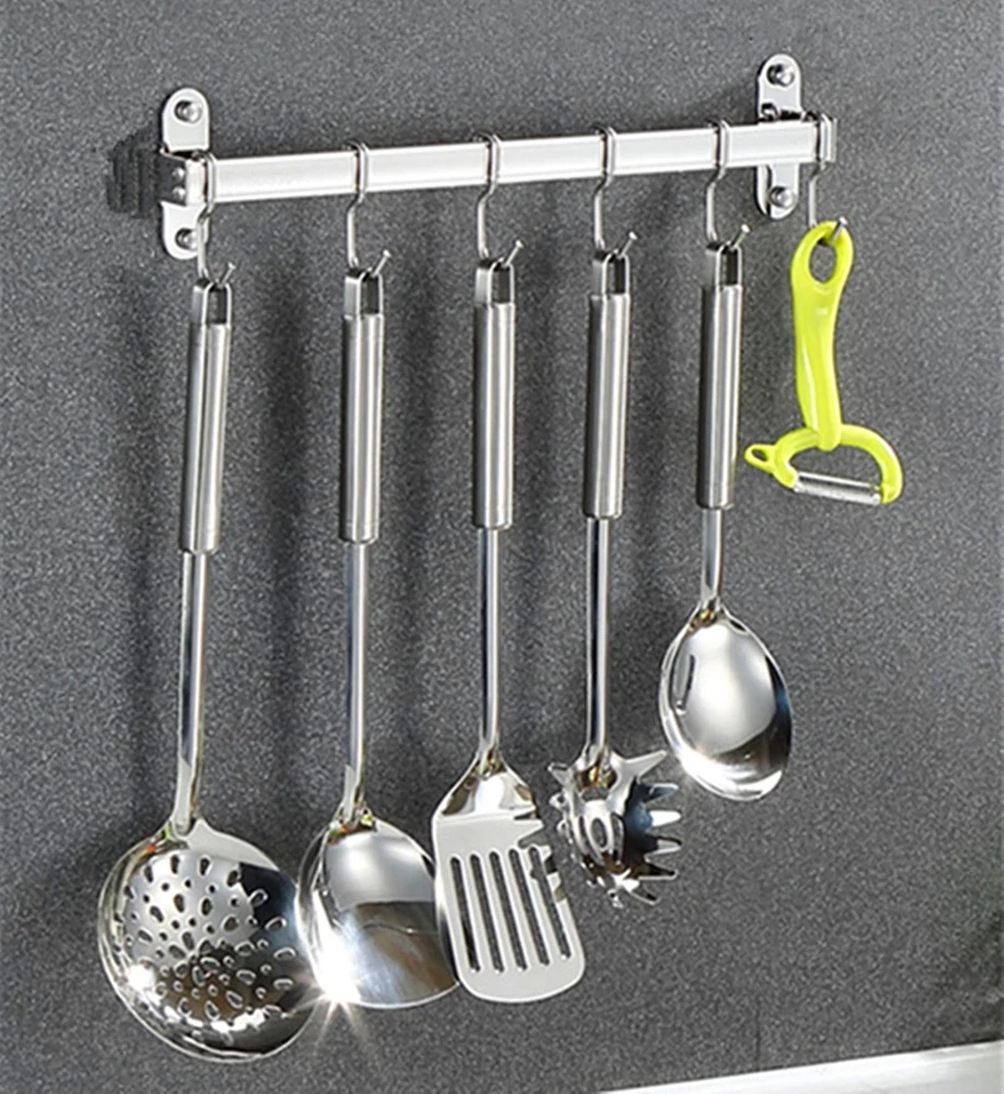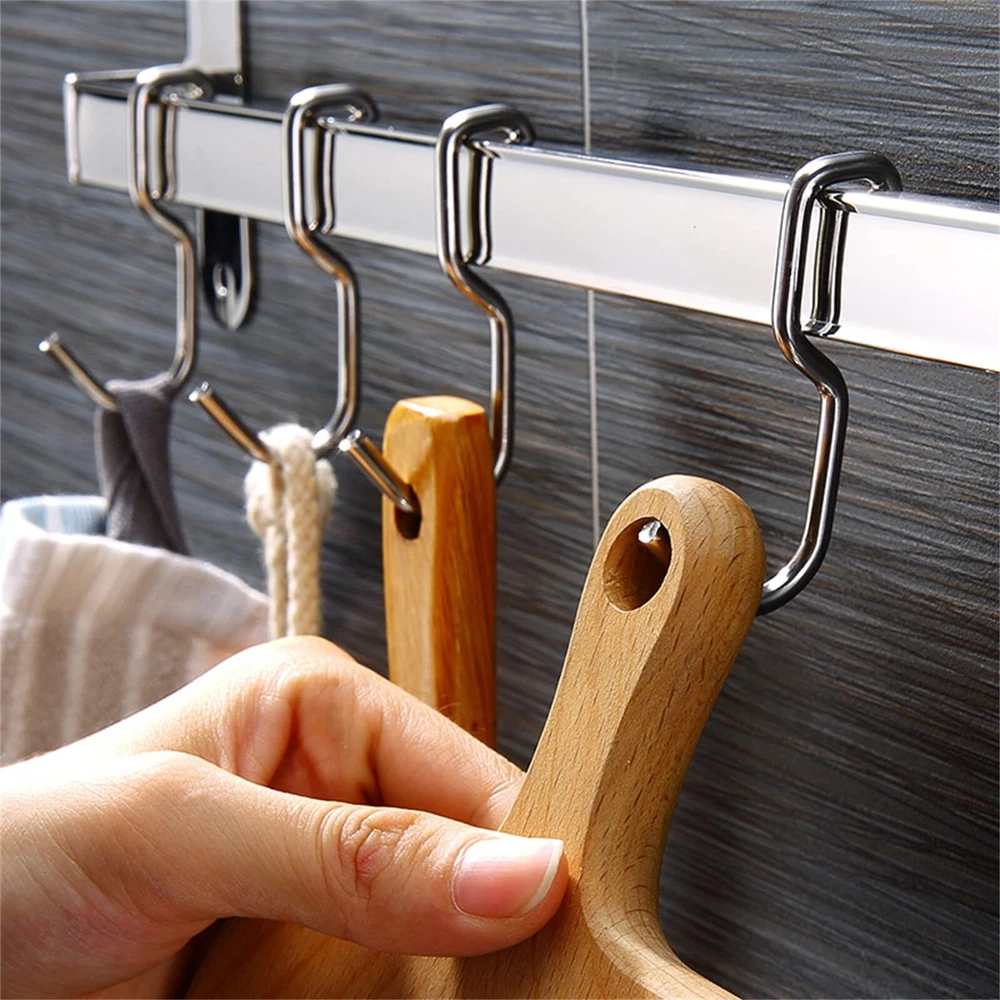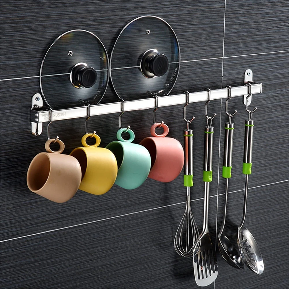 Tidying up your kitchen accessories, cooking gadgets, this kitchen utensil holder helps you be handier around the house and feel like a professional cook by making your pots, pans, lids and utensils easy to reach. Simply adhesive wall to maximize storage space. saves time and hassle searching for desired items. This wall pot rack helps you keep the clutter at bay with its s hooks for hanging. Place your utensil and create kitchen wall decor while making them within' arms reach! Product Specification Size: 14.6 x 3.1 x 1 inch Material: stainless steel Color: silver Package: 1 x Hanging Pot Rack with 6 Hooks Tidying up your kitchen accessories, cooking gadgets, this kitchen utensil holder helps you be handier around the house and feel like a professional cook by making your pots, pans, lids and utensils easy to reach. Simply adhesive wall to maximize storage space. saves time and hassle searching for desired items. This wall pot rack helps you keep the clutter at bay with its s hooks for hanging. Place your utensil and create kitchen wall decor while making them within' arms reach! Product Specification Size: 14.6 x 3.1 x 1 inch Material: stainless steel Color: silver Package: 1 x Hanging Pot Rack with 6 Hooks 【POT RACK WALL MOUNTED】pot hangers for kitchen wall mount can be mounted on wall to store pans, pots, spatulas and bakeware in an organized way. This simple and elegant wall pot rack is suitable for all decoration styles in stylish kitchen. 【POT RACK WALL MOUNTED】pot hangers for kitchen wall mount can be mounted on wall to store pans, pots, spatulas and bakeware in an organized way. This simple and elegant wall pot rack is suitable for all decoration styles in stylish kitchen. 【EFFCIENT EASY ORGANIZATION】Kitchen hanging rack is a perfect storage and organizing solution for kitchen.6 hooks can save a lots space so that keep utensils and gadgets within easy reach, no more digging through pots and pans looking for what you want. Making your home seem less cluttered 【MULTIFUNCTIONAL POT AND PAN RACK】This pots and pans rack can be used to organize pots and pans, spoons, cups and other kitchen utensils. And this rack for pots and pans rail can be used as a towel rack or a pot lid hanger.