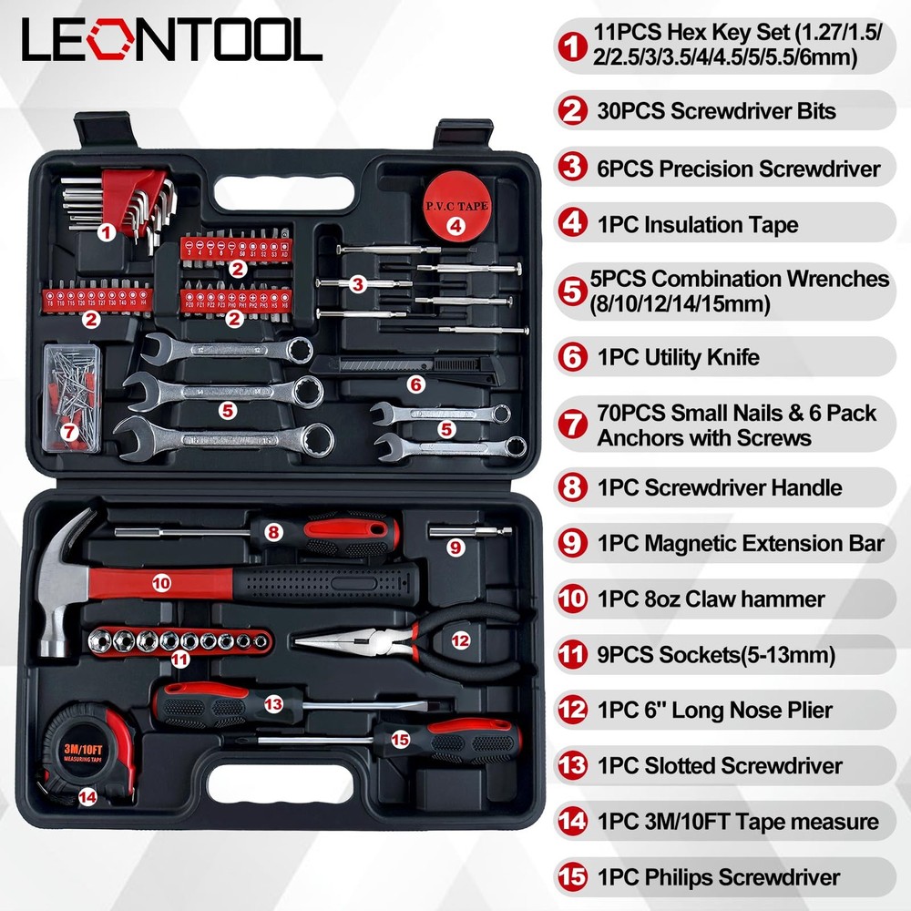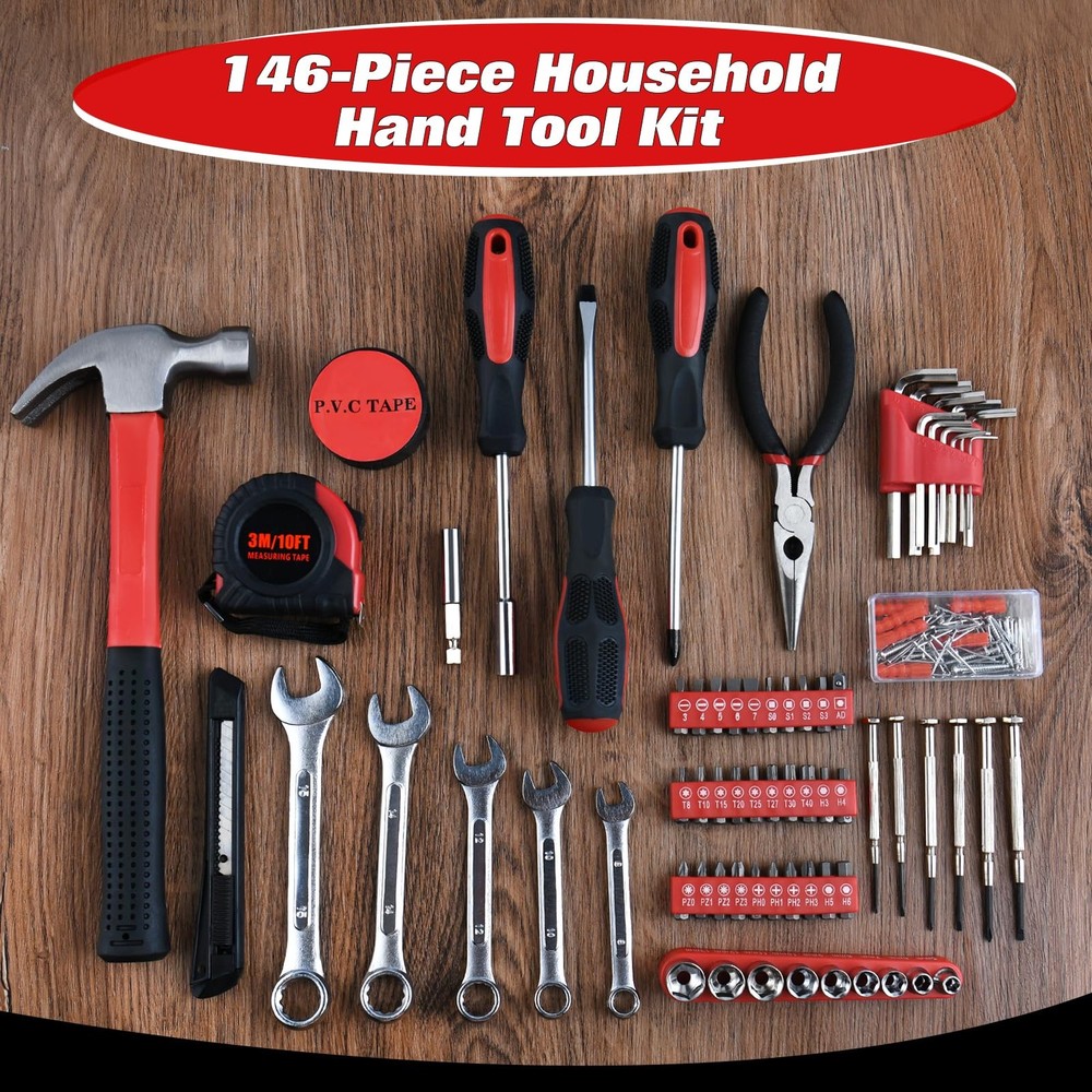 The 146 PCS Home Tool Kit is an essential collection for any household, garage, office or college dormitory. This comprehensive kit includes a hammer, pliers, wrenches, a measuring tape, screwdrivers, sockets and more, providing you with all the necessary tools for minor repairs and DIY projects. Conveniently organised in a portable plastic toolbox, this kit ensures you have the right tool at hand whenever you need it. With its wide range of tools, this kit is perfect for tackling various tasks around the home or workplace, making it an indispensable addition to your tool collection. Material: Made of premium carbon steel with high-hardness for long-lasting performance Comfortable Handle: Ergonomic anti-slip handles provide a comfortable grip 146-piece Comprehensive Tool Kit: Package includes 11pcs Hex Key Set(1.27/1.5/2/2.5/3/3.5/4/4.5/5/5.5/6mm), 30pcs Screwdriver Bits, 6pcs Precision Screwdriver, 1pc Insulation Tape, 5pcs Combination Wrenches(8/10/12/14/15mm), 1pc Utility , 70pcs Small Nails & 6 Pack Anchors with Screws, 1pc Screwdriver Handle, 1pc Magnetic Extension Bar, 1pc 8oz Claw hammer, 9pcs Sockets(5-13mm), 1pc 6" Long Nose Plier, 1pc Slotted Screwdriver, 1pc 3M/10FT Tape measure, 1pc Philips Screwdriver Portable Storage Case: Compact design with molded slot which securely houses each tool in its respective places to keep work tools clean and tidy, easy to transport and carry Muti-Purpose Home Tool kit: Suitable for most small repairs and DIY projects around the house. It's an essential tool for homeowner, handyman, work shops, office and college repairs, etc