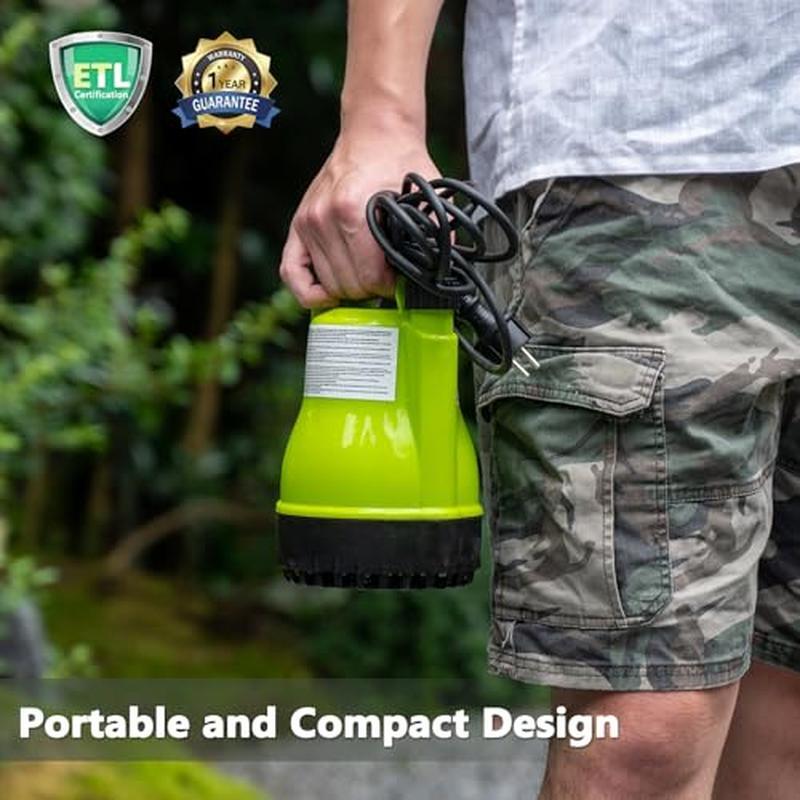 You may also like Portable Low Suction Electric Water Transfer Removal Utility Pump on/Off Switch 83.91 USD 88.33 USD Free shipping 5% off Sump Pump Thermoplastic Utility Pump Portable Electric Water Pump for Basement 97.91 USD 103.06 USD Free shipping 5% off Portable Electric Utility Water Transfer Pump 115V 1/10 HP with Suction Hose Kit 88.33 USD 92.98 USD Free shipping 5% off 1/3HP Sump Pump Submersible Unique Flow Sensor Switch for Pools Hot Tub Backyard 111.9 USD 117.79 USD Free shipping 5% off 330 GPH Portable Electric Water Transfer Removal Utility Pump W/Suction Hose Kit 72.13 USD 75.93 USD Free shipping 5% off About this item EFFICIENT UTILITY PUMP: 1/4 HP powerful motor offers a maximum flow rate of 1900 Gallons Per Hour with 1" discharge hose horizontally. This pump has the ability to lift water up to Max. 23 feet of vertical height. Removable suction screen and handles CLEAN WATER up to 1/5 inch solids COMPACT & LIGHTWEIGHT: The portable handle design, along with a 16. 4' power cable and a 26' rope, makes the pump easy to carry and install. Item weight: 6 lbs. This pump can be used in a minimum 7"x7" pit. It's perfect for a water tank, hot tub, rain barrel, swimming pool, garden pond, and more SIMPLE MANUAL CONTROL: It works by manual plug-in/out operation. The minimum water level to start working is around 6", and it can remove water down to 3/5". Just don't risk the pump to be dry running SAFETY & TOUGH: Full corrosion-resistant shell and environmental thermoplastic construction with thermal overload protection ensure durability for household and utility applications. ETL Listed EASY INSTALLATION: Two plastic hose adapters are included: GHT 3/4" connects standard garden hose for quick installation, and 1" connects discharge hose for high-capacity pumping › product details Color:Green Material:Plastic Style:1/4HP 1900GPH Product Dimensions:5. 8"L x 5. 7"W x 8. 7"H Power Source:ac Item Weight:6. 15 Pounds : :1/4HP Utility Pump 1900GPH Portable Submersible Sump Pump, Manual Control with 16.4 Ft Cord for Draining Water from Pool Pond Garden Hot Tub Basement Tankless Heater Liquids : You may also like 9' Patio Umbrella Outdoor Table Market Umbrella Waterproof with 8 Sturdy Ribs 82.15 USD 86.47 USD Free shipping 5% off Room Darkening Blackout Grommet Top Curtain Panel Pair Thermal Insulated Bedroom 33.94 USD 35.73 USD Free shipping 5% off Popcorn Maker Machine Vintage Popcorn Machine Movie Theater Professional Cart 247.98 USD Free shipping Portable Laptop Table with Charging Station Height Adjustable Standing Computer 77.78 USD 81.87 USD Free shipping 5% off 9-Piece Simple Cooking Non-Stick Aluminum Cookware Set Lightweight Easy Cleaning 31.46 USD 33.12 USD Free shipping 5% off Deluxe Multi-Bin Toy Organizer Stackable Cube Storage with Storage Bins Playroom 62.49 USD Free shipping 1 Pair 6 Ton Jack Stands Heavy Duty Car Truck Lift Tire Change Lifting Garage 96.48 USD 101.56 USD Free shipping 5% off 1/2" Drive Deep Impact Socket Set 9-Piece Spindle Axle Nut Metric 6 Point Socket 58.88 USD 61.98 USD Free shipping 5% off 20" Modern Round Indoor Analog Wall Clock Arabic Numbers Living Room Bedroom 42.94 USD 45.2 USD Free shipping 5% off Commercial Grade Multi-Purpose Microfiber Cleaning Towel Roll Reusable for Home 30.6 USD Free shipping Fabric Upholstered Accent Chair with Rattan Sides for Living Room Bedroom Lounge 122.07 USD 128.49 USD Free shipping 5% off 2 Pack 15 x 6.00-6 Tire and Wheel Set for Lawn Tractors with 3” Centered Hub 103.06 USD 108.48 USD Free shipping 5% off