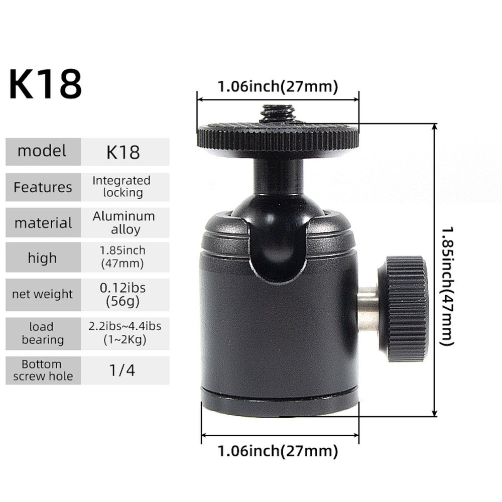 SAFE & SECURE SHOPPING 100% SATISFACTION GUARANTEED FAST SHIPPING Store Categories Store Categories You may also like 1/4IN Screw Mount for Camera Tripod Adapter 360 degree Swivel Mini Ball Head Product Description 1/4 Screw Mount for Camera Tripod Adapter 360 degree Swivel Mini Ball Head Specifications: model: K18 Features: lntegratedlockingAluminum material: Alloy Load: 1-2kg Bottom: 1/4 screw hole Features: 1. 90 ° opening design for spherical pan tilt 2. Cameras capable of carrying 1-2 kilograms, etc 3. Ball head/ball bottom integrated locking knob Packaging includes: 1x 1/4 Screw Mount for Camera Tripod Adapter Shipping Returns Contact Us Payment Shipping We ship most of our orders within 24 hours, and may up to 48 hours. If you want faster shipping way, please contact us before making a payment. Sometimes due to problems with our transportation company system, your shipping information may be delayed to update. We recommend that you try again after 3-4 days. If you still haven't checked the shipping information, you can contact us via ebay message. Returns 1. 30 days warranty from the purchased date. Please contact us via email before returning the defective item. 2.Our warranty does not extended to any product that are physically damaged or that are not under normal operating conditions as result of misuse or improper installation on the buyer/user's part. 3.Return items should include the original packaging and all accessories. buyers MUST contact us for the returning address. 4.In all cases, buyers pay shipping fees at their own cost to return products for exchange or refund. We will be responsible for the postage of replacements. Refund will be made upon receipt of the returned item. Contact Us Pls contact us if you have any problems,we will try our best to solve for you Payment We accept all verified payment from eBay. Copyright © 2022 Tongtool