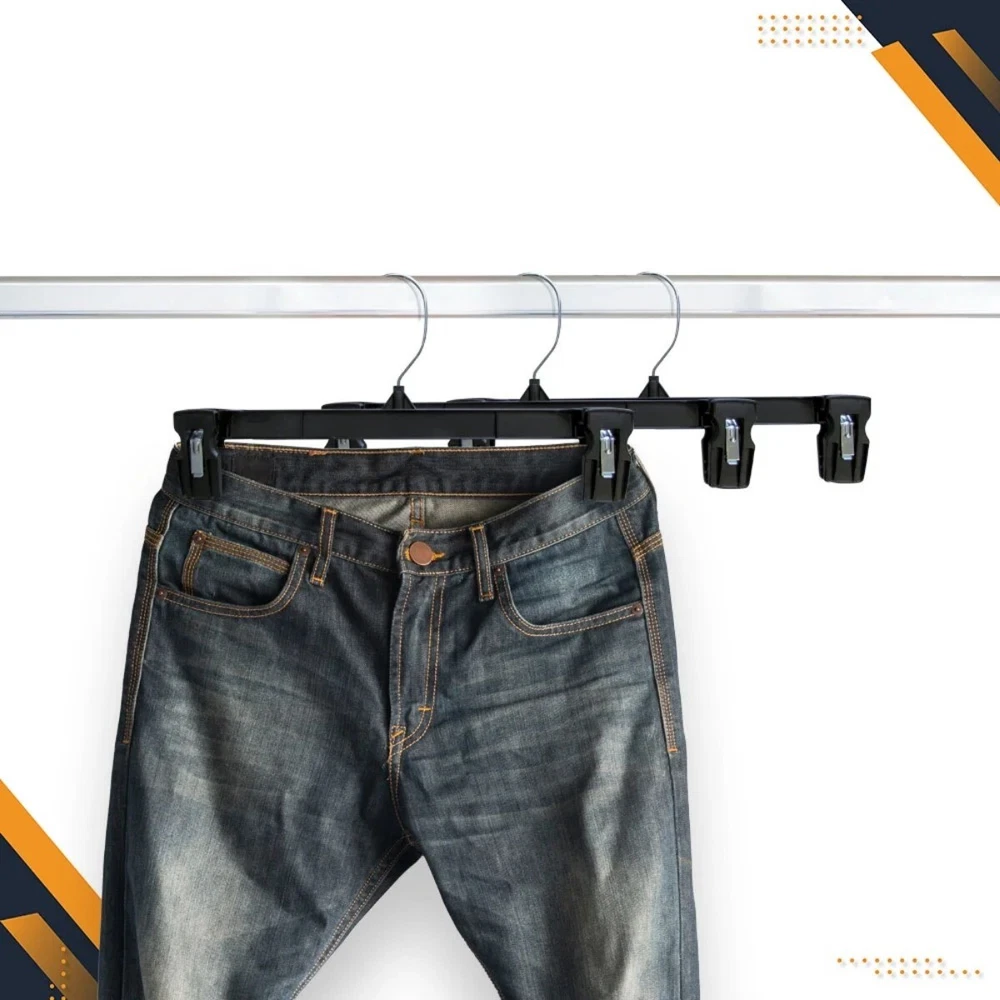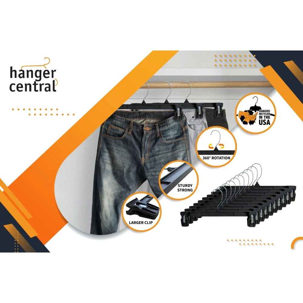 Finally, there is an easy and economical solution to your mis-matched hangers for both closets and retail displays. Our Heavy-Duty Recycled plastic hangers are break resistant and durable, capable of handling your heavy pants and wet clothes with ease. Use them in your closet, and keep an extra set in your laundry room. Offered in an assortment of sizes and quantities from plus-sized to children's, your whole family can have hangers that fit their clothes perfectly. With a slim design and swivel hook they can keep you organized, making finding the perfect outfit a breeze. Use them to help eliminate clutter and bulk from every closet in your home from the bedroom to your hallway coat closet. Made from recycled material, these are an eco-friendly option and because they are built to last they can be reused for years to come. Our pants hangers are perfectly designed to securely hold all your bottoms, from jeans and slacks to your favorite skirt and dress pants. The padded pinch clasps hold your clothes gently to ensure your clothes stay wrinkle-free and off the floor. These hangers are 14" wide and come in a pack of 25. They are sized to accommodate both men's and women's clothing. Robust Pinch Grip Clips - Ensures your pants, slacks, skirts stay where you put them. Save Money - Cost-effective heavy-duty break-resistant plastic means you spend less time replacing broken hangers, and eliminates finding your wardrobe on the floor of your closet or under your racks. High Quality Finish - Chrome Swivel Hook and smooth edges put an end to snagging material, wrinkles, and deep indentations on more delicate fabrics. Maximize your Storage - Replace your random hangers with one slim design to make the most of your space by reducing bulk and wasted space in your closet, or on your rails. Perfect for Men's, Women's, and Children's Clothing. All your closets or departments can have a consistent, uniform look.