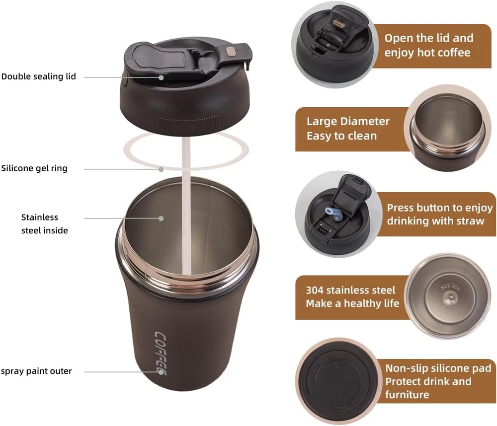 Store New Arrivals Add to Favorite View Feedback Contact 14Oz Insulated Coffee Travel Mug Stainless Steel Vacuum Coffee Cup Leakproof with Screw Lid Double Wall Coffee Tumbler Reusable Thermal Cup for Hot/Iced Beverage - 400Ml (* Black) Description Item model number Coffee Mug 316-1 Style Fine Number of Items 1 Pattern Solid Country of Origin China Theme Sports Unit Count 1.0 Count Product Dimensions 1.97"W x 7.87"H Material Stainless Steel Capacity 450 ml/min Package Type Standard Packaging Age Range (Description) Adult Finish Type Matte Specific Uses For Product Cold Drinks, Hot Drinks Included Components Lid Reusability Reusable Item Weight 9.1 ounces Material Feature Insulated Occasion Christmas Special Feature Leak Proof, Vacuum Insulated, Double Wall Material Type Free Stainless Steel Free, Plastic Free, BPA Free, Glass Free Color * Black Shape Round Recommended Uses For Product Gift, Travel, Nursing, Home Manufacturer ZMHQLPDZ Brand ZMHQLPDZ Product Care Instructions Hand Wash Only Size 14 Ounces 【Double Wall Stainless Steel Insulated Coffee Cup】Double wall vacuum insulation coffee mug, using shatter proof durable 304 stainless steel material interior and easy gripping fingerprint proof matte finish exterior, keeps drinks odor free. 【Keep Your Coffee Hot and Cold for Hours】Vacuum insluated coffee mug for maximum temperature tetention, drinks keep warm/cold for up to 8 hours and feel energized for the day.(NOTE:Please pour in hot/ice water for 1 minute then pour it out before added the desired drink to keep temperature.) 【Travel To Go Vacuum Coffee Cup】Spill proof travel coffee mug With screw-in threaded cup lid is equipped with a sealing ring, which provides a good leak-proof effect. You can put it in your car, bag, and backpack without fear of leakage. [ Coffee Tumblers with Straws]: 400ml/14oz capacity is a portable travel mug when you are on the go.Upgrade the lid with 2 ways to drink, you can drink cold through the straw, also flip the lid to drink hot, more convenient. It is still lightweight even it is full of beverages. A good ideal for indoor and outdoor use, such as home, travel and car. 【Wide Application 】Perfect insulated coffee travel mug great for outdoor adventure, home, office and fit most of vehicle cup holders, an ideal gift for coffee lovers, professionals, travelers, and anyone who wants to enjoy their favorite beverage on the go. Product Description Double wall vacuum design Double walled vacuum insulated coffee cups can prevent heat or heat transfer, keeping your drink hot and cold for a longer time. Keep hot drinks for 6 hours and cold drinks for 12 hours. Leak-proof lid Double mouth bottle cap design with lid and straw, with silicone seal, effectively prevent leakage. For hot drinks, you can open the cap by pressing with one hand, and for cold drinks, you can open the straw and take a sip, and drink iced coffee easily. 304 food grade stainless steel The travel coffee cup is made of high-quality 304 stainless steel, durable and safe, 100% BPA free and non-toxic steel, allowing you to use it with peace of mind. Frosted bottle body, anti slip bottom The bottle body is frosted design, comfortable to hold with one hand and effectively prevent slipping. The bottom is a non-slip rubber bottom, can be placed smoothly on the desktop, not easy to slip. ABOUT US We offer the best prices around on high quality products. Our E-store includes media such as books, movies, music and games while offering electronics, toys, sporting apparel, clothing, tools, general home, garden items and more. SHIPPING We are always working hard to ensure your package arrives as soon as possible. Please understand that some factors like weather, high postal traffic, and the performance of shipping companies are outside of our control. We offer free shipping to the lower 48 states and ship within 2 business days of payment, usually sooner. We do not accept P.O. Boxes. Please provide a physical address. RETURNS We offer a 30-Day Return Policy on items which you are not completely satisfied with. You have the option for a full-refund or an exchange of the item. No returns are available on items shipped outside of the USA. PAYMENT We accept PayPal. CONTACT US This page content is yet to come Please ad us to your favorite seller and visit again later Thank You CUSTOMER SATISFACTION We try our very best to make sure every customer is completely satisfied. If there's a problem, message us! We're happy to help.