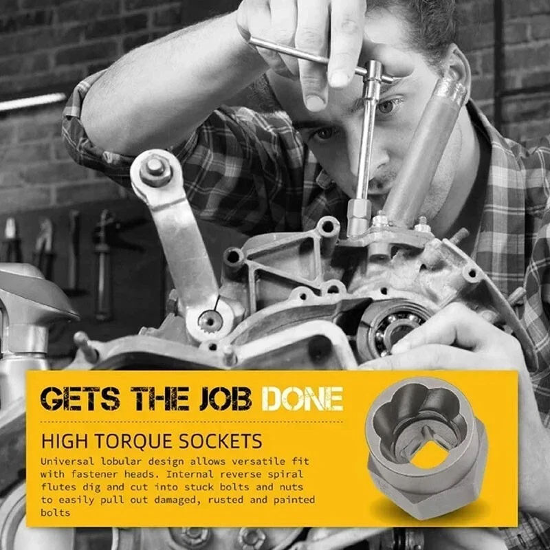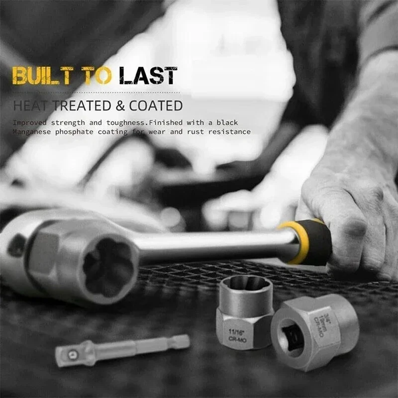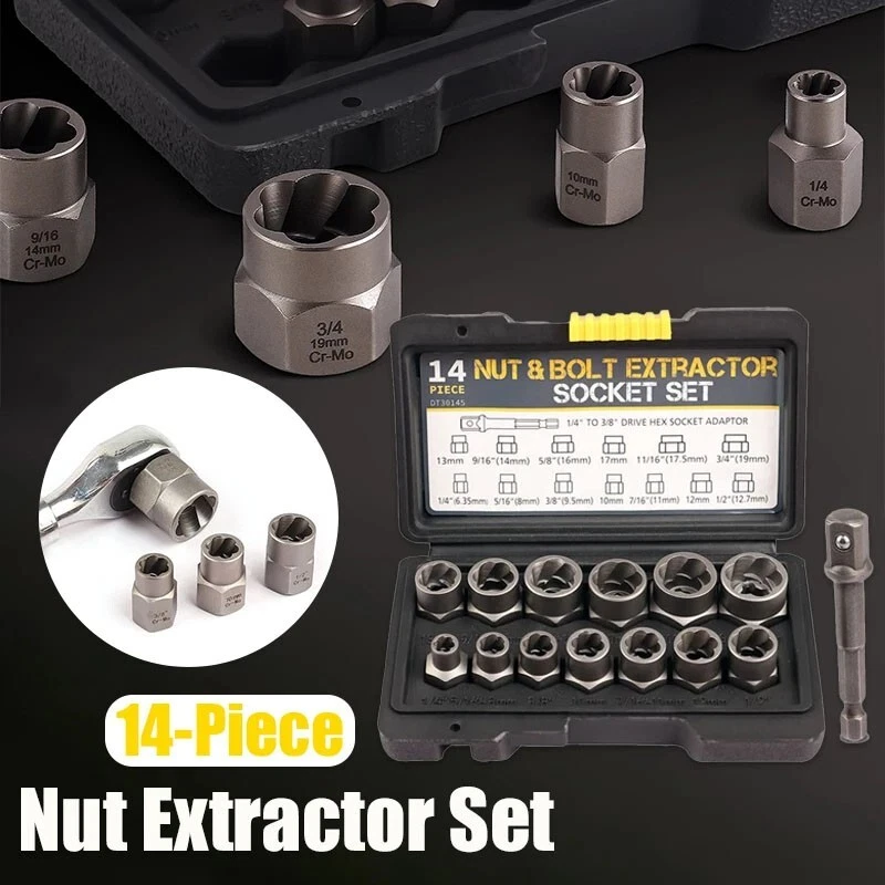 (14PCS WITH BOX)--Impact Bolt & Nut Remover Set 14 Pieces Bolt Extractor Tool Set with Storage Case Nut Bolt Extractor Sleeve Set Damaged Bolt Nut Remover Extractor Socket Tool Feature: High-Quality Alloy Material: This impact bolt & nut remover set is made from high-quality alloy material, providing exceptional hardness and durability. The sturdy construction ensures that each piece can withstand high torque and perform reliably during bolt and nut removal tasks. Customers can rely on the set for long-lasting use. Wide Range of Sizes: The bolt extractor tool set includes a variety of sizes to cater to different needs. With multiple options available, you can effortlessly tackle bolts and nuts of various dimensions. Whether it's a small or large fastener, this versatile set has you covered, making it suitable for a wide range of applications. Convenient Plastic Case: The nut bolt extractor sleeve set comes neatly organized in a plastic case. Each piece is labeled with its corresponding size, allowing for easy access and storage. The compact and portable case ensures that your tools stay organized and protected, making it convenient to carry and use anywhere. Ideal for Mechanical Repairs: This damaged bolt removal tool is specifically designed for mechanical repairs. Whether you're a professional mechanic or a DIY enthusiast, these tools are essential for removing stubborn or damaged bolts and nuts. They provide the necessary grip and leverage to tackle even the toughest fasteners, saving you time and effort. Versatile DIY Tool: In addition to mechanical repairs, this damaged bolt nut remover extractor socket is also perfect for various DIY projects. From furniture assembly to home improvement tasks, these tools come in handy when you need to remove or replace bolts and nuts. Their versatility makes them a valuable addition to any toolbox.