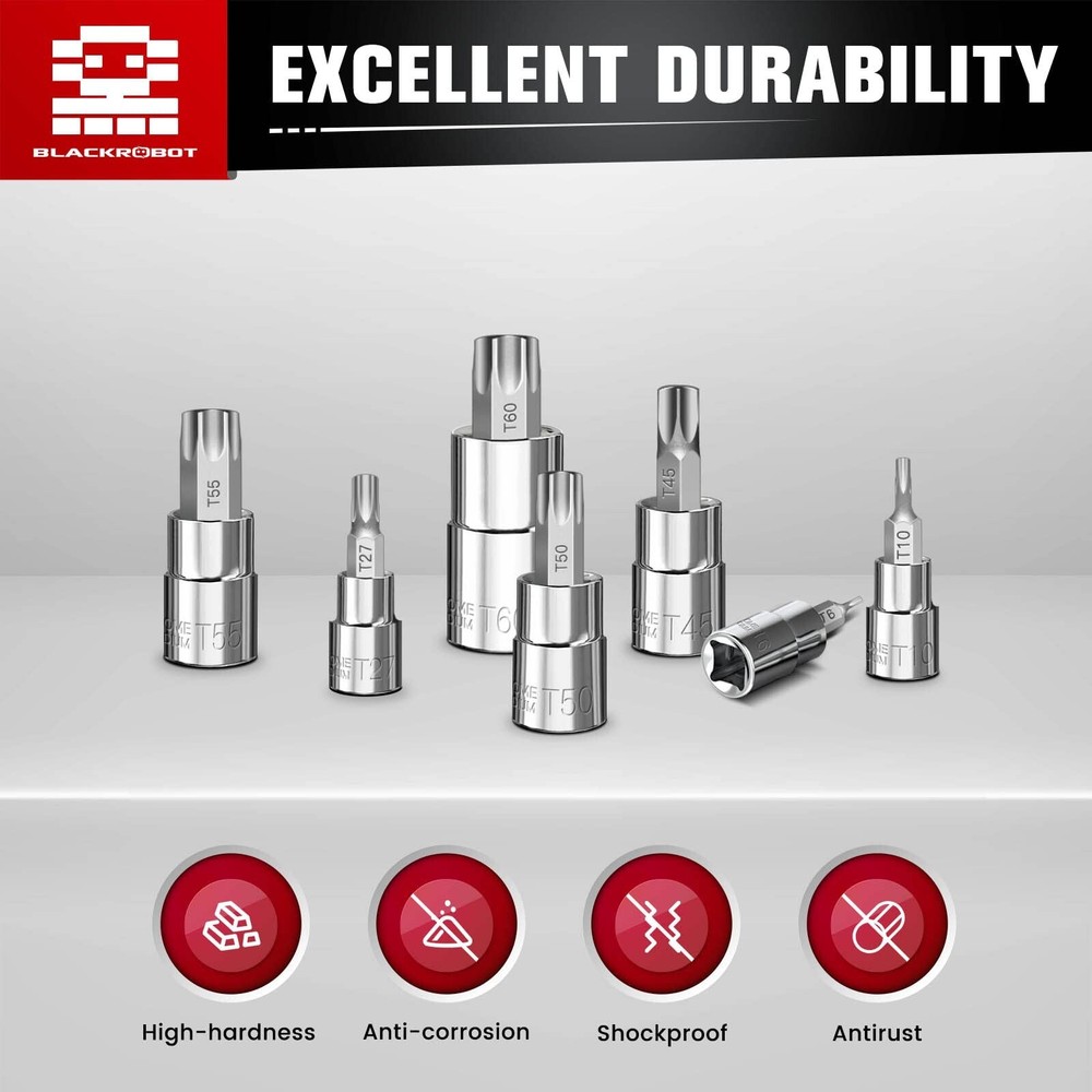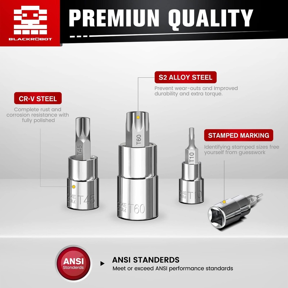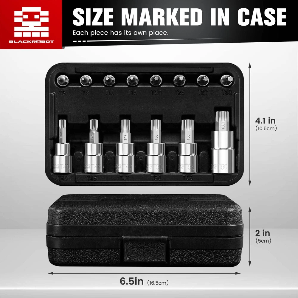 14-Piece Torx Bit Socket Set T6-T60, S2 and Cr-V Steel Star Bit Socket Set 1/4” 3/8” 1/2” Drive, T Torx Enhanced Storage Case for Motorcycle Bicycle Machinery Repair - Buy Now with Fast Shipping! 14-Piece Torx Bit Socket Set T6-T60, S2 and Cr-V Steel Star Bit Socket Set 1/4” 3/8” 1/2” Drive, T Torx Enhanced Storage Case for Motorcycle Bicycle Machinery Repair Product Details Brand: BLACKROBOT Item Length: 0.25 Inches Material: Chrome Vanadium Steel, S2 Steel Drive System: Torx, Star Finish Type: Chrome Plated,Corrosion-resistant,Mirror,Polished Brand: BLACKROBOT Item Length: 0.25 Inches Material: Chrome Vanadium Steel, S2 Steel Drive System: Torx, Star Finish Type: Chrome Plated,Corrosion-resistant,Mirror,Polished Number of Pieces: 14 Manufacturer: BLACKROBOT Part Number: Torx Bit Socket Set Item Weight: 1.46 pounds Country of Origin: China Item model number: Torx Bit Socket Set Size: 14PCS Torx Bit Set Finish: Chrome Plated,Corrosion-resistant,Mirror,Polished Item Package Quantity: 1 Compatible Fastener Range: 0.25 inches Batteries Included?: No Batteries Required?: No Date First Available: March 1, 2023 Key Features ✅ COMPREHENSIVE SET 14-piece Torx Bit Socket Set: 8pc 1/4" Bit sockets: T6, T8, T10, T15, T20, T25, T27, T30; 5pc 3/8" Bit Sockets: T40, T45, T47, T50, T55; 1 pc 1/2" Bit Sockets: T60;A plastic storage case. ✅ HIGH QUALITY The star bit socket set is made of high quality S2 alloy steel for superior hardness and to ensure long life, and the Cr-V steel sockets provides superior torque for greater rotational power. ✅ EASY TO IDENTIFY The surface of the torx bits both has large, clear size markings that are easy to read and won't wear out. Comes with a storage case for easy portability. Dimensions are also printed under each slot for easy identification! ✅ WIDE APPLICATION BLACKROBOT torx bit set includes all essential sizes, suitable for tasks related to bicycles, motorcycles, automobiles, appliances, lawn equipment, machinery, and any other jobs requiring star fasteners/bolts/E-sockets. ✅ OUR PROMISE At BLACKROBOT, we provide 1 year warranty and 24/7 Service. If you encounter any problems during use star bit set, please feel free to contact us. Product Description