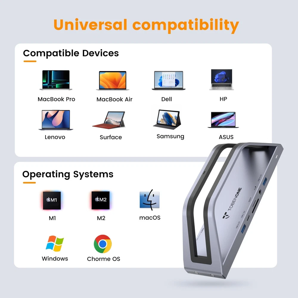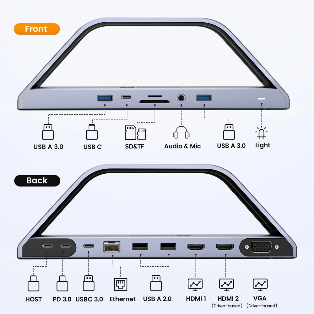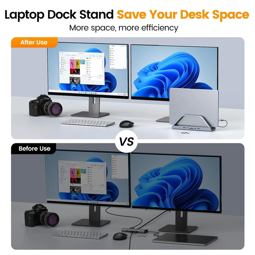 The upgrade USB dual monitor docking station (UDS020P) with power adapter, is an excellent option for your computer's connectivity capabilities. Whether you're working from home or in an office, this laptop dual monitor docking station 2 HDMI ports offer a convenient and versatile solution to enhance your setup. Besides this is a new innovation and design carried out by the team according to market demand: combining the USB-dock and stand. Not only can it extend triple displays for your USB-laptop, but it can also be used as a stand to save your desktop space and improve your work efficiency. Dual HDMI ports let you extend up to dual 4K display, and VGA can up to 1080P. Because the MacBook docking station is built around a Silicon Motion chipset, it is possible to extend multiple displays even on the M1 and m2 Macs (driver download required), which would otherwise only screen. With this docking station 3 monitor, you can connect up to three additional displays for USB Windows and macOS, giving you a large and spacious workspace to multitask with ease. In addition to the dual HDMI and VGA ports, the laptop hub docking station offers space for all of your peripherals. Connect with 4x USB 3.0 ports (5Gbps), 2x USB 2.0 for wireless devices, an SD & Micro SD Card reader, Gigabit Ethernet, and an audio jack, USB PD3.0. It even comes with a 65W power adapter, all through a single USB-cable () back to your laptop. Please Note: New and innovative computer hub docking stations aren't without compatibility concerns, it is important to read the information below for details regarding display output types and system requirements. 1 - If the USB port of your laptop power delivery, data transfer, and display Alt-Mode, this universal laptop docking station can extend triple monitors. 2 - If the USB port of your laptop cannot display Alt-Mode, you can only use the HDMI 2 and VGA port to extend d 14 in 1 MacBook docking station: This Macbook docking station is equipped with 2 HDMI and VGA monitors, 2xUSB A 3.0& 2xUSB 3.0 ports(5Gbps), 2xUSB 2.0 ports, 1000Mbps Gigabit Ethernet port, SD/Micro SD card slot, 3.5mm Audio, and 1*65W USB power adapter. Compared to other Macbook docking station, more powerful and stable with the ports of connectivity, quicker heat dissipation, and more displays that fully meet the daily needs of users. Note: Installation of the Instantview SM76X driver is required before use for the dock to function properly! Break Through MacBook /M1/M2/M3/Limitations: This MacBook docking station dual monitor based on the "Silicon Motion InstantView" driver is a perfect solution to achieve M1/M2 MacBook multi-screen display experience! Just install the "InstantView" driver on your device, you can use the mac docking station dual monitor to extend up to 3 monitors for your MacBook /with an M1/M2/M3/chip Triple Display or Dual 4K Monitor mac Docking Station: This laptop docking station stand with 2 HDMI outputs capable of 4K 30Hz, and 1 x VGA output capable of 1080p60Hz for macOS and Windows. With this MacBook docking station dual monitor, you can expand your laptop's desktop to 2 or 3 monitors to increase work and study productivity. Please note: If the USB port of your laptop cannot display Alt mode, you can only use the HDMI 2 and VGA ports to extend dual monitors Improve Your USB Options: Connect up to 6 USB ports for your external devices with the Macbook docking station dual monitor for your laptop to meet your daily data transfer and expansion needs. Connect your or USB flash drive to an easily accessible port 2 USB 3.0 (5Gbps) and 2 USB A 3.0 (5Gbps) ports to transfer 1GB of files in seconds. 2 USB 2.0 ports are more suitable for mice, and keyboards avoid radio signal interference Universal Compatibility Laptop Stand Docking Station: The universal docking station dual monitor is an ideal docking station stand for most full-function USB or Windows or macOS laptops, such as Dell Latitude 7280/5580, Dell XPS 13 9380/9370, HP Elitebook 840 G5, HP Spectre X, Lenovo Yoga C930, ThinkPad, Surface 8, Surface Book, Acer, Asus Ling Yao 3, Samsung Galaxy, Note 8/9/10, Mac Mini M1/M2/M3/, M2/, Retina Intel chip, MacBook /2018-2023, even on M1/M2/M3/MacBook /. You can consult for more detailed compatibility information before purchasing MacBook Dock with Vertical Stand: This docking station for MacBook is a new innovation and design carried out by the team according to market demand. The 9*2*3-inch docking station stand is placed on the desktop, which provides more stable and saves desktop space. The 2-inch clamp slot can accommodate most laptops. Not only can it extend up to triple monitors for your USB-Windows and MacBook laptop, but it can also be used as a stand to improve your work efficiency Important Notice: The latest driver was released on September 3, 2025. Please the InstantView official to download the latest SM76X driver. Failure to do so may result in issues such as inability to extend dual screens or screen stuttering. If you encounter difficulties downloading, please