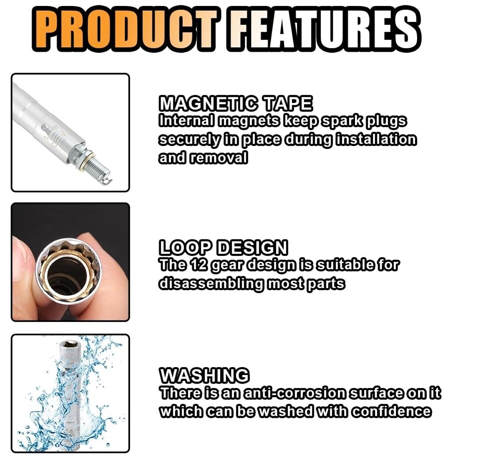 This spark plug socket is a game-changer! The 360-degree swivel makes tight spaces a breeze, and the strong magnetic grip holds plugs securely—no more fishing them out of the engine bay. The thin wall design fits perfectly, and the build feels solid. Installation is smooth, and the magnetic core keeps plugs safe. A must-have for DIYers and pros alike!