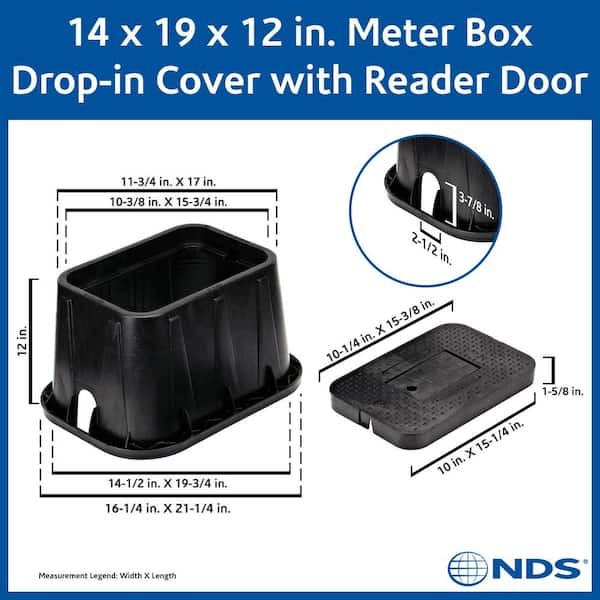 Provide the protection and discretion your irrigation system components need with the 14 in. X 19 in. X 12 in. Meter Box and Drop-in Cover. Built to last, the meter box fits easily over valves, control zone kits, and other irrigation components. Durable drop-in cover provides access for maintenance and reader door allows for easy meter reading. Engineered with structural reinforcing ribs, the black box and black cover are built to stand up to the elements, pedestrian traffic, lawn care equipment, and potential vandalism. Convenient slot makes drop-in lid easy to lift with a flathead screwdriver. The meter box is made of polypropylene (PP) using 100% recycled materials; the lid is made of polypropylene (PP) using 100% recycled materials. Both the irrigation meter box and lid are treated with UV inhibitors to prevent fading and cracking from sun exposure. NDS is a leading manufacturer of water management solutions and the trusted brand of professional landscape contractors since 1972. NDS products are available at major home centers, retailers, and online. Check out the NDS website or reach out to us for technical support-our friendly, experienced team is here to help make your project a success