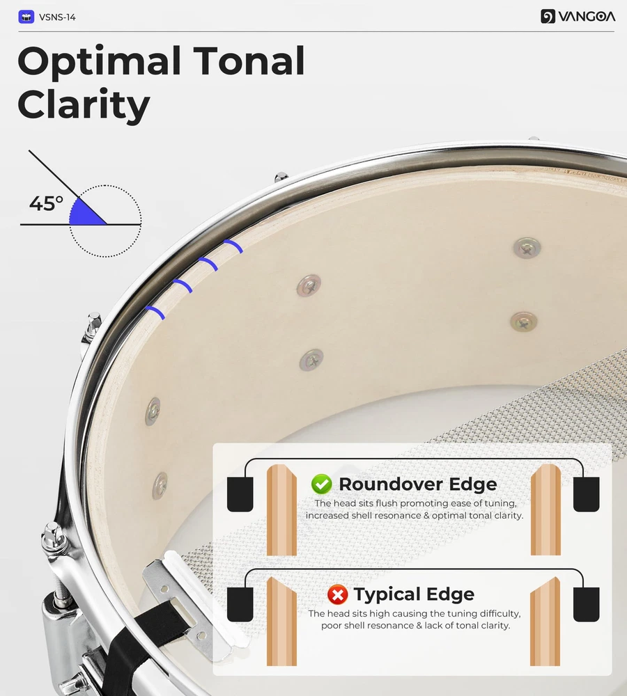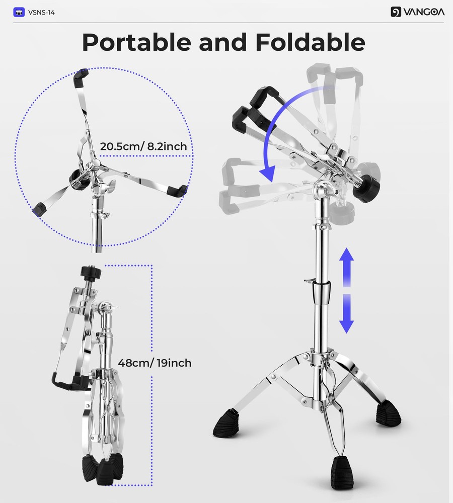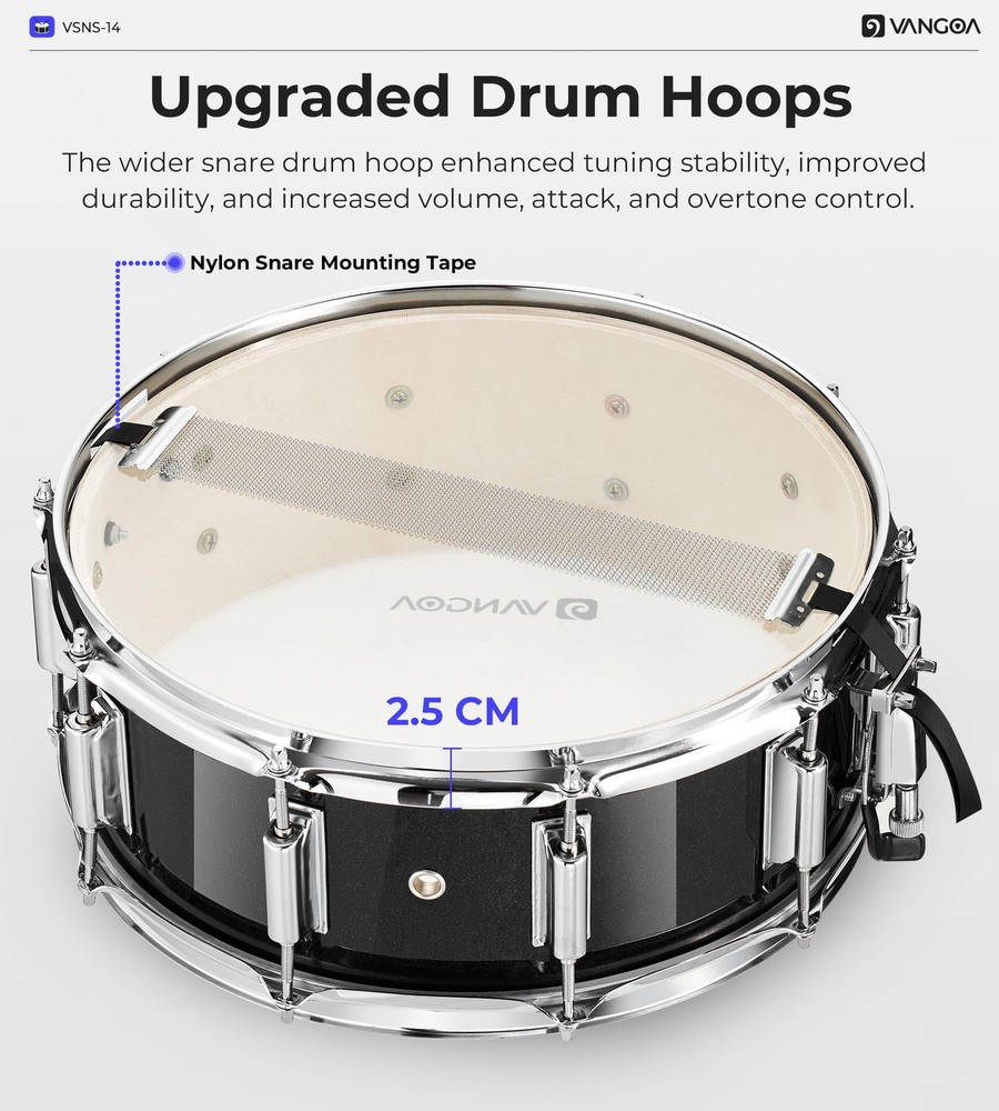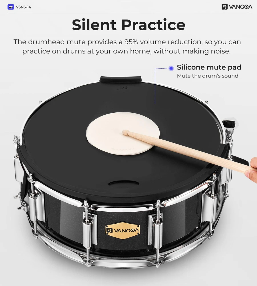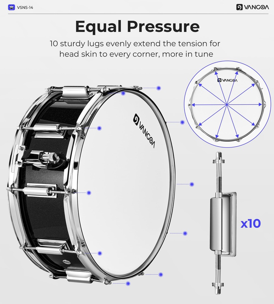 ✅ [Quality Snare Drum] Crafted from a durable maple shell, this snare drum kit delivers exceptional resonance and sound quality, making it highly versatile. With 20 strands of sensitive snare wires, it responds instantly to the slightest brush movements. Manually adjustable to minimize overtones, it produces a clear, balanced, and warm sound ✅ [45° Roundover Edges Design] The 45° round-over bearing edge enhances balance and clarity, creating a classic vintage tone with reduced attack and overtones, resulting in a brighter sound ✅ [Complete Snare Drum Kit] Ideal for both beginners and advanced players, our snare drum with stand includes drumsticks, a snare drum, a heavy duty double braced snare drum stand, a Silicone mute pad, a snare drum key, a padded case for snare drum, a padded carrying bag for snare drum stand and a shoulder strap —everything you need for effective practice ✅ [Sturdy Snare Drum Stand] Featuring a double-braced tripod design, the heavy duty snare drum stand is built with a 2.5 cm diameter tube for enhanced durability. The updated ergonomic adjusting knob ensures comfort and ease of operation. The included Silicone mute pad significantly reduces sound during practice, making it neighbor-friendly ✅ [Easy Tuning] With 10 lugs for higher tension, achieving even tension around the drum is effortless, ensuring your snare drum remains well-tuned and sounds great