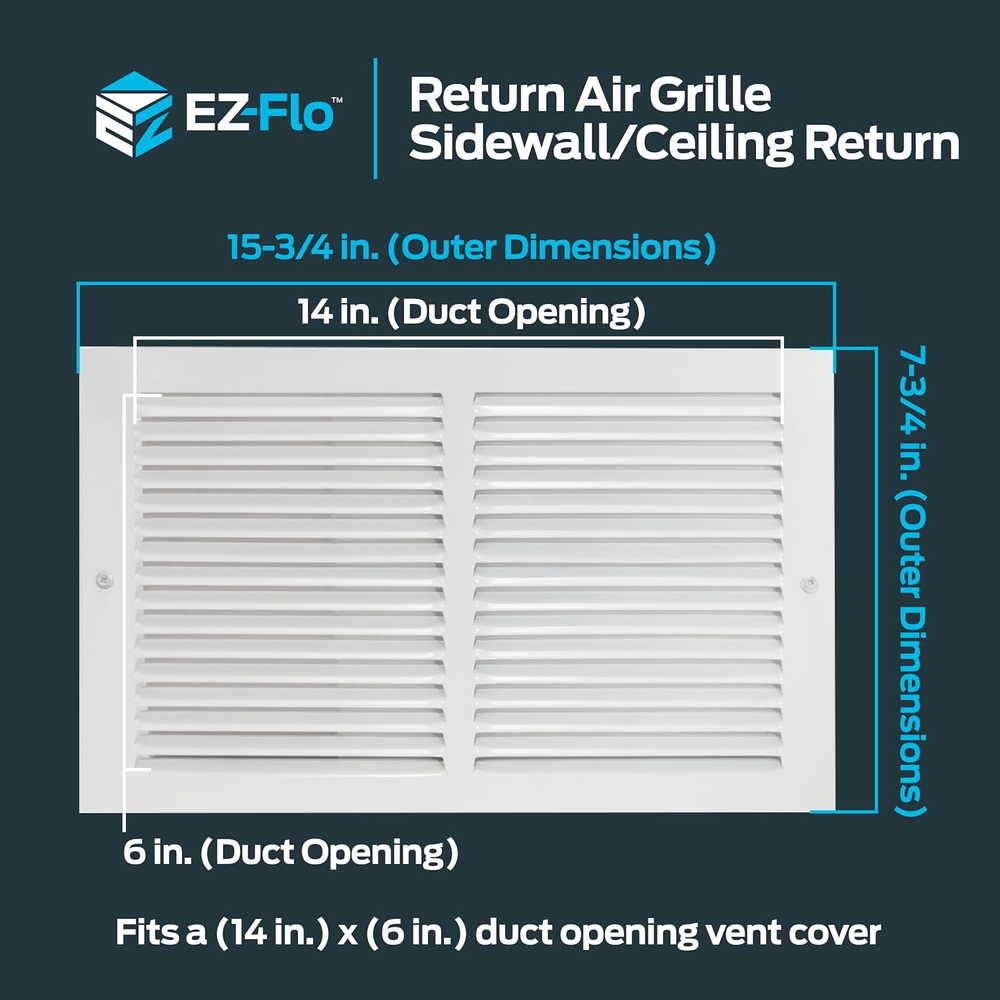 Store New Arrivals Add to Favorite View Feedback Contact 14 X 6 Inch (Duct Opening) White Return Air Vent Cover for Wall or Ceiling, 15-3/4 Inch X 7-3/4 Inch (Overall Dimensions), Solid Steel Return Air Grille, HVAC Air Return, 61628 Description Item model number 61628 Style Grille Vent Hood Design Wall Mounted Canopy Hood Country of Origin China Warranty Description 1 year limited Controls Type Touch Ventilation Type recirculation Batteries Required? No Finish Powder Coated Product Dimensions 3"D x 6"W x 14"H Material Alloy Steel Item Form rectangular Finish Type Powder Coated Item Package Quantity 1 Included Components return air grille Item Weight 14.9 ounces Special Features Rattle-Free Quiet Ventilation Special Feature Rattle-Free Quiet Ventilation Part Number 61628 Mounting Type Wall Mount Color White Is Discontinued By Manufacturer No Global Trade Identification Number 00091712616283 Batteries Included? No Size 14 in. x 6 in. WALL OR CEILING VENT: Air vent deflectors feature a duct opening that measures 14 x 6 inches, and can be used for wall or ceiling mount. The overall dimension measures 15-3/4 x 7-3/4 in inches (WxL) and features 2 vent rows FUNCTIONALITY: Louvers and slotted vanes in a fixed position control the amount and direction of airflow for rattle-free quiet ventilation and optimized performance for heating and cooling systems DURABLE: Return air grilles feature all-steel construction with a heavy-duty powder-coated matte white finish to add a contemporary touch to your home decor and withstand heat and cold without warping ENERGY EFFICIENT: EZ-FLO air vent covers are designed for optimal airflow, increasing the efficiency of residential and commercial HVAC systems; suitable for heaters, AC, or combined systems EASY TO INSTALL: Home improvement made EZ; vent cover grilles are easy to install and include 2 screws for installation Product Description The EZ-FLO Wall or Ceiling Grille is designed for wall or ceiling openings to control airflow for increased comfort. This air grille ensures quiet airflow from your central air system. These air vent covers are made of heavy-duty steel with a white powder-coated finish that resists flaking and rust for a longer-lasting performance. EZ-FLO HVAC vent grille features slotted vanes in a fixed position to allow a better airflow. Air returns are composed of all steel with a sleek matte white finish. This vent grille is ideal for sidewall and ceiling mounting and includes 2 screws for installation. From the Manufacturer EZ-FLO's 14" x 6" Return Air Grille is used for sidewall or ceiling installation. The all steel construction and powder coated finish makes this diffuser a long-lasting, durable choice. The included hardware makes for a quick and easy installation. EZ-FLO's Return Air Grille will ensure maximum airflow. Outer measurements are 15-3/4" x 7-3/4". ABOUT US We offer the best prices around on high quality products. Our E-store includes media such as books, movies, music and games while offering electronics, toys, sporting apparel, clothing, tools, general home, garden items and more. SHIPPING We are always working hard to ensure your package arrives as soon as possible. Please understand that some factors like weather, high postal traffic, and the performance of shipping companies are outside of our control. We offer free shipping to the lower 48 states and ship within 2 business days of payment, usually sooner. We do not accept P.O. Boxes. Please provide a physical address. For shipping outside of the continental USA, we only use eBay's Global Shipping Program.The item is shipped to KY and then sent to the rest of the world. International customers are responsible for all duties and taxes. Continue to check out in order to calculate costs for shipping the item to your country. Messages regarding eBay's Global Shipping Program MUST be directed at eBay EXCLUSIVELY. RETURNS We offer a 30-Day Return Policy on items which you are not completely satisfied with. You have the option for a full-refund or an exchange of the item. No returns are available on items shipped outside of the USA. PAYMENT We accept PayPal. CONTACT US This page content is yet to come Please ad us to your favorite seller and visit again later Thank You CUSTOMER SATISFACTION We try our very best to make sure every customer is completely satisfied. If there's a problem, message us! We're happy to help. WE ACCEPT Copyright © 2021 AutoDS. | All Rights Reserved