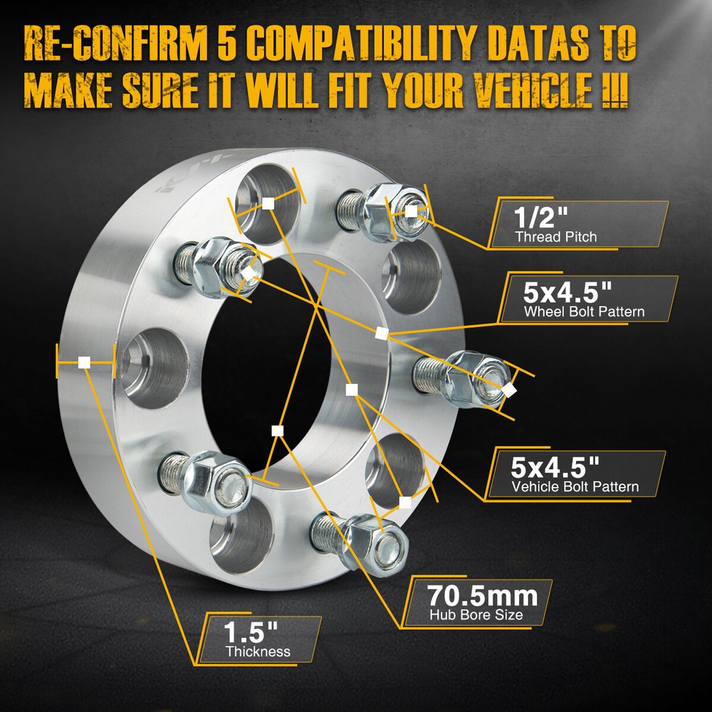 Specifications: Thickness: 1.5" Vehicle bolt pattern: 5x4.5 Wheel bolt pattern: 5x4.5 Thread pinch: 1/2" Inner Diameter: 70.5mm Fitment: For Ford 1964-1973 Mustang (5-Lug vehicles only) 1994-2014 Mustang 2007-2014 Edge 2003-2004 Mach I 1991-2007 Crown Victoria 1982-1990 Bronco (Excludes XLT Model) 1981-2011 Ranger (because of our hubcentric lip, this may not fit on the front hub. Please message us for details) 1995-2010 Explorer & Sport Trac (because of our hubcentric lip, this may not fit on the front hub of 2WD models. Please message us for details) For Lincoln 1984-1992 Mark 7 (MK7) 1982-2004 Town Car 2003-2010 Aviator For Mercury 1996-2010 Mountaineer For Mazda 1991-1994 Navajo 1998-2001 B2500 1994-2007 B3000 1994-2009 B4000 Package List: 4Pcs Wheel Spacers How to choose the correct wheel spacers: STEP. Check 3 specifications The following is the easy and simple way to check the bolt pattern/PCD, center/hub bore and thread pitch . If you donot sure, please just message us with the year, make and model of vehicle. 1). Check Vehicle Bolt Pattern/PCD For 4-lug, 6-lug, 8-lug, measure the segment from the CENTER of a bolt hole TO the CENTER of another hole. 5 lug is different, you need to measure the back of the hole to the center of the second bolt hole (not center point). (See Bolt Pattern Diagram below) 2). Check Vehicle Hub/Center Bore Size Measure the diam of the center bore on hub, make sure the spacer's diam is equal to or bigger than the axle diameter. 3). Check Vehicle Thread Pitch There are different types of studs, such as M12x1.25, M14x1.5, M12x1.5, 1/2"x20, 9/16"x18, please make sure the studs of wheel spacers is the same as the vehicle's, otherwise the spacer will not fit. How to install the wheel spacers: 1). IMPORTANT - ADAPTER OR SPACER MUST SIT FLUSH AGAINST VEHICLE HUB, AND WHEEL MUST SIT FLUSH AGAINST ADAPTER OR SPACER! Stock studs must be trimmed down (shortened) if they protrude past the surface of the adapter or spacer. If not, vibration or other problems can occur. Some wheels have pockets that may allow for no stud trimming. If not, studs MUST be trimmed. 2). Make sure the mounting surface (vehicle hub) is clean and For flat, and remove all retaining clips. 3). Install the adapter to the vehicle, with the proper lug nuts, and torque to manufacturer’s wheel torque specs. 4). Install the wheel to the adapter by torquing to the vehicle manufacturer’s wheel torque specifications (again, max 140 ft-lbs). Please assure the proper thread engagement (6 to 8 full turns) on lug nuts or bolts. 5). Drive the vehicle. If no problems (noise, vibration, anything out of the ordinary), drive about 5 miles, then re-torque the lug nuts attaching the spacer or adapter to the hub. High-Quality Raw Materials CNC Precision Manufactured,6061 T6 Forged Aluminum Alloy Disc Body,ensure driving safety and improve your driving experience Easy Installation Clean the studs thoroughly and remove any excessive dirt, oil, grease etc Highly recommended professional installation Widen Tire Spacing After the tire spacing is widened, you can enjoy more room for modification on your cars performance and looking,such as installing a larger wheel wheel Bolt Pattern Guide The following is the easy and simple way to check the bolt pattern/PCD, center/hub bore and thread pitch. If you donot sure, please just message us with the year, make and model of vehicle. Check Compatibility How to Confirm Whether the Product Fits for Your Vehicle? Payment 1) We accepts all major credit cards via PayPal: MasterCard, Visa, American Express and Discover. 2) We will only ship to the confirmed PayPal shipping address given with the payment. 3) If you want to ship to other address, please change your PayPal shipping address before you make payment. 4) To avoid initiating an unpaid item claim, please pay within 7 days. Shipping Policy 1) We will ship item locally for US buyers. Usually for US buyers it will take about 5-7 business days to reach. If you don't get it, please contact us firstly, we'll try our best to support you. 2) For US customers, all items will be shipped out within 1-2 business days with cleared payment. Please included your phone number to the payment note for prompt and secure shipment. 3) Tracking numbers for all orders are added to eBay once they have been dispatched; please login to eBay to find the tracking information for your order. Contact Us If you have ANY questions with shipping, product or service, please Contact Us first before leaving feedback/write a review or filing a return case. We will solve the problem! We always put our customers first and your satisfaction is guaranteed. Our Tech's are here to serve you. Email us and our expert team will swiftly diagnose the issue and offer the best solution within 12-24 business hours. All off-hours emails will be answered within 24-48 hours. About returns If you send email to us,In our working hours will be resumed within 48 hours. Please feel free to contact us if you have any questions: Dear my friend,we appreciate your support.And our goal is service you well and give you a pleasant shopping time in our store. ✅Dear customer, when you want to return or exchange goods (Please contact us first, instead of directly initiating a dispute) 1: Contact the seller first 2: Send pictures: outer packaging&scanned labels&item itself&with complete accessories, etc necessary condition Rule A: The original packaging of the item is in an unused state. Rule B: The outer packaging must not have any damage. 3: Obtain return label 4: Delivered Projects - Payment Repayment ✅A 15% restocking and shelving fee will be charged for returns or exchanges that are not caused by the seller and are in good condition. Exchange will not charge restocking fees or shipping fees due to transportation errors ✅Priority In case of the following reasons, the freight will be borne by the buyer 1: Unexpected order 2: Find a better price 3: Change your mind 4: Buy more items/ma