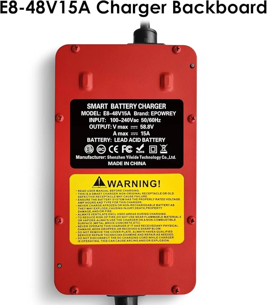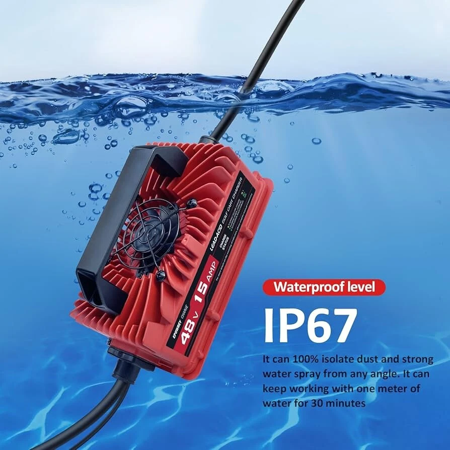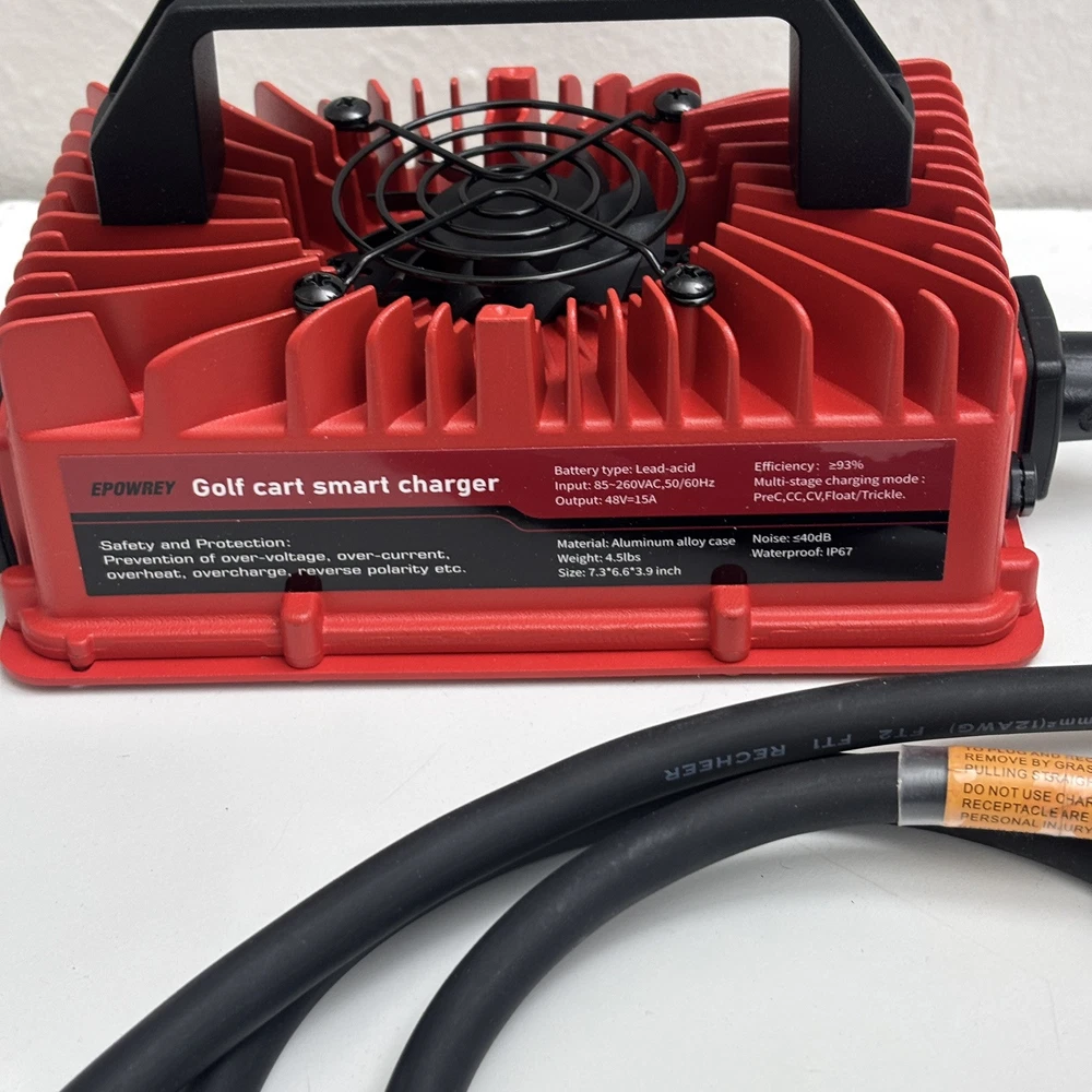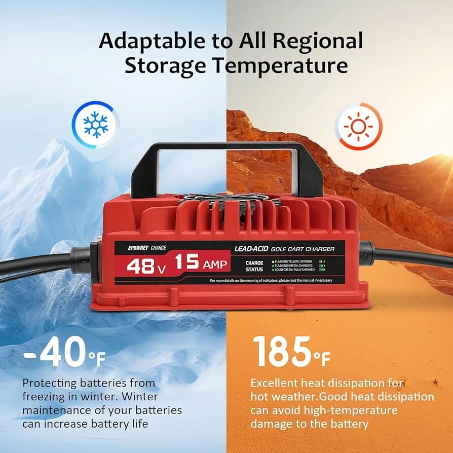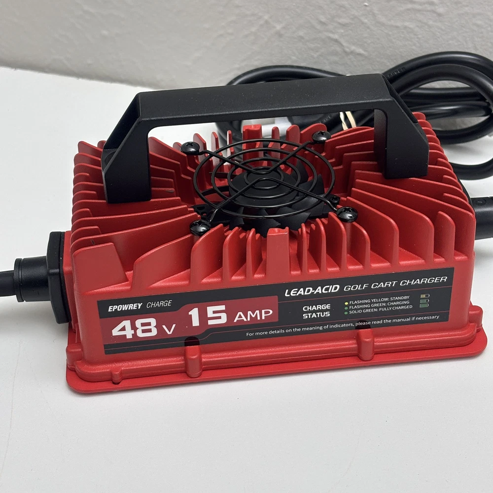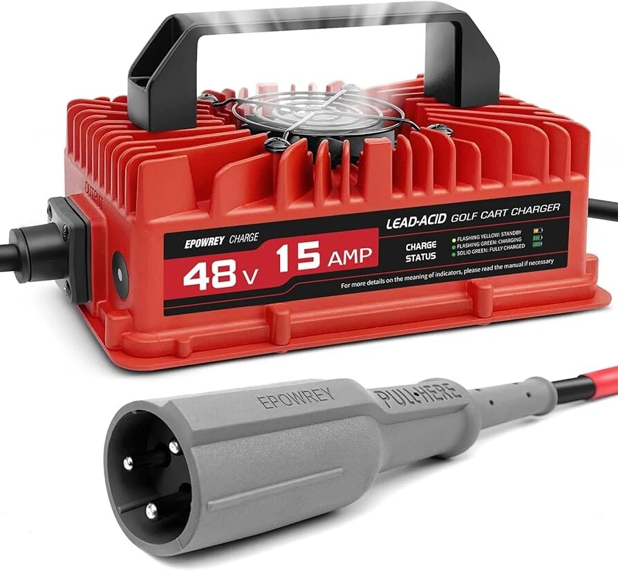 【 15 Amp Rapid Charger/Lead-Acid 】 EPOWREY 48 volt battery charger for Club Car golf carts with 3-pin round plug.This charger is designed as a one-piece plug, using a rubber cord that is more abrasion-resistant and heat-resistant than PVC cords, and have effective waterproofing advantage. 【 Dust & Waterproof 】 Having the IP67 Protection level,this charger can be used in rainy and dusty weather or other inclement weather. 【 Smart Trickle Charger Technology 】 The green light is always on when the battery is finished charging, and the power is automatically cut off to ensure safety.You don't have to worry about safety while charging. 【 Lighter Weight and Longer Cable 】 With a 16-foot fast charging cable, you can easily charge in any environment.And 5.5 lbs weight is very easy to carry compared to others. 【 OBC Detection 】 Designed to work with functioning OBC(onboard computer)and non- OBC 48V Club Car golf carts. If your current charger is working and suspect the OBC may be faulty, you may want to purchase our EPOWREY Onboard battery Charger instead which will connect directly to the batteries and charge your cart regardless of a faulty OBC.