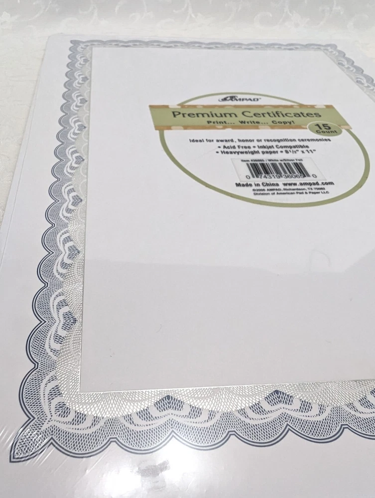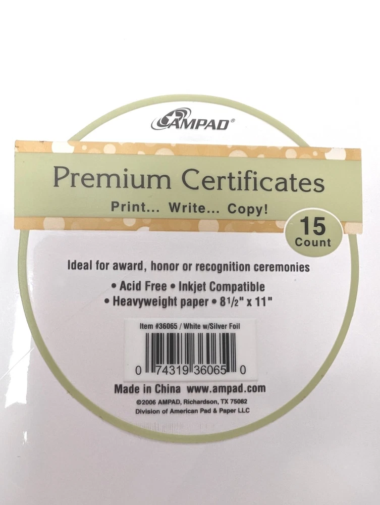 Showcase your achievements with these 15 Count Ampad Printable Certificates! These acid-free certificates are perfect for printing, writing, or copying important documents. Measuring 8.5" x 11", they are suitable for use in the office or at home. Made in the USA, these certificates are of the highest quality and will help you celebrate your accomplishments in style. The Ampad brand is well-known for producing high-quality office supplies that meet the needs of businesses and individuals alike. With the Ampad 36065 Blank Certificates, you can create customized certificates that reflect your unique style and personality. Whether you are awarding a certificate for achievement, recognition, or attendance, these certificates are sure to impress.