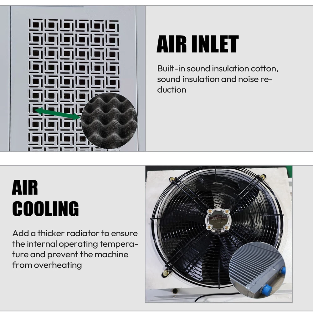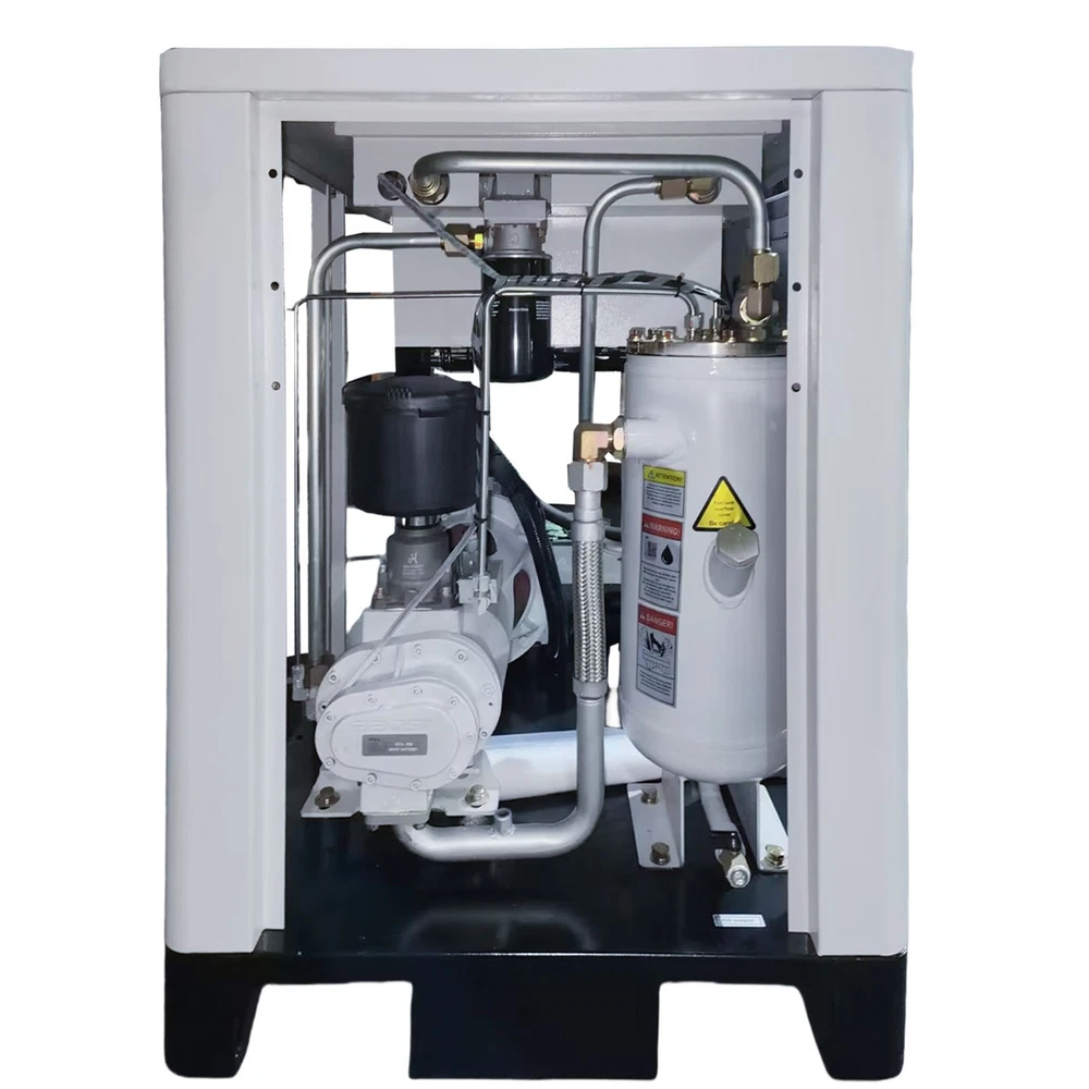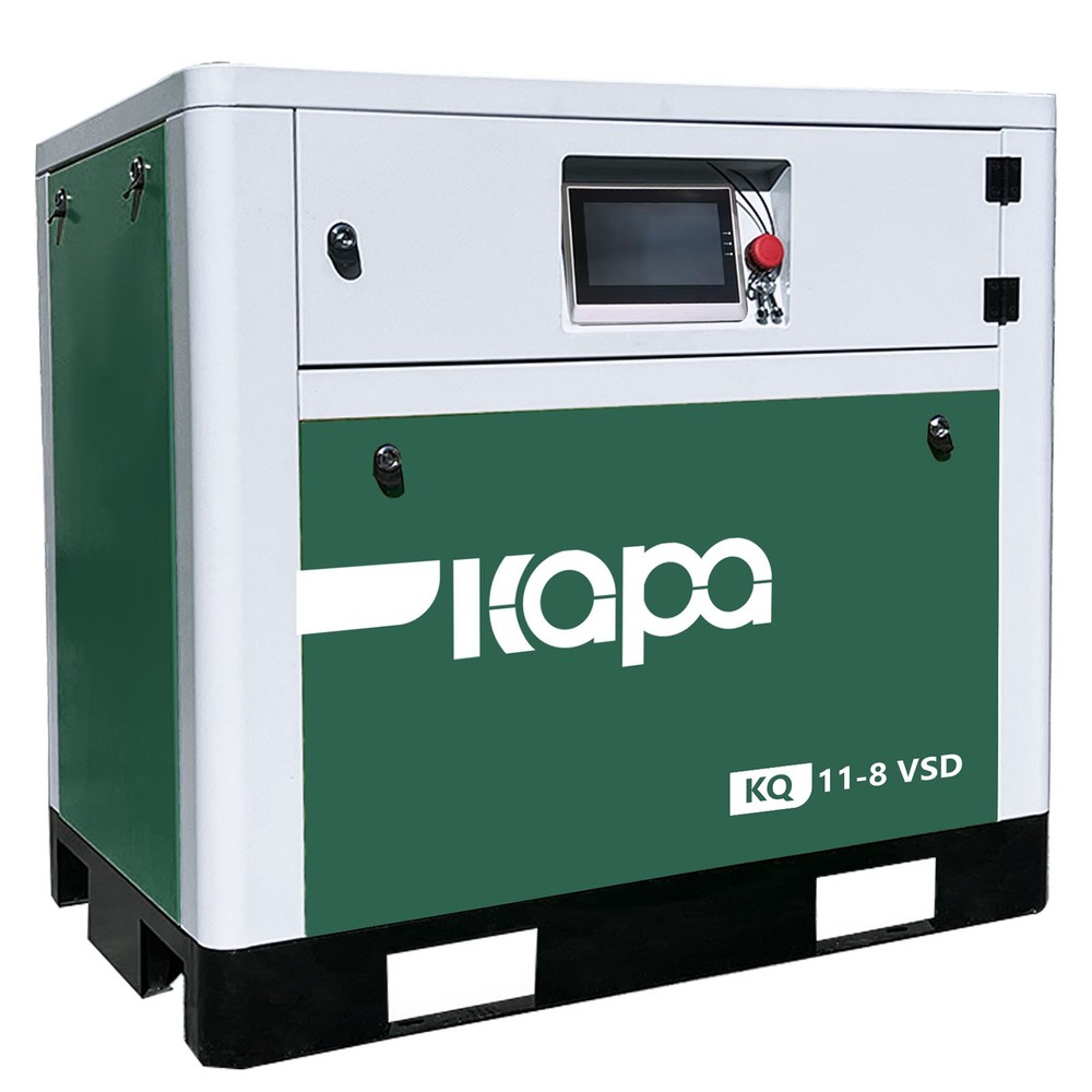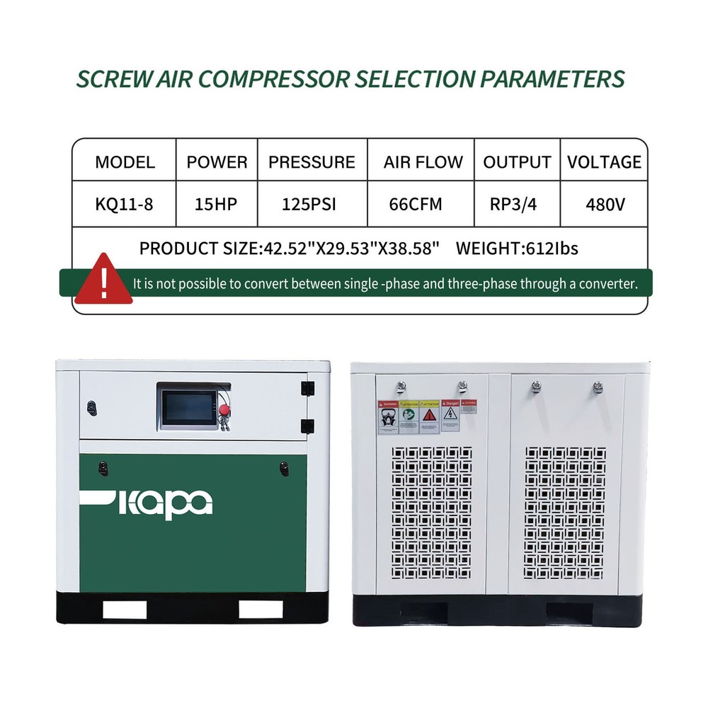 Home Payment Shipping Return Policy About Us Contact Us Feedback Store Categories Three-phase screw compressor VSD Rotary Screw Compressors RotaryScrew CompressorW/Tank Laser Cutting Air Compressor Portable air compressor Large industrial compressor Oil-free screw air compressor AirCompressorReplacementPart Consumables, engine oil Refrigerated air dryer High pressure air compressor Other 15 HP VFD Rotary Screw Air Compressor 120PSI 460V 3 Phase 20.59A 66CFM 15 HP VSD VFD Rotary Screw Air Compressor 120PSI 460V 3 Phase 20.59A 66CFM Power: 11 kW/15HP Exhaust pressure: 116-125psi Exhaust volume: 66CFM Voltage: 460V- 480V / 60Hz / 3Phase Noise level: 68 dB (A) Outlet diameter: RP3/4 Rated speed: 2940 r/min Packing size: 48*33*43 inch Packaging weight: 710 ibs This Compressor Is Suitable for Three-phase Power Only. 🚫 Warning: This Unit Cannot Be Operated with a Single-phase to Three-phase Converter Application range: mold industry, light and heavy industry, mining, hydropower, seaports, engineering construction, oil and gas fields, railways, transportation, auto repair, electronics industry, power industry, machinery industry, petrochemical industry, food industry, printing industry Easy for Maintenance: All components are easily accessible for fast easy maintenance. Annual maintenance operations only include changing the filters and oil at predetermined intervals. Inexpensive parts and oil combine with long operating intervals to deliver significant savings over the life of the machine. Standard Warranty: KAPA products enjoy a 1-year warranty on the entire machine from the date of purchase. We will not provide free repair services for machine damage caused by installation errors, incorrect use, poor oil quality, maintenance errors, and the use of non-original accessories Regular maintenance interval schedule: Every 50 hours or weekly --- Check oil level. --- Check intake filter, if necessary clean it. --- Drain condensation water from oil tank. Every 500 hours --- Check and adjust belt tension if necessary (belt driven only) Every 2000 hours --- Replace lubricants (for mineral lubricants oil) --- Replace oil filter. --- Replace intake filter Every 4000 hours --- Replace lubricants (for synthetic lubricants oil) --- Replace oil separator --- Clean cooler for dirt Brand KAPA Rated Horsepower 15 hp (11 kW) Rated Voltage 460 V, 480V Current Phase 3 Phase MPN Does not apply Airflow Volume (CFM) 66cfm Maximum Pressure 125PSI Air Tank Capacity Tankless Function VSD Motor Horsepower 15 Power Supply Electric
