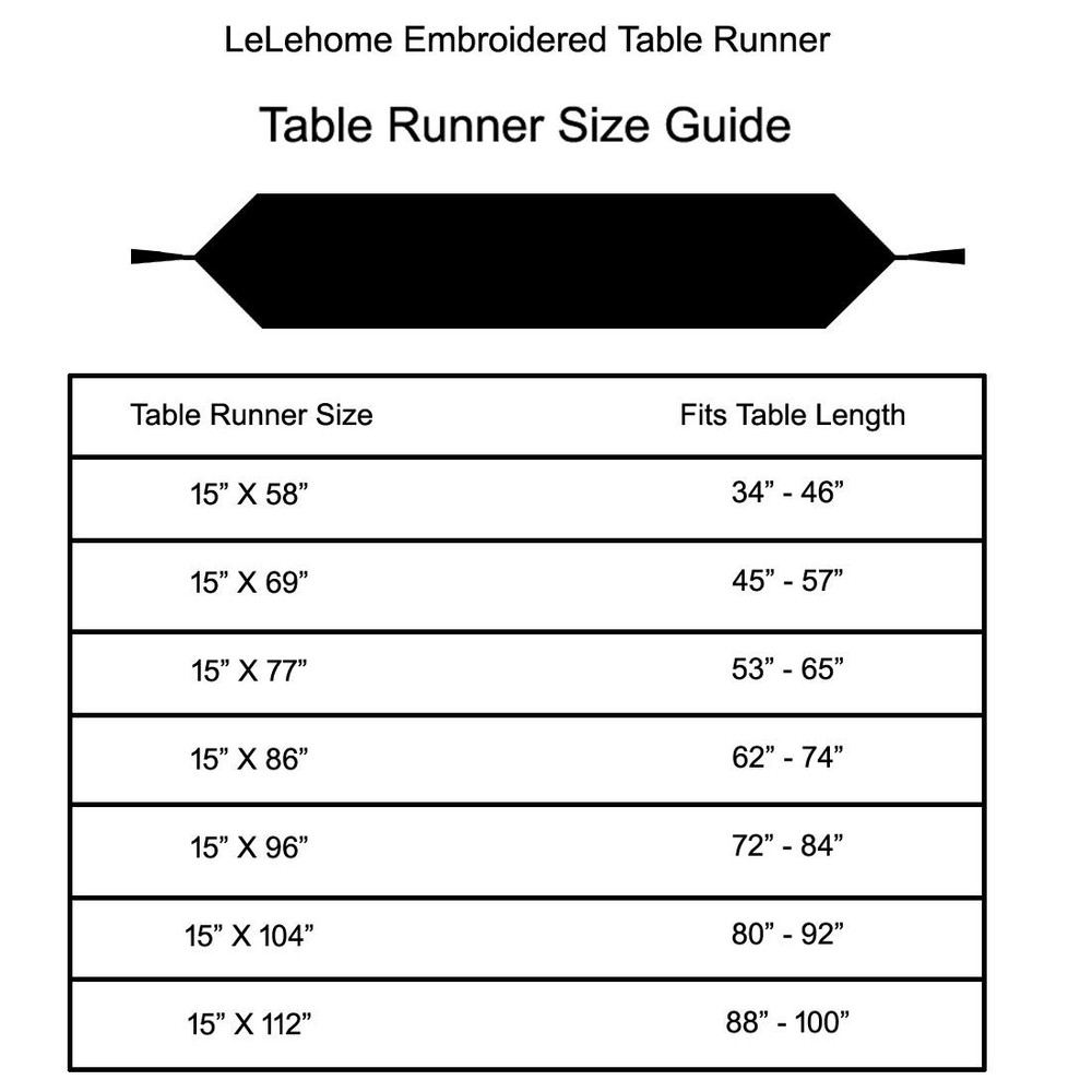 NOTE: Please select a length that approx. 12 - 24" longer than your table so there would be some hanging over on each side. Material:Polyester Machine washable. The steam iron can be used to get wrinkles away.(Shipment fold flat, wrinkles exist.) It's Perfect tabletop décor for your wedding, baby shower, birthday party or any dinner event. Use our table runner center lengthwise on your dining table to bring fall joy to mealtime! We insists on the best quality and price for every single product, meanwhile we promised our best service for every single customer. If you have any question or suggestion, please do not hesitate to contact us by mail. Washing Instruction: Machine washable in cold water and gentle cycle, tumble dry, please do not bleach. 【Table runner length = Table length + 12"~24"】 Our table runners are available in various sizes, colors and patterns to suit your different needs and help you get ready for the numerous warm end of year celebrations. Package Includes: 1 X Table runner. * Chair covers, table cloth and other accessaries shown in the picture are not included. This is a 15 X 58 Inches table runner, suitable for the table service for 2 - 4 people. Please measure your table before purchasing the table runner. Choose a table runner longer than your table. Made of high quality polyester. It is a spill-proof and stain resistant table runner, easy to clean. The color will not fade after washing.