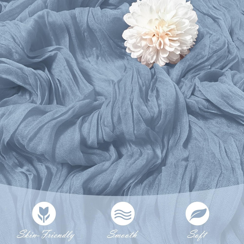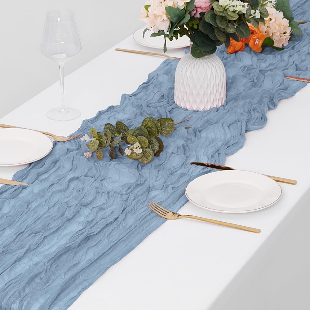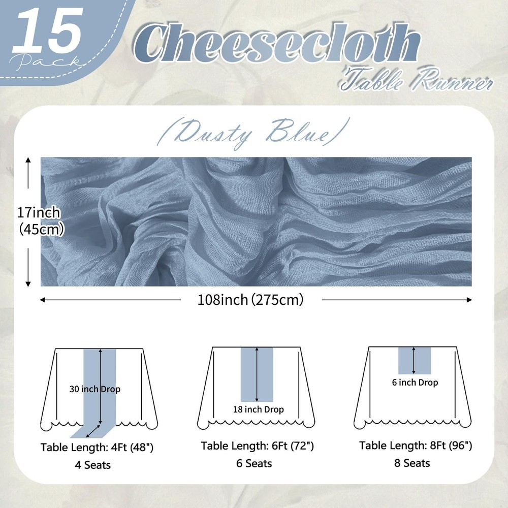Dusty Blue Cheesecloth Table Runners Product Information Package includes: 15 packs cheesecloth table runners Color: Dusty Blue Material: High Quality Polyester Fiber Boho Rustic table runner dimensions: 17 inches*108 inches Cheese Cloth Table Runner Features: 1. Our Boho Gauze Cheese Cloth Table Runner is made of 100% high-quality gauze. The gauze table runner has beautiful pleats, exquisite craftsmanship, neat lines, and beautiful appearance. 2.Our cheesecloth table runner is very elegant. Even if placed randomly on the table, it will bring a lazy decorative aesthetic, saving you energy and patience. adding a romantic atmosphere to your wedding or special event, elegant and dreamy. 3.If it is dirty after use, you can hand wash it with a mild detergent in cold water. Please use a laundry bag if machine washing, lay flat or hang to dry. Widely Use: perfect for weddings, parties, baby showers, woodland baby showers, hunting baby showers, arch curtains, Easter, Christmas, birthdays or any other event you want to celebrate, adding a romantic touch and creating a warm party atmosphere. Tips: 1. Don’t bleach and twist it, and please don’t dry it in direct sunshine, or it maybe will fade. 2. There may be slight errors in size due to manual measurement. 3. Our table runners are all taken in kind, and the pictures have been color corrected and adjusted. However, please allow slight color differences due to different screens and light. Everything is subject to the actual product. Please forgive me. Excellent service: We always put customers' needs first and provide customers with high-quality products and good services. If you have any questions, please feel free to contact us and we will provide you with answers 24 hours a day. Whether it is consultation before purchasing,or any dissatisfaction caused by any reason after receiving the product, we will definitely solve it for you until you are satisfied. Package Included: You will get 15 pack of dusty blue cheesecloth table runners, enough to meet your daily use and replacement needs. The size of each cheese cloth table runner is about 17 x 108 inches, it's long enough to fit different size tables and chairs. A variety of colors for you to choose from, perfect for weddings and parties, adding a romantic atmosphere to your occasion Premium Material: Our cheese cloth table runners are made from premium gauze table runner and crinkle gauze fabric. The dusty blue table runner with beautiful wrinkles, soft to the touch, reusable, washable and fade-resistant. This boho gauze table runner is translucent and drapes naturally, perfectly and elegantly placed on a table or hung from the floor Perfect Looking: This rectangular natural pleated table runner has a rustic elegant look and is lightweight and easy to store. Cheesecloth table runner are an easy way to add texture to your table decor. These cheesecloth table runners pair well with flowers or a variety of plants to add a touch of romance and elegance to your event Widely Use: These romantic table runners have a rustic yet elegant look that is suitable for most occasions. It's a great choice for your home decoration and perfect for weddings, parties, arches, tables, birthday backdrops, Christmas, baby showers, etc. Add a romantic touch to your event and create a warm party atmosphere Notes: The vintage wedding table runners are recommended for machine washable in a laundry bag or hand wash in cold water. Do not bleach or soak for too long, which is better for maintaining the long-term use of these cheesecloth table runner. Due to manual measurement, please allow slight deviation in product size