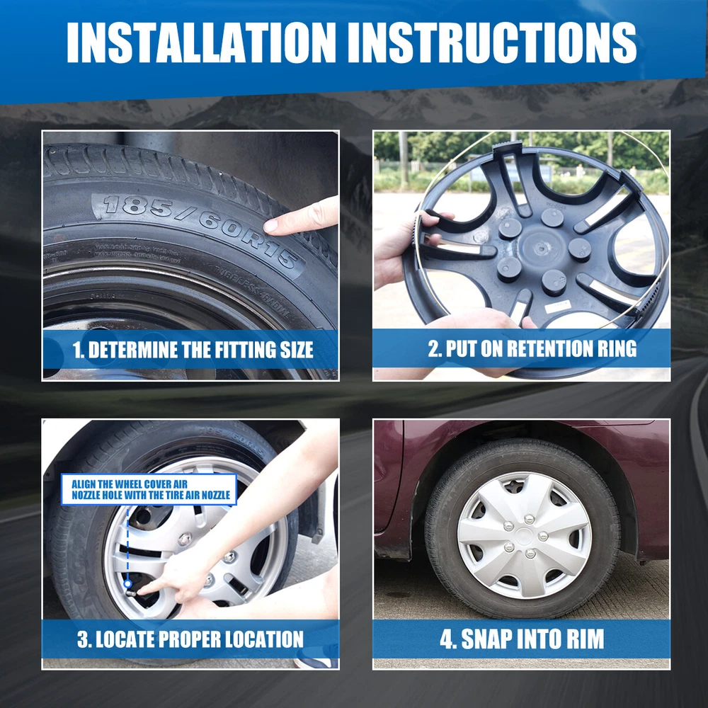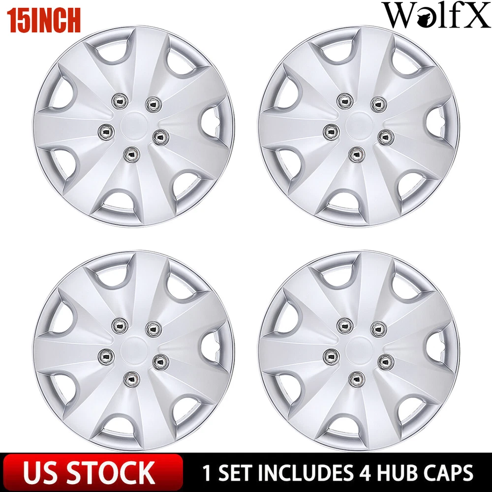 15" Set of 4 Silver Wheel Covers Snap On Full Hub Caps fit R15 Tire & Steel Rim Feature: π Please ensure to check your tire/wheel size before purchase! designed for (p15) 15" stock steel wheels and will not fit over aluminum alloy wheels. π Designed from oem replica style wheelsβ for replacement with fast & easy snap-on installation - made from premium abs material β lab & road tested for performance and ultimate durability. π Adjustable retention rings assures firm grip gives support to the hubcaps making sure they stay in place. locate the curve on the retention ring and match to the tire air valve to install. π Installation instructions available - please refer to the images available as well as detailed instructions below for assistance. π Wolfx wheel covers fit most models of vehicle brands including acura, chevrolet, dodge, ford, honda, hyundai, kia, mazda, mitsubishi, nissan, subaru, toyota, volkswagen and more. Specification: Type: Hub caps Number in Pack: 4 Color: Silver Material: ABS Compatible Wheel Diameter: 15 in Finish: Glossy Installation Type: Snap-On Model: βUniversal Hubcap for Iron Wheels Package includes: One set of 4 Hub caps and 4 retention rings Payment Delivery details Terms of sales About us Contact us Payment π We accept PayPal (Recommended), credit card, VISA, Google Pay & Discover etc. π Please submit your payment within 7 days after your purchase. π If not, eBay will automatically open an Unpaid Item Dispute on our behalf if the item(s) are not paid within 7 days. Delivery details π Please double check your delivery address and contact information. π All items will be shipped within 1 business days after payment received. π Tracking numbers will be easily accessible ASAP they are created and processed. Terms of sales π Free 30 days Return, we will cover the return post fee. π If a defective product was received, please do not hesitate to message us via eBay message. π We will response in 24 hours in business to resolve the problem π We stand behind our products. Items can be returned for exchange or full refund within 30 days from the date you receive. About us π Wolfstorm has a huge warehouse and office located in the United States. π All US domestic 48 states customers are able to benefit from the FREE SHIPPING services. π Our experienced, professional customer service representatives offers prompt and courteous service. π Best quality products, outstanding services and professional experience keep our customers. Contact us π Please feel free to contact us if you have any problems. π Emails will be replied within 24 hours in working days. π After hours emails will be replied on the next business day. On Jan 4, 2025 at 01:40:16 PST, seller added the following information: