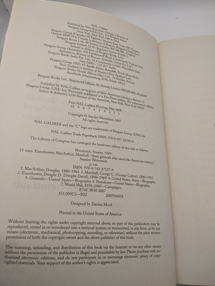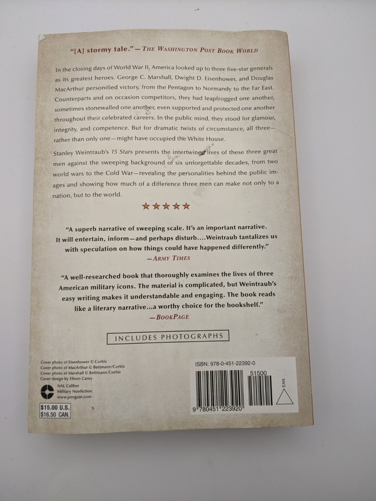 Topic:Military / World War II, Military / Strategy, Military / United States, Presidents & Heads of State, MilitaryISBN:9780451223920Book Title:15 Stars : Eisenhower, Macarthur, Marshall: Three Generals Who Saved the American CenturyPublication Year:2008Item Height:1.3 inItem Width:6 inGenre:Biography & Autobiography, HistoryIllustrator:YesPublication Name:Penguin Publishing GroupItem Weight:21.2 OzPublisher:Penguin Publishing GroupAuthor:Stanley WeintraubItem Length:9 ingtin13:9780451223920Format:Uk-B Format PaperbackNumber of Pages:576 PagesLanguage:English