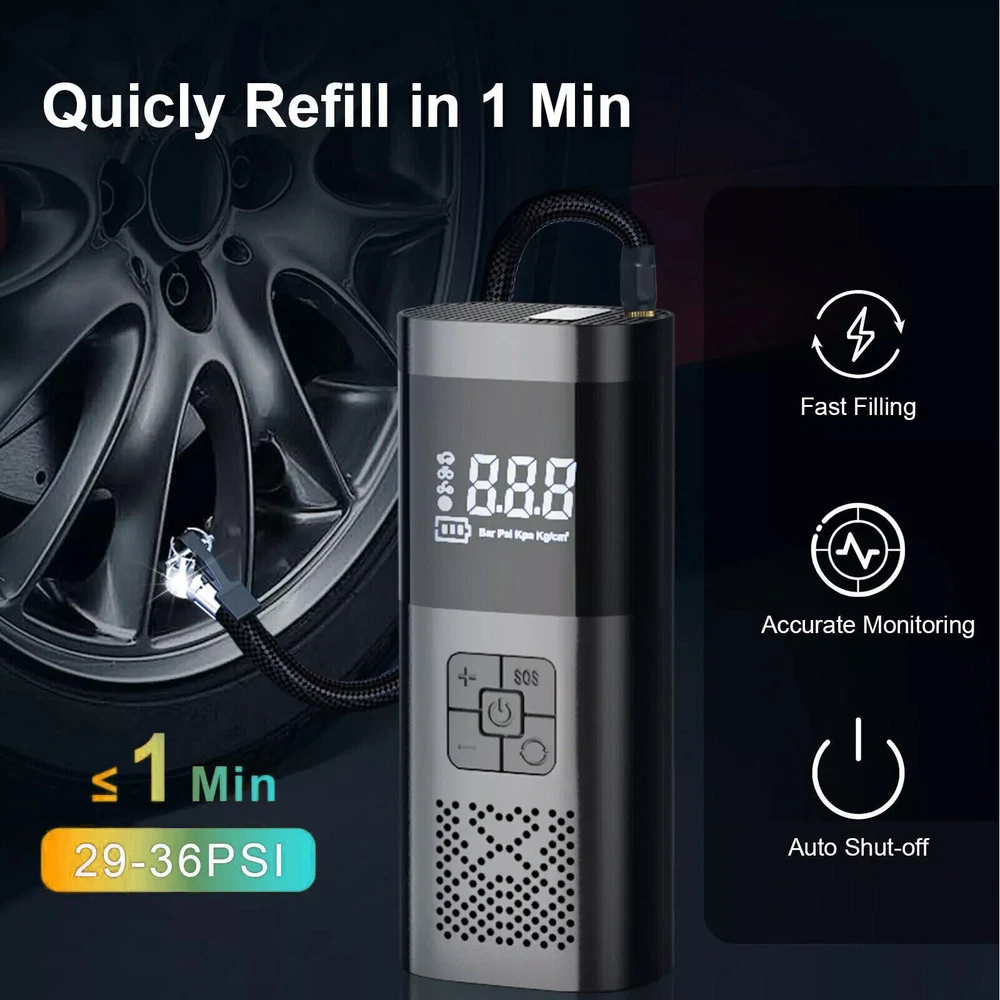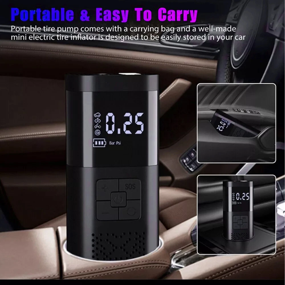 Description Features. 150PSI Smart Air Pump: This practical electric air pump mini inflator has a 150PSI maximum inflation pressure. Plug it into the 12V power outlet in your car and attach the stem to the tire valve. One simple press on the car air compressor and it will do all the work for you. 4 Inflation Modes & Power Prompt: The LCD digital display panel will display 4 kinds of air pressure units "PSI", "BAR", "KPA", "Kg/m²". The digital display panel will have icons such as motorcycles, cars, and balls for selection. The corresponding safety air pressure has been set by default for the type of product. Multipurpose Nozzles: Comes with four different aeration nozzles that can be replaced to charge bicycles, motorcycles, automobiles, air cushions, basketballs, and other products, simple and very convenient. The wired air pump is connected to the power supply through the attached car power cord. LED Lighting For Night Time: Power tire compressor has 3 LED lighting modes (Ordinary White light & Slow frequency warning light& Hazard warning light) for you to use as an outdoor lighting source. It is a helpful companion for emergency or daily use. Easy to operate: After connecting the tire valve, the current tire pressure is displayed, and the tire pressure can be monitored at any time. When the inflation reaches the preset value, the air pump will automatically stop inflation to avoid over-inflation. Portable & Easy To Carry: Portable tire pump comes with a carrying bag and a well-made mini electric tire inflator is designed to be easily stored in your car. Multipurpose Nozzles: Comes with four different aeration nozzles that can be replaced to charge bicycles, motorcycles, automobiles, air cushions, basketballs, and other products, simple and very convenient. The wired air pump is connected to the power supply through the attached car power cord. Specifications. ▪️ Name: Electric handheld inflatable pump ▪️ Material: poly carbon (pc) ▪️ Color: black ▪️ Display: LCD display ▪️ Maximum working pressure 150 PSI ▪️ Product Size: 175*75*55mm ▪️ Cylinder: 19 single cylinder ▪️ Power: 120W ▪️ Rated voltage: 12V ▪️ Function: Inflatable pump, lighting, warning light, mobile power ▪️ Application: cars, bicycles, electric cars, motorcycles, balls, etc. Package includes. ▪️ 1 x Inflator ▪️ 1 x USB Cable ▪️ 1 x Inflator Tube ▪️ 4 x Inflator Adapter ▪️ 1 x Storage Bag Friendly Tips: 1.Due to the light and screen difference, the item's color maybe slightly different from the pictures. Please understand. 2.Please allow 1-2cm differences because of the manual measurement. Payment 1. We only accept payment through Payoneer. 2. Please make sure you have a valid account prior bidding. 3. Please pay for your item within 7 days after you order. Shipping 1. Buyer take responsibility in import / tax cost (not included in item price) 2. Pls contact with us to confirm extra cost if you need to upgrade the shipping option 3. If there's any concern about shipping, pls contact with us for further confirmation Return Policy 1. Refund or Replacement request is available within 30 days after parcel received and returning the item as the same condition as received. Please contact us to request a return authorization. Your name, auction number, and reason for return should be included in the message. 2. All items returned must contain all original packaging materials. Please repack the item carefully. Items returned will be tested and a new replacement will be shipping to buyer punctually. 3. In the event that a suitable replacement is not available then a refund will be issued. Shipping, handling and insurance fees are non-refundable. 4.If the item was found non-defective, the item will be sent back to buyer at buyer's expense. Items returned without authorization will be refused and returned to sender/buyer. 5. Buyer pay the shipping cost if the item damaged artificially, or buyer say "not like it", "size/color was different per they imaginary", etc. Contact us Please contact us via ebay message any time, all questions will be replied within 12 working hours. Customer Support Online : 9:00am - 22:00pm (GMT +8) Everyday