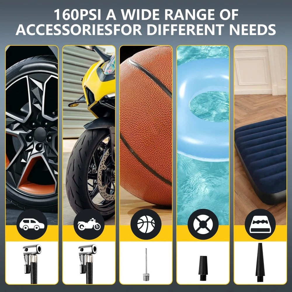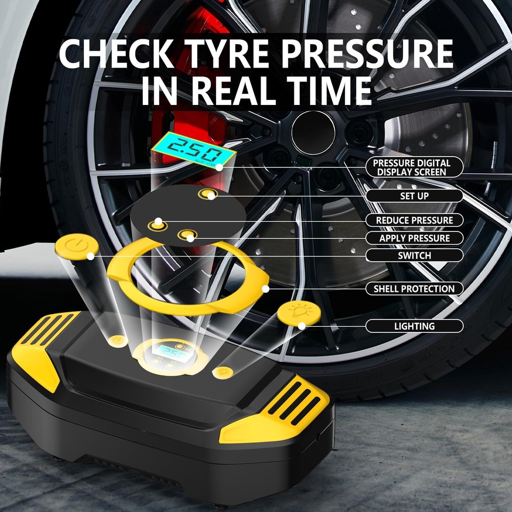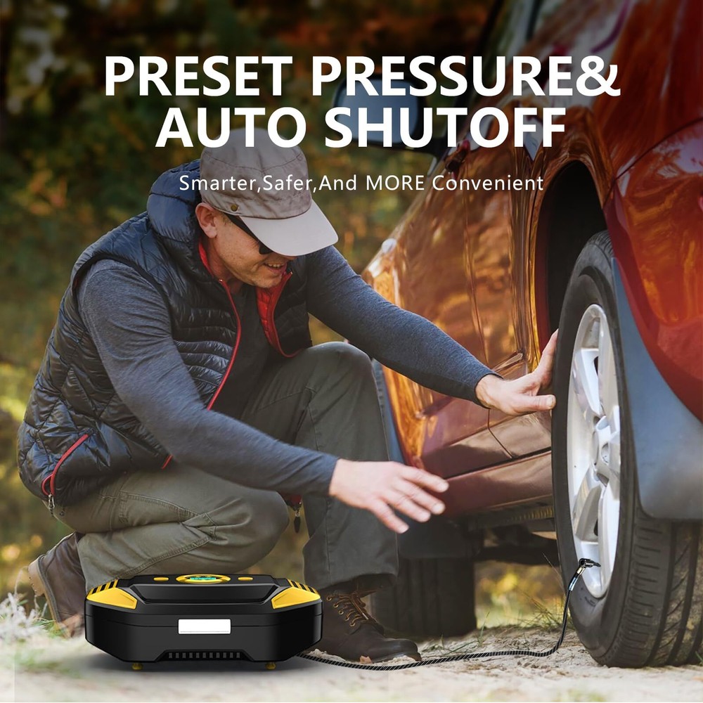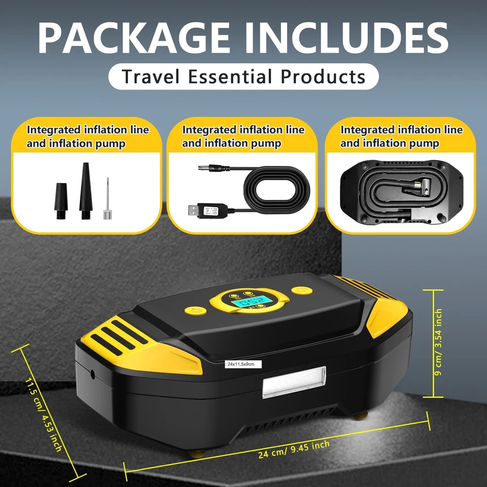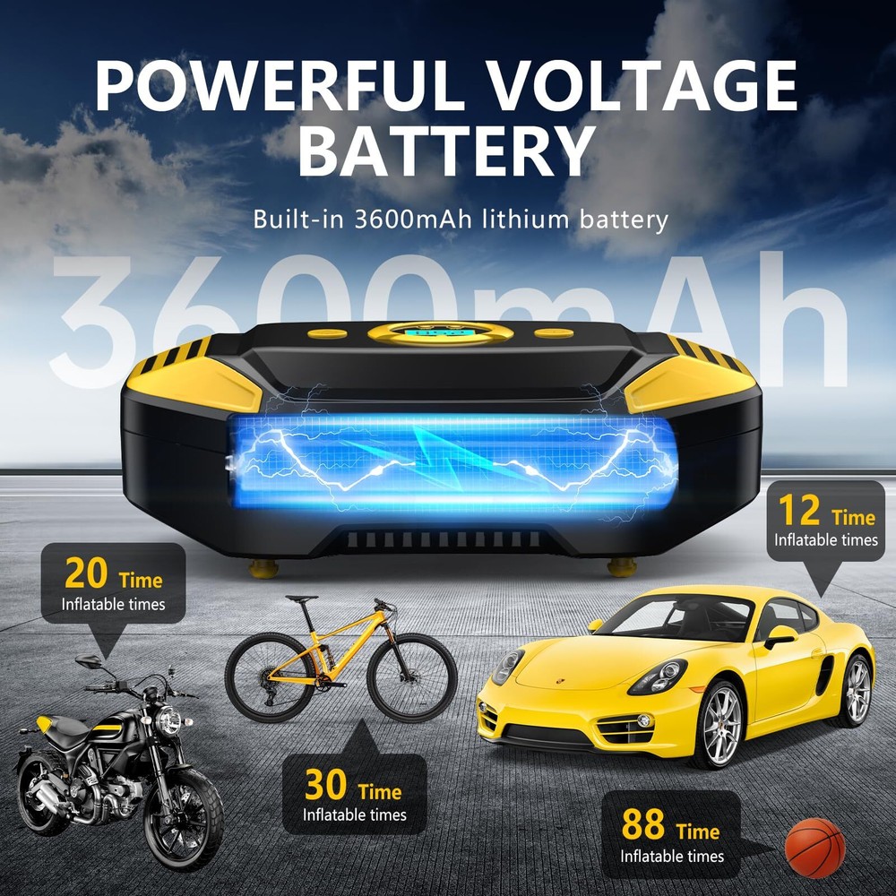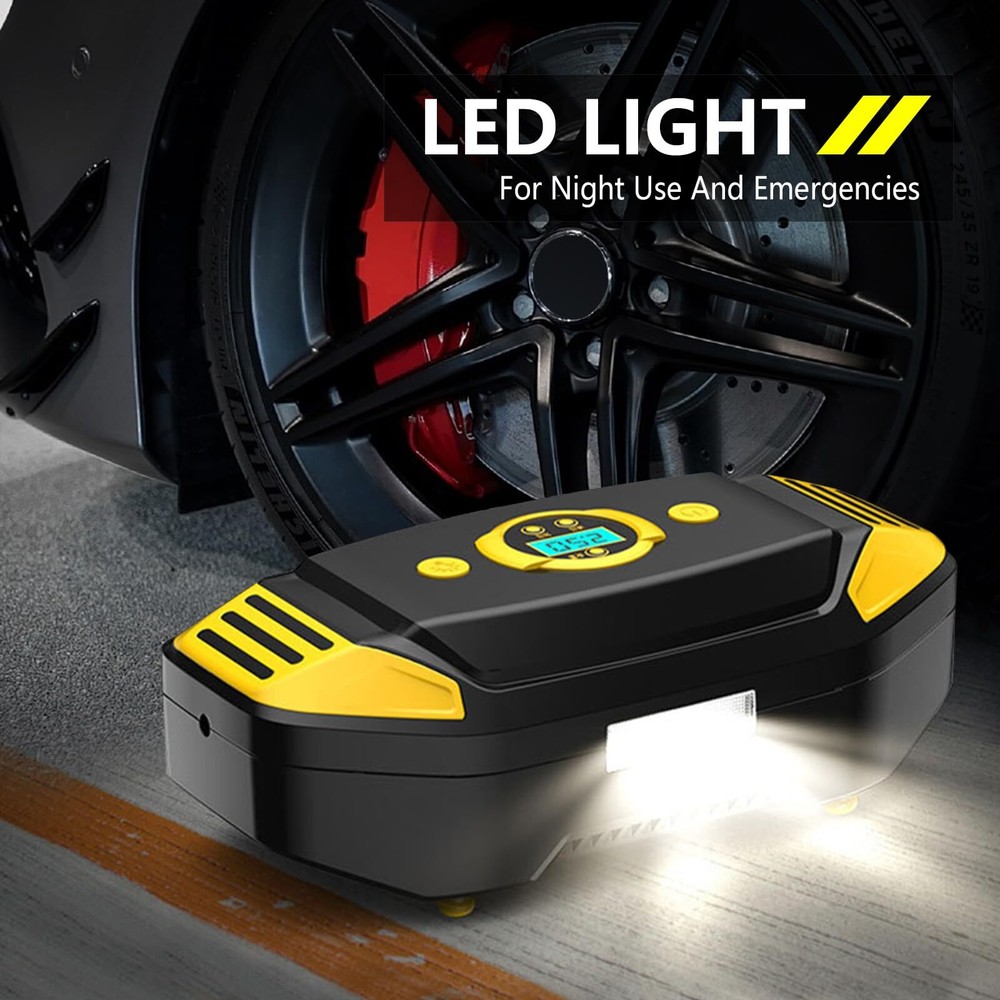 Cordless Tire Inflator Portable Air Compressor 150 PSI, Electric Air Pump for Car Tires, Auto Bike Tire Pump with Digital Pressure Gauge Emergency LED Light Automatic Shut Off for Car Bicycle 【PRESET TIRE PRESSURE, AUTOMATIC STOP】 The tire inflator with gauge is equipped with intelligent tyre pressure detection. The clear digital display accurately shows the detected tyre pressure. The portable tire inflator can also be preset to inflate the tyre pressure. Once the tyre pressure reaches the preset value, the car tire air pump will automatically stop inflating. This makes the operation simple, so you do not need to pay attention to the inflation process in real time. 【FAST INFLATION, MULTIPLE PURPOSE】 The portable air pump has a maximum power of 60W, allowing for fast inflation without any waiting time. It comes with a multifunctional nozzle, allowing you to inflate a variety of items such as cars, buggies, motorbikes, bicycles, balls, balloons, and mattresses. Please note that it is not suitable for inflating trucks or vans. 【METAL AIR CYLINDER AND LED LIGHT】 The car tire inflator also has a built-in LED light, which provides bright enough light for emergency use at night. And the advanced manufacturing process is used to upgrade the metal cylinder block of the product, which can make the inflation pressure reach 150PSI, reduce the noise and heat generated during the inflation process. To prevent the internal cylinder of the product from overheating, please turn off the product after ten minutes of continuous use and allow it to cool for ten minutes to prolong the life of the product. 【PORTABLE AND EASY TO USE】The portable air pump is designed to be lightweight and compact, making it easy to store in glove boxes, Under car seat, trunk , and more. The portable tire inflator is powered by a newly upgraded 7.4V battery, just connect the nozzle to the tire valve, press the power button to complete the inflation. 【PARTS AND SERVICES】Tire Inflator Portable Air Compressor: Lightweight mini air pump, Beautifully gift-boxed with storage bag and fuse.USB-C input port. Your purchase includes a 12-month warranty and friendly customer service. We are dedicated to providing high-quality products and services to all our customers and will do our best to assist you with any issues you may encounter. 【PRESET TIRE PRESSURE, AUTOMATIC STOP】 The tire inflator with gauge is equipped with intelligent tyre pressure detection. The clear digital display accurately shows the detected tyre pressure. The portable tire inflator can also be preset to inflate the tyre pressure. Once the tyre pressure reaches the preset value, the car tire air pump will automatically stop inflating. This makes the operation simple, so you do not need to pay attention to the inflation process in real time. 【FAST INFLATION, MULTIPLE PURPOSE】 The portable air pump has a maximum power of 60W, allowing for fast inflation without any waiting time. It comes with a multifunctional nozzle, allowing you to inflate a variety of items such as cars, buggies, motorbikes, bicycles, balls, balloons, and mattresses. Please note that it is not suitable for inflating trucks or vans. 【METAL AIR CYLINDER AND LED LIGHT】 The car tire inflator also has a built-in LED light, which provides bright enough light for emergency use at night. And the advanced manufacturing process is used to upgrade the metal cylinder block of the product, which can make the inflation pressure reach 150PSI, reduce the noise and heat generated during the inflation process. To prevent the internal cylinder of the product from overheating, please turn off the product after ten minutes of continuous use and allow it to cool for ten minutes to prolong the life of the product. 【PORTABLE AND EASY TO USE】The portable air pump is designed to be lightweight and compact, making it easy to store in glove boxes, Under car seat, trunk , and more. The portable tire inflator is powered by a newly upgraded 7.4V battery, just connect the nozzle to the tire valve, press the power button to complete the inflation. 【PARTS AND SERVICES】Tire Inflator Portable Air Compressor: Lightweight mini air pump, Beautifully gift-boxed with storage bag and fuse.USB-C input port. Your purchase includes a 12-month warranty and friendly customer service. We are dedicated to providing high-quality products and services to all our customers and will do our best to assist you with any issues you may encounter. Shipping from the USA All of our products are shipped from the USA, ensuring quick delivery to your destination. Payment We offer the following payment methods: PayPal, credit card, bank transfer, and eBay's secure payment system. Free Shipping & Free Returns Shipping within the USA is FREE. Additionally, any return is absolutely free for you. Risk-Free Purchase You have the option to return an item within 30 days without any justification. We cover the return shipping costs! Fast Shipping We ship immediately upon receipt of payment. Generally, the package is delivered within 2-3 days in the USA. If it takes longer, we will contact you. Quality and Costs Made in Europe, USA, China No customs fees or additional charges Total satisfaction guarantee Invoice with declared VAT available upon request in .pdf format Feedback Your feedback is very important to us. After you pay for your purchase, you will automatically receive positive feedback from us.