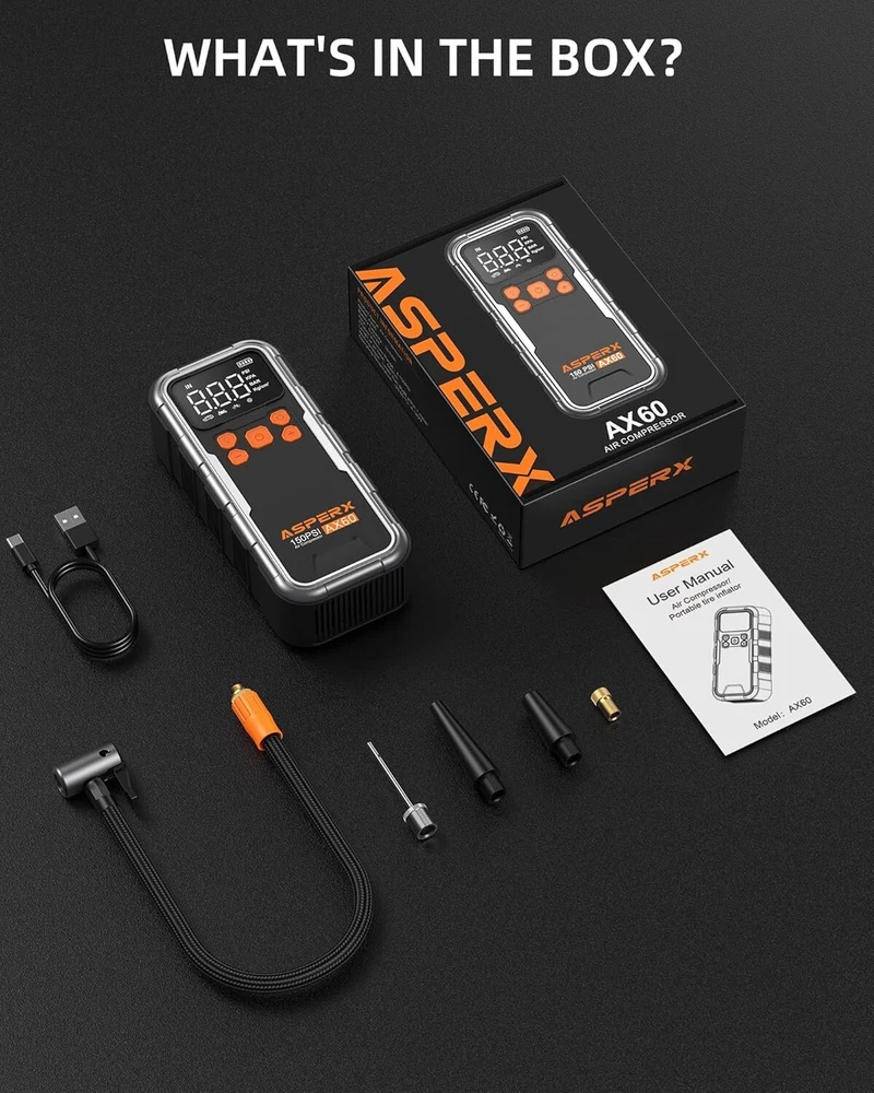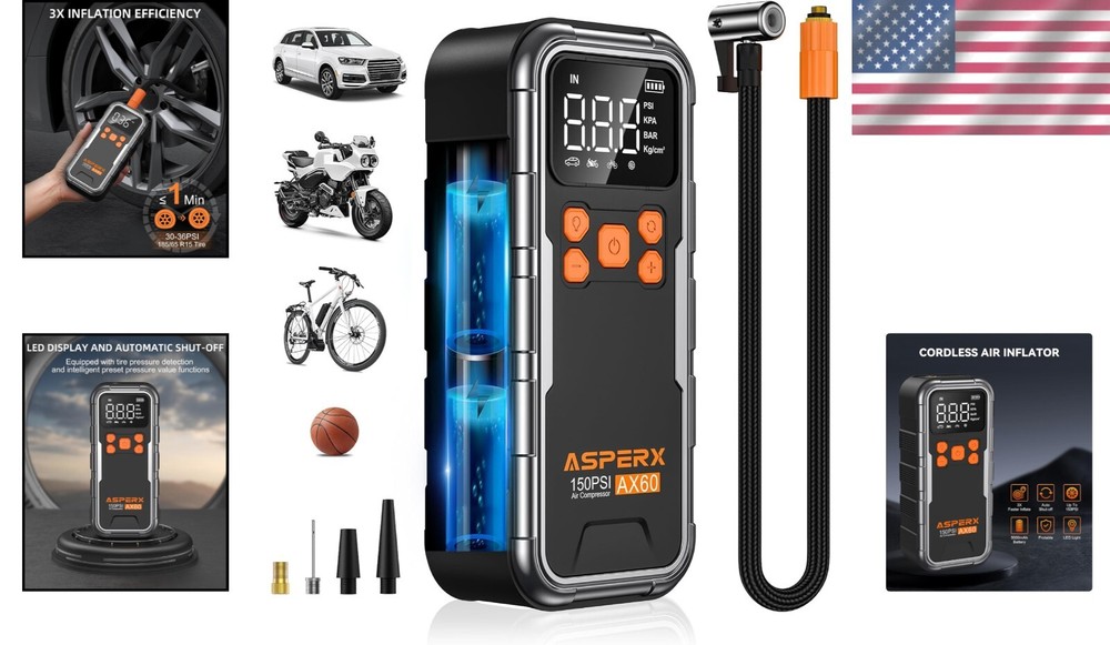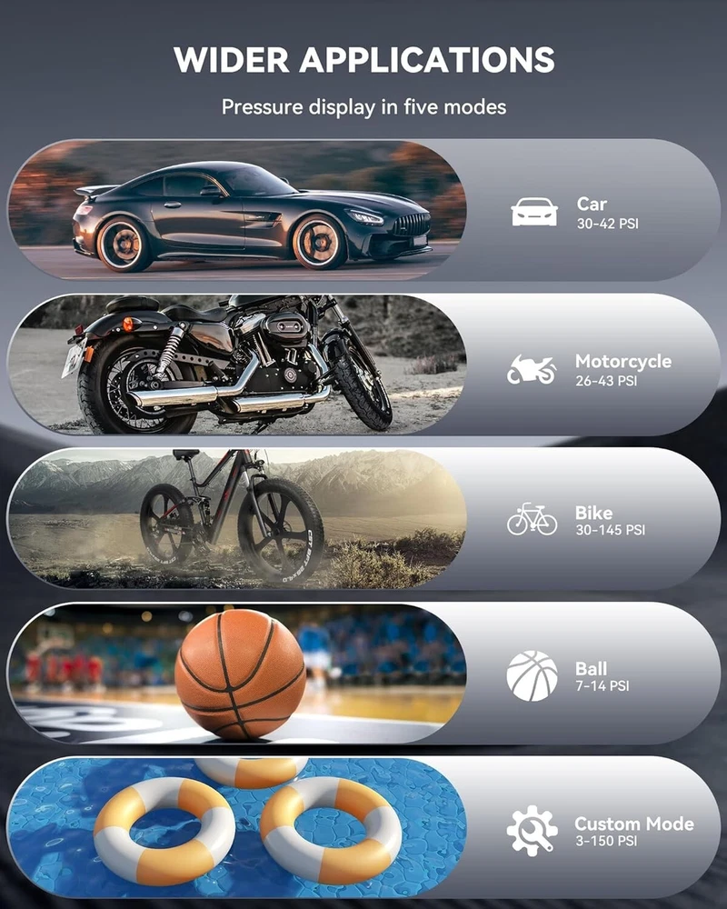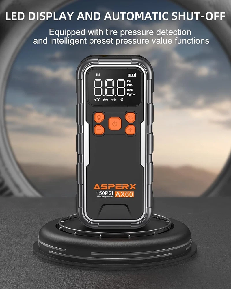 This portable tire pump is a game-changer! It’s fast, reaching 150 PSI with auto shut-off so you never overinflate. Perfect for cars, bikes, or home use, and the compact design makes it easy to take anywhere. The digital display is super accurate, and it topped off my car tire in under a minute. Love how hassle-free it is—just set the pressure and let it do its thing. A must-have for anyone who hates struggling with manual pumps!