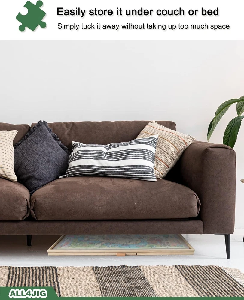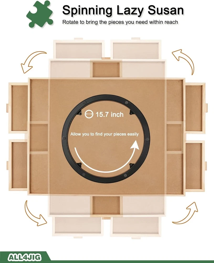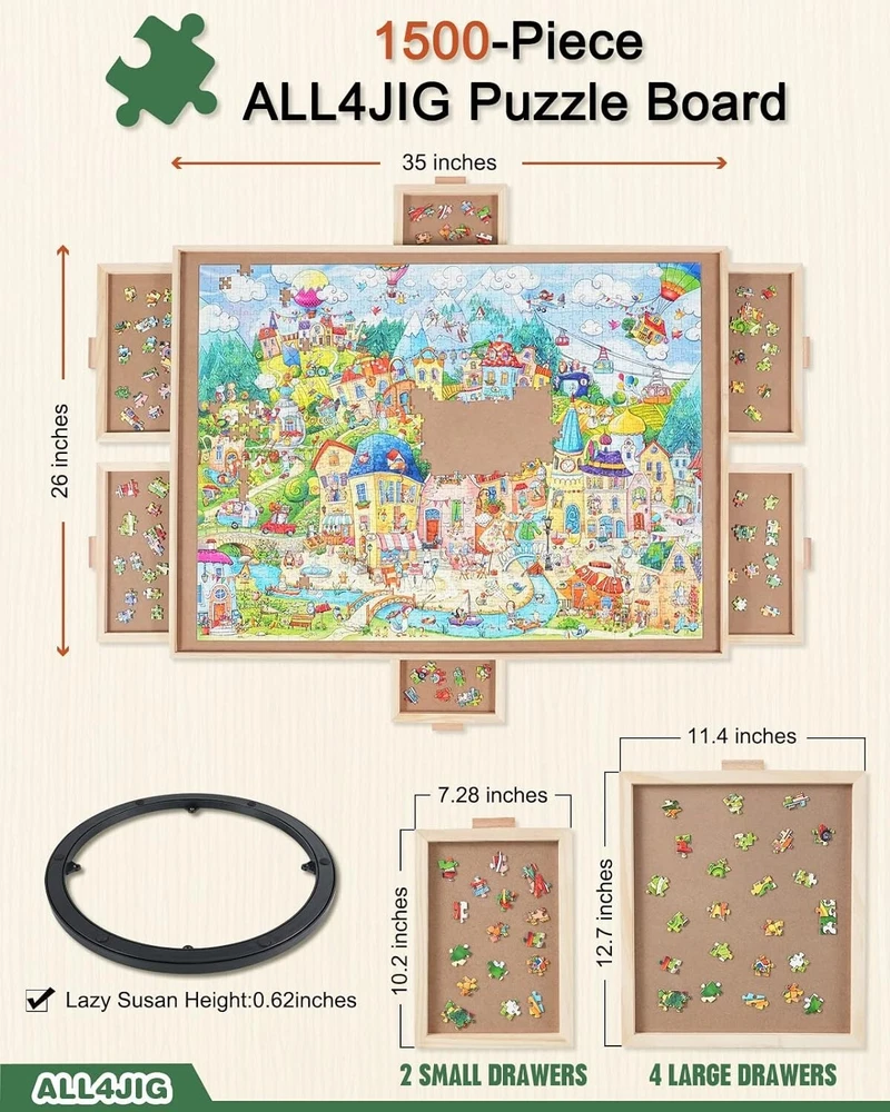 1500 Pieces Rotating Puzzle Board with 6 Drawers and Cover,26"x35"Portable Wooden Jigsaw Puzzle Table for Adults,Lazy Susan Spinning Puzzle Boards Birthday Gift for mom 【High Quality Puzzle Board】Our 1500Pcs most jigsaw puzzle board for puzzle storage is made of premium sustainable hardwood and good manufacturing, durable material ensure long-lasting usage, which is aim to provide the best puzzle table for everyone who love puzzles as we do! Smooth and non-slip surface offer a wonderful area for assembling your favorite jigsaw puzzles with your friends or families. 【6 Drawers & Protective COVER】6 SLIDING DRAWERS allow you to sort your pieces by color, theme or border. Keep them categorized while assembling your drawer is specially designed with Handle, in order to ensure all the drawers are easy opening when using, safely keep the pieces from missing.Featuring a translucent cover to well guard your masterpiece from dust, water and your curious Drt until the next time you’d like to continue. 【Spinning LAZY SUSAN Design】An enjoyable and efficient way to assemble your jigsaw puzzles with our spinning puzzle table. Finding your pieces with ease,reaching to any section you need, Lazy Susan under create a wonderful swivel system for 360°smooth and steady rotation, triple funny puzzling interaction and strategic stimulation. 【5s Easy to Stow Away & Transport Puzzle】Easy lift, lightweight and balanced for quick can place your puzzle table onto any surface, countertops, coffee tables, beach blankets or even the you need an extra space for seating or dining,Just simply cover your puzzle with the puzzle cover,close the drawers and move it away under a couch or bed can your puzzle be well-stored and safely kept easily in a few seconds. 【Ideal Puzzle Gift for Puzzle Enthusiasts】A perfect birthday or holiday gift for teens, seniors or anyone who love puzzles, encourage quality interaction and strategic stimulation while putting together your favorite sorting before solving is your guilty pleasure, stress no more! Add a puzzle spinner to your cart today!