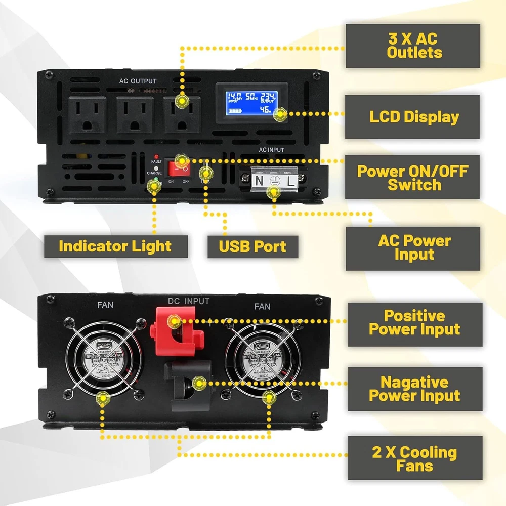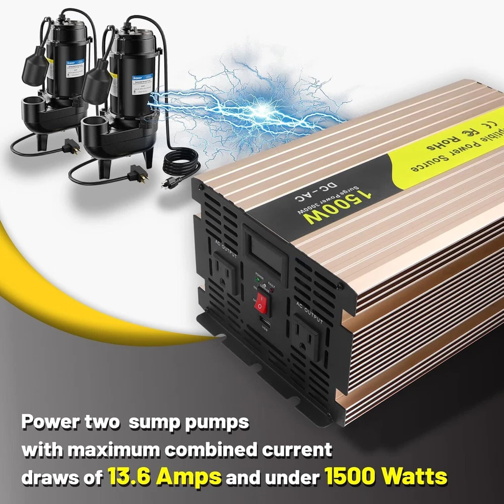 About this item Design for Basement Protection: Miumoon sump pump battery backup system are designed for basements to protect your home from flooding, When the power supply is normal, the pump is powered and charged automatically. When the power supply is cut off, it switches to battery power automatically, ensuring that your sump pump system operates smoothly and continuously. Whether it's a hurricane or heavy rain, the Miumoon sump pump battery backup system can keep your basement dry at all times. Excellent Performance: Miumoon sump pump battery backup system output power is up to 1500 Watt and output current can operate at a maximum current of 13.6 amps, it is easy to running both single and double pump systems, saving you valuable time and cost, Miumoon sump pump battery backup is ideal choice for handling basement sewage, and enjoy a clean, pollution-free environment with ease. Charging mode: 1500W sump pump battery backup system has a built-in 20A battery charger that supports fast charging for various battery types, trickle charging and the unit is suitable for deep-cycle batteries, AGM batteries is recommended and suitable for other deep-cycle battery types, but not for non-deep-cycle batteries. In addition, Miumoon sump pump battery backup have overcharge protection, your battery will not suffer any damage, which greatly extends your battery life. Safety Use: Miumoon sump pump battery backup has a LCD display on side, which allows you to clearly understand the battery and sump pump operating status. Additionally, It also has a built-in cooling system and overload protector, as well as multiple protection functions, including overheat, short circuit, low voltage, overcharge protection, etc., which not only improves the safety of use but also extends the equipment's lifespan. Easy to Install: Miumoon sump pump battery backup system requires no additional wiring, just assemble the AC and DC cable, it is a easy things. Multiple fixation modes, fixed hole on the side allow you flat placement or wall mounting. Miumoon sump pump battery backup system is your smart choice for easy and hassle-free installation